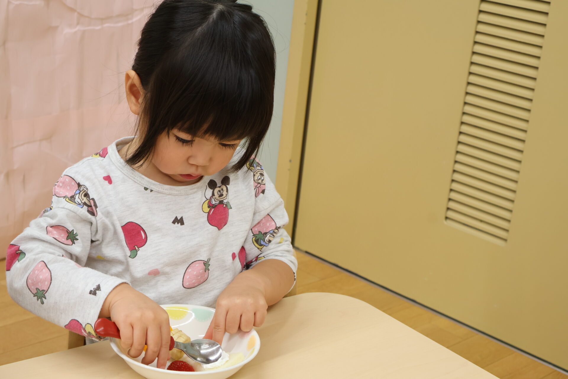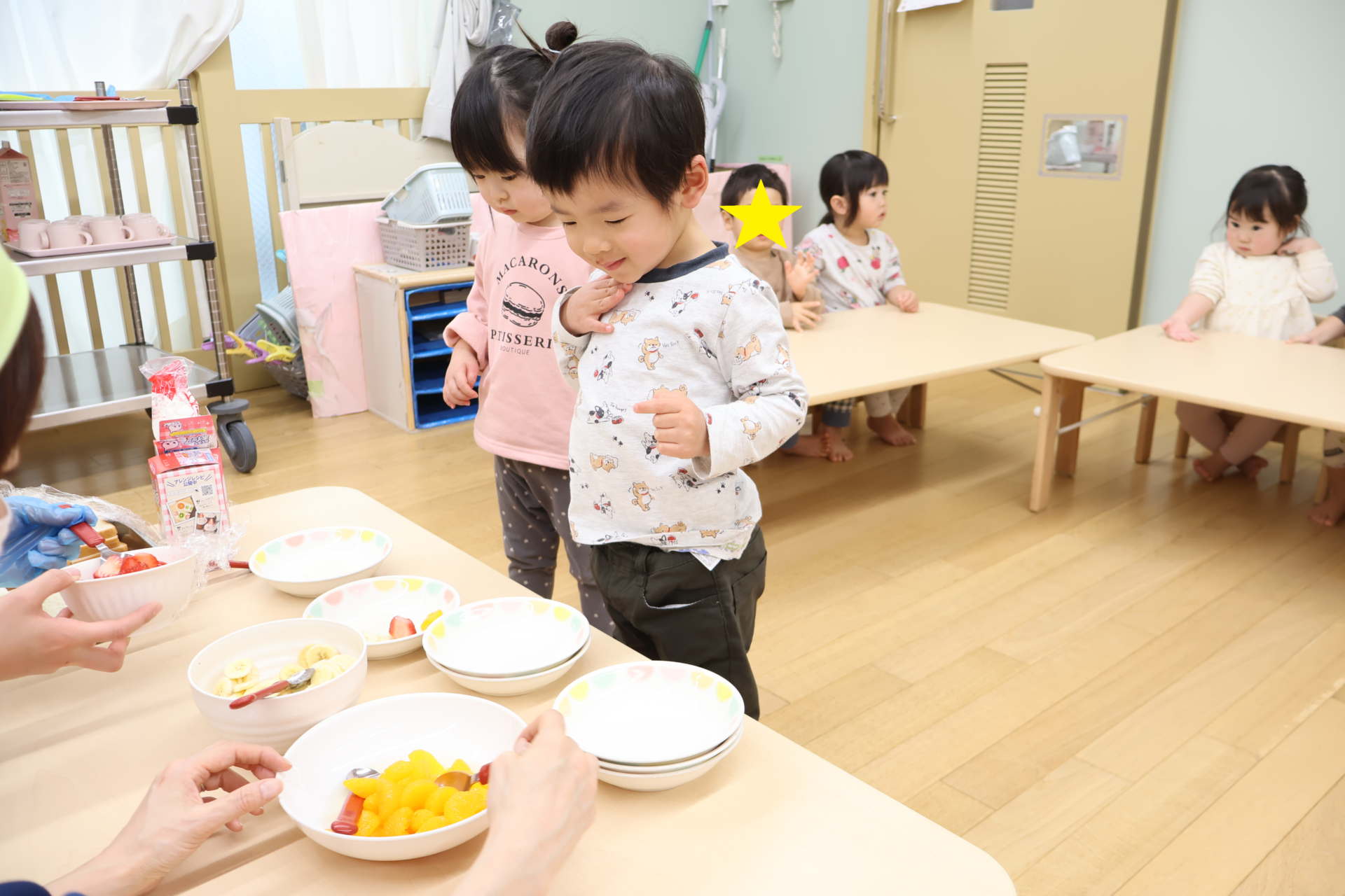保育者がお店屋さんになって、みんなで買ったイチゴ・みかん・バナナ・生クリームの中から子ども達が欲しい物を自分で選びに来て席まで運びます。