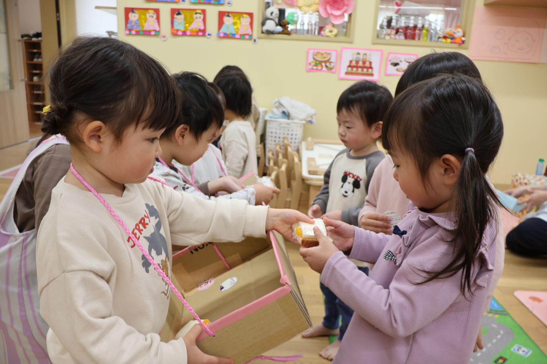 手作りのお金と交換でサンドイッチを全部受け取ってもらえると、「サンドイッチなくなった!」「ありがとうっていってたね~」と嬉しそうに話す子ども達でした💕
