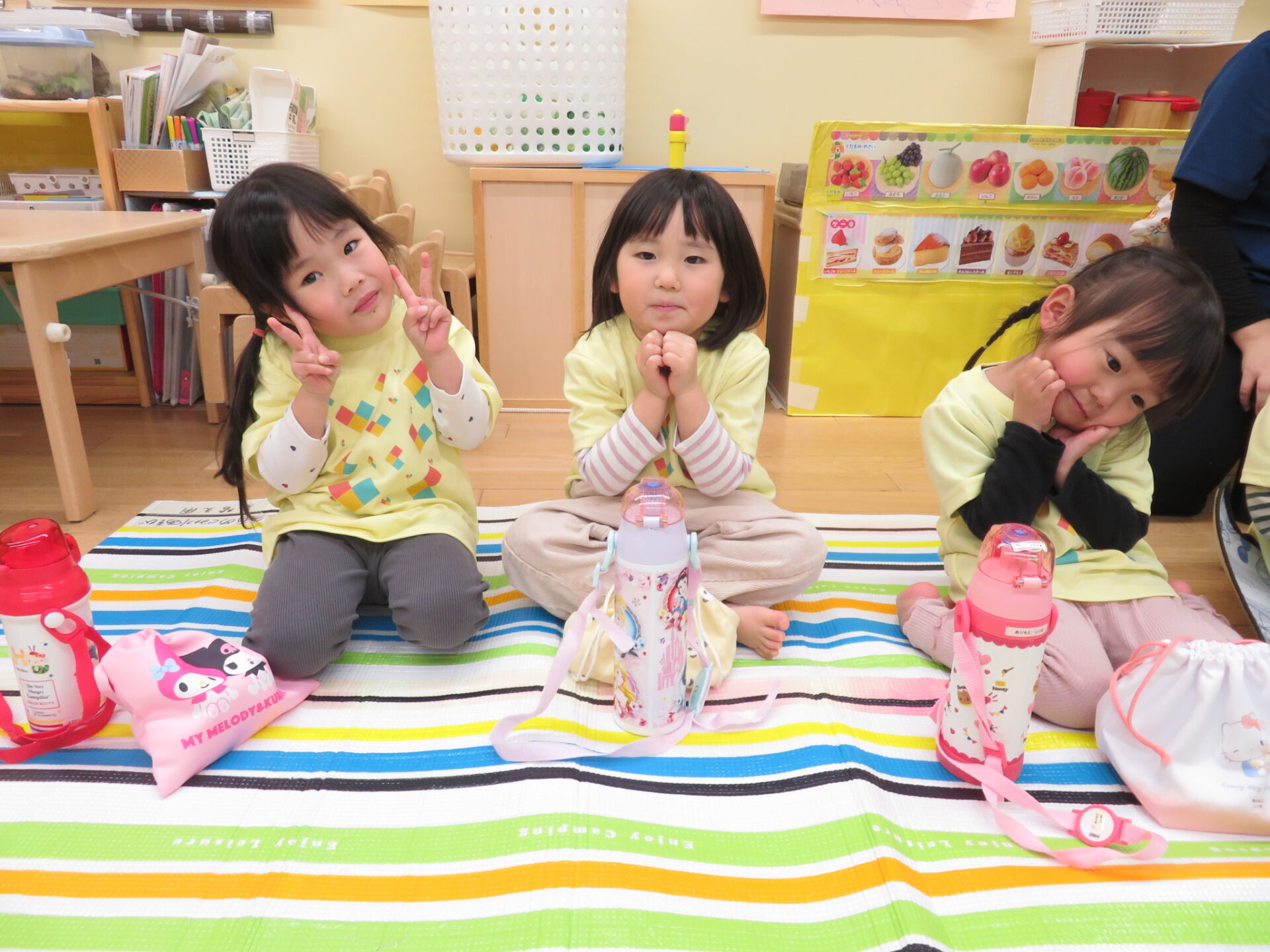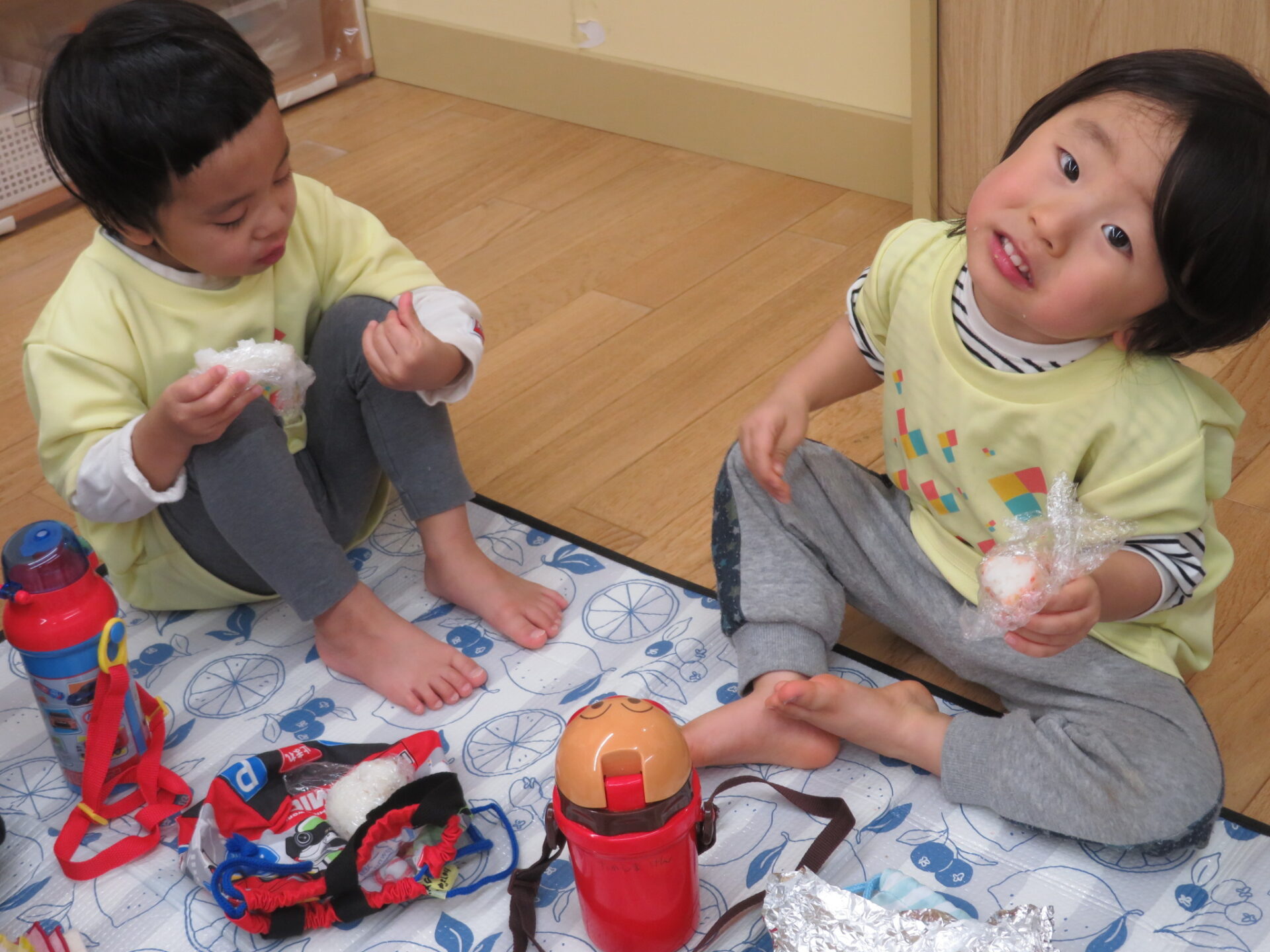 登園してくると嬉しそうにリュックからお家の人が作ってくれたおにぎりと水筒を出し見せてくる姿がとても可愛らしかったです。