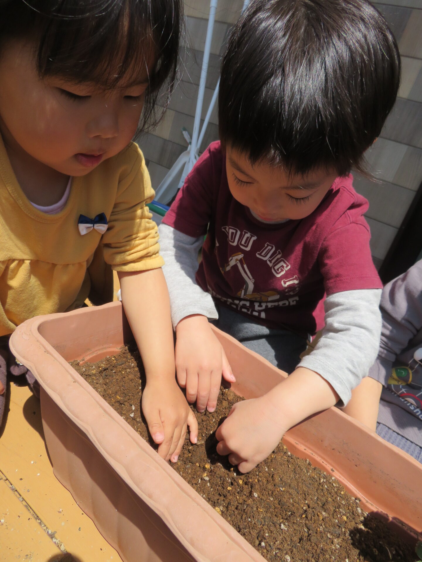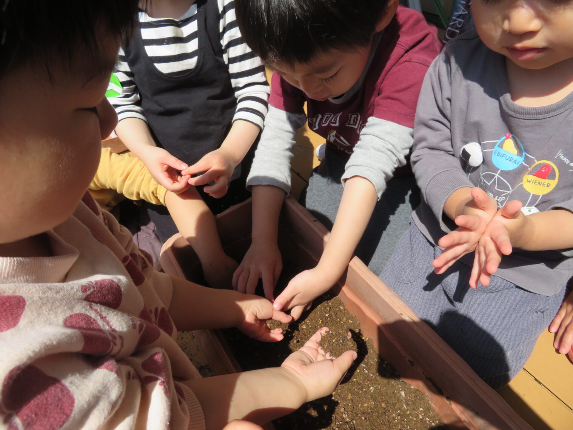 「ふわふわしてるね」「あったかい」と,土の感触を楽しみます。