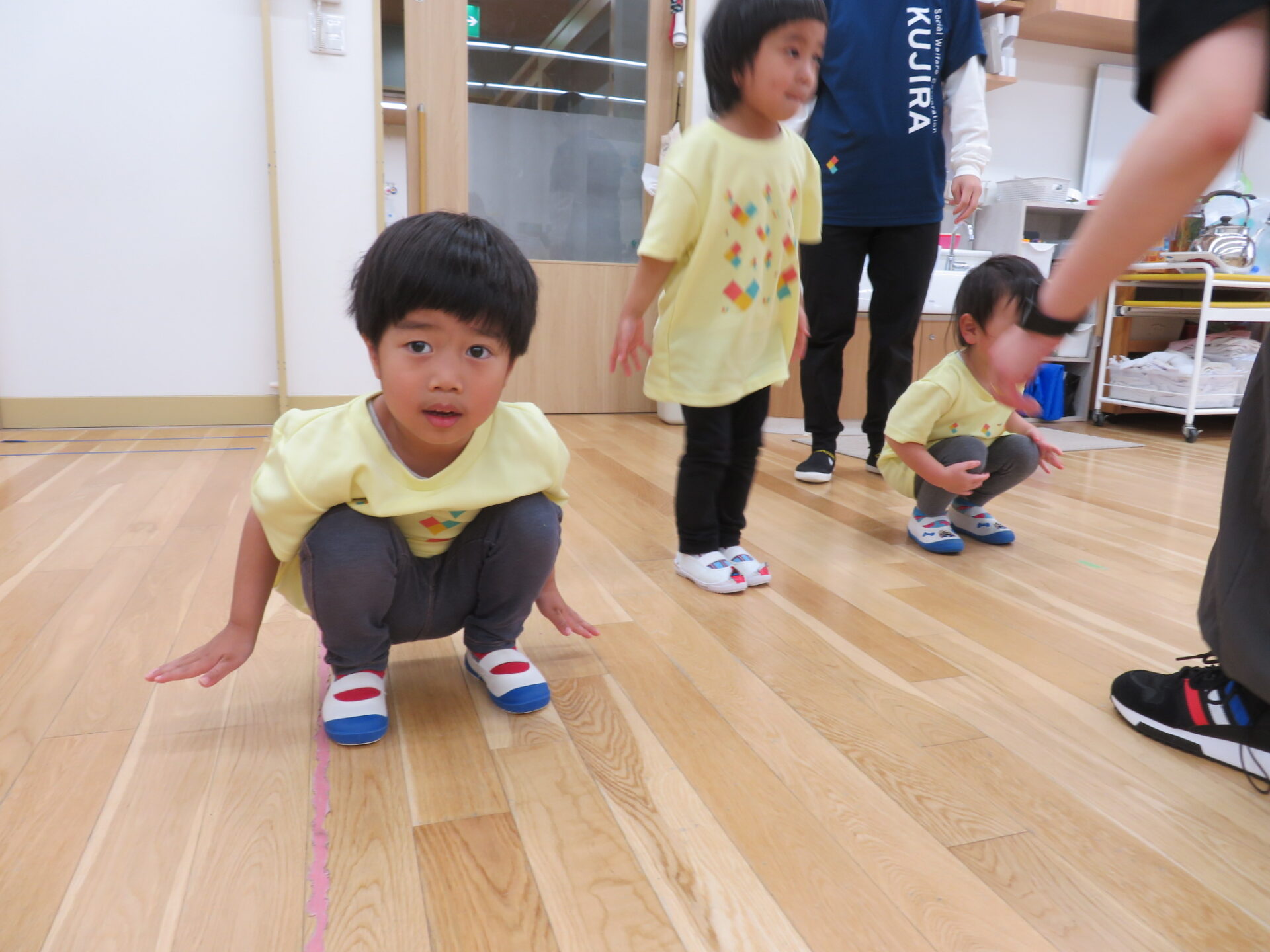 足の裏を床にピッタリとくっつけたまま、お尻をつけずにしゃがむ体勢は「難しい」との事でしたが、3歳児クラスのお友だちはみんな成功しました!