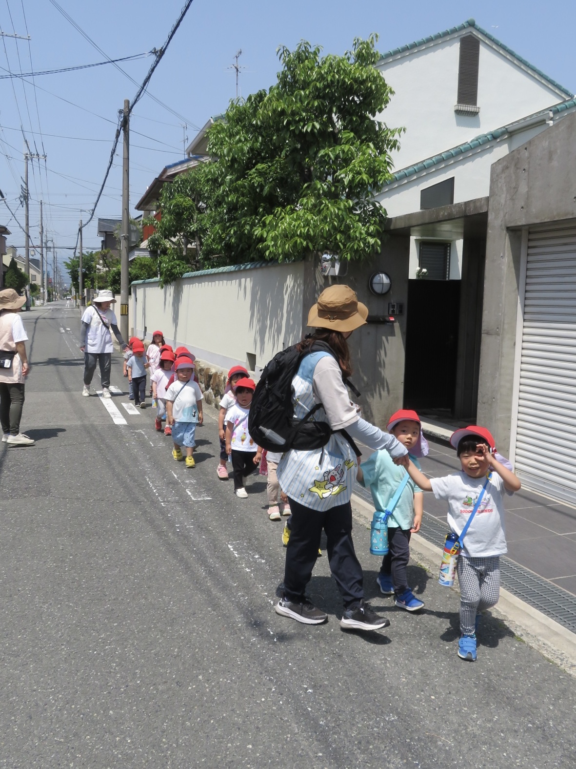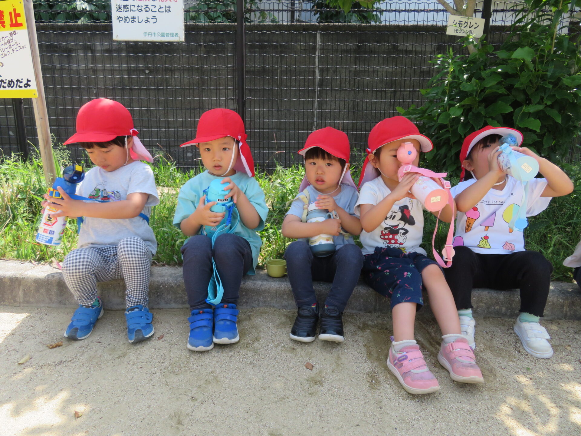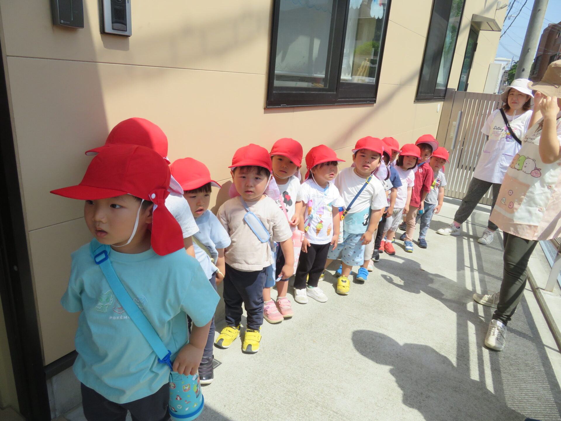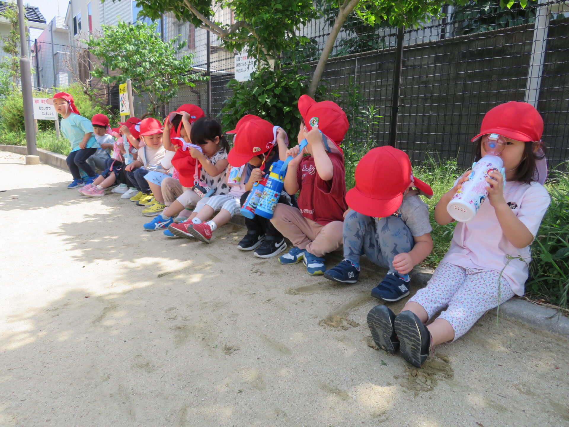 5月から水筒を家庭で用意してもらい、水筒を持ってお出掛けするのも初めてとなります。