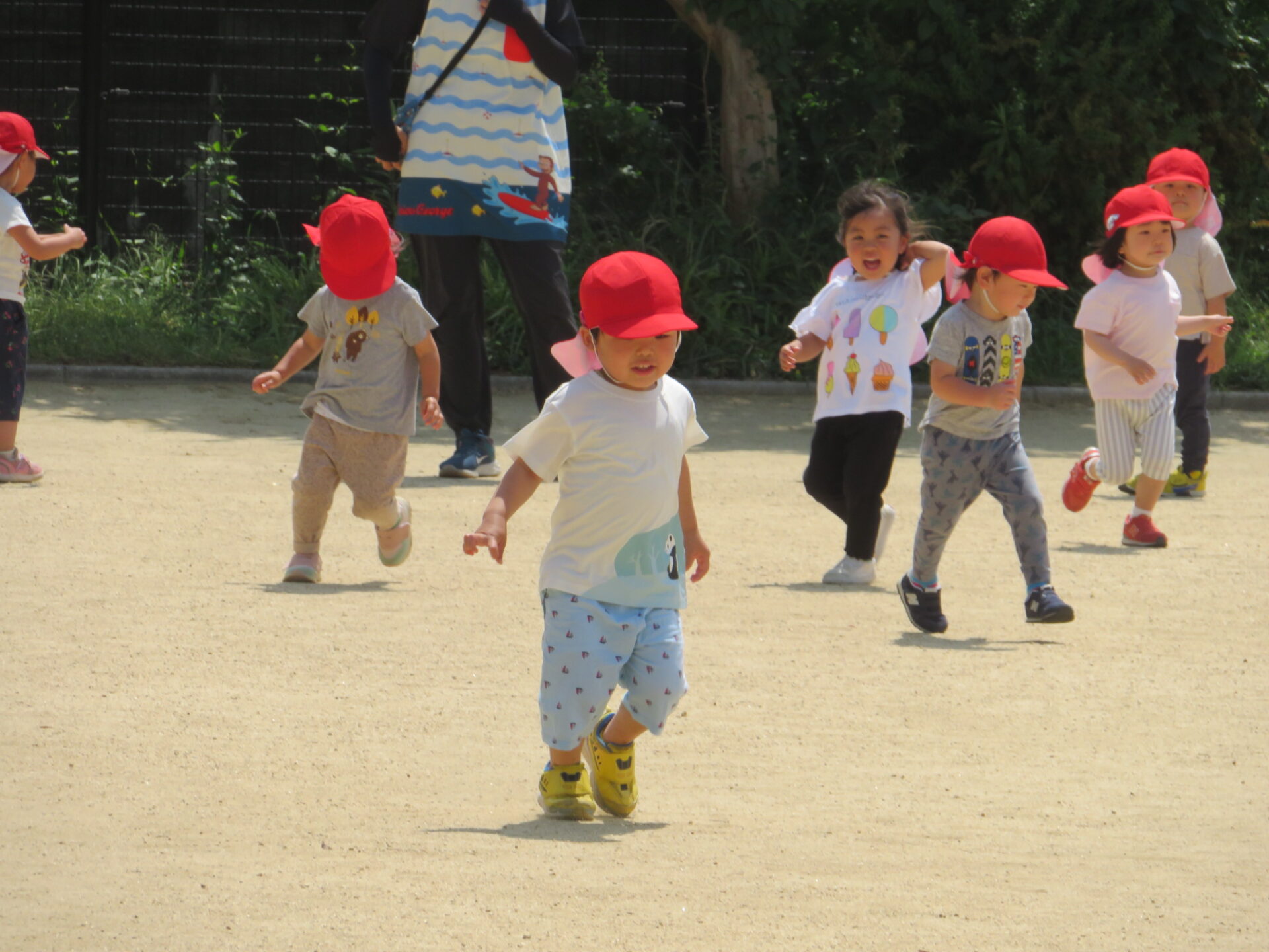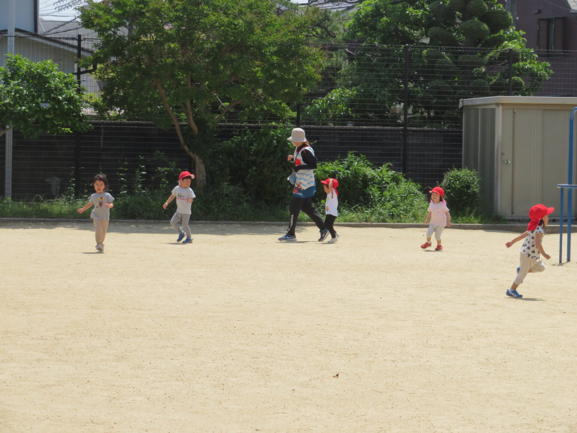 気温が高く暑かった事もあり、遊びの時間は短く設定しましたが、たくさん走って大満足の子ども達でした。