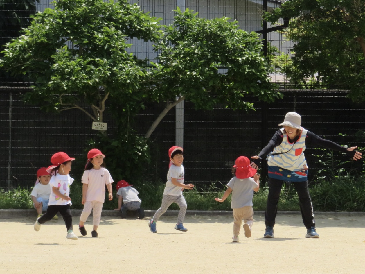 広場では保育士やお友だちと一緒に、追いかけっこをして遊びました。