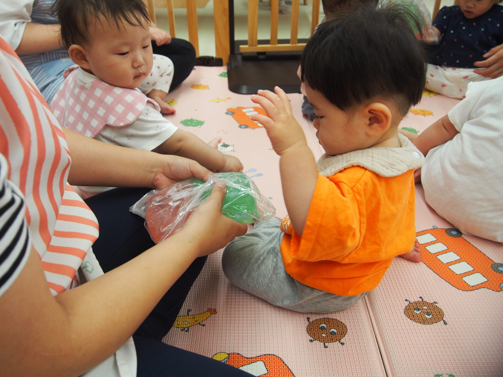 大きくてぷるんとした見た目。「これはなに?」と見つめる子どもたち。少し触ってみるとその気持ち良さに虜になりました。