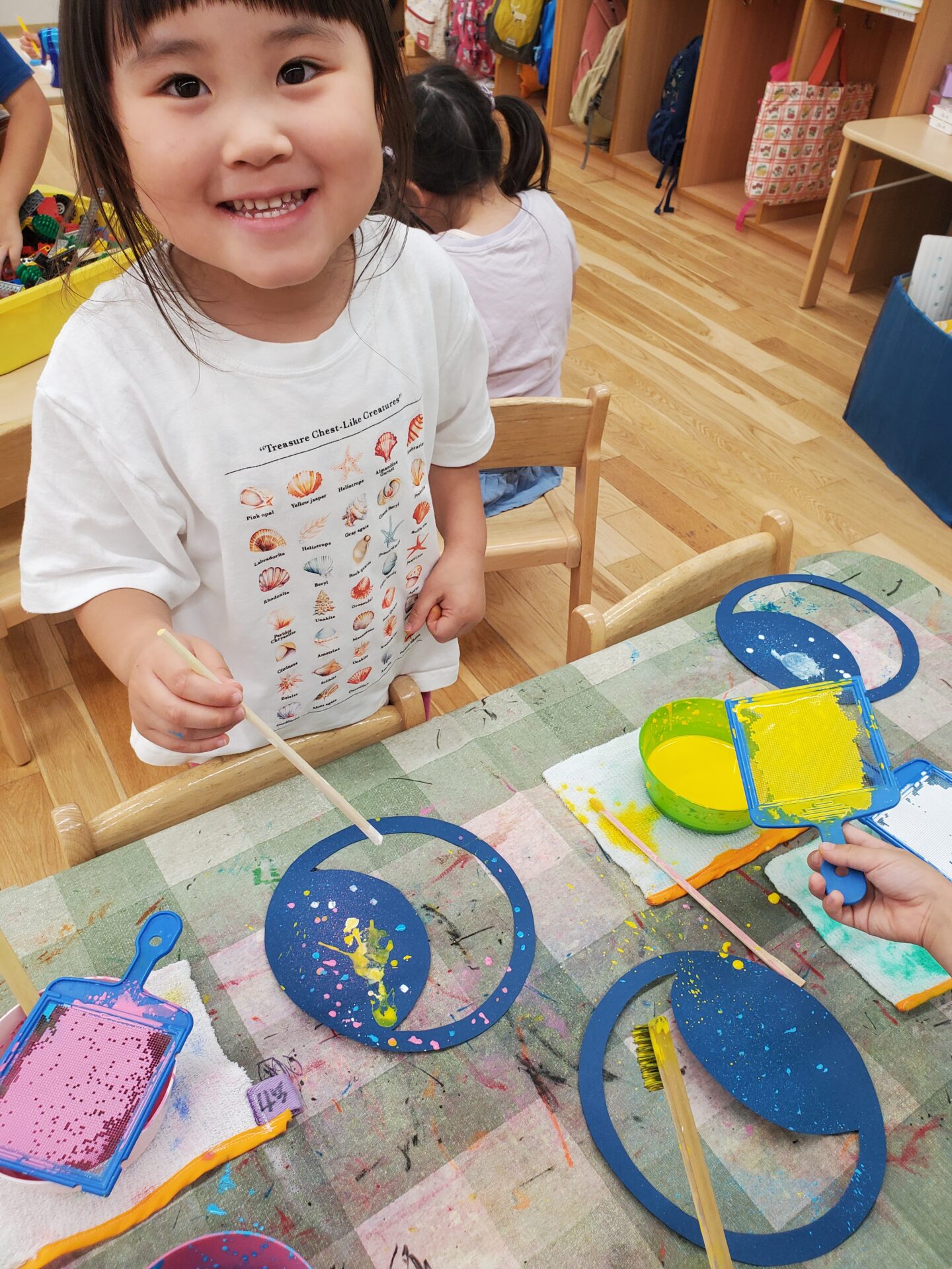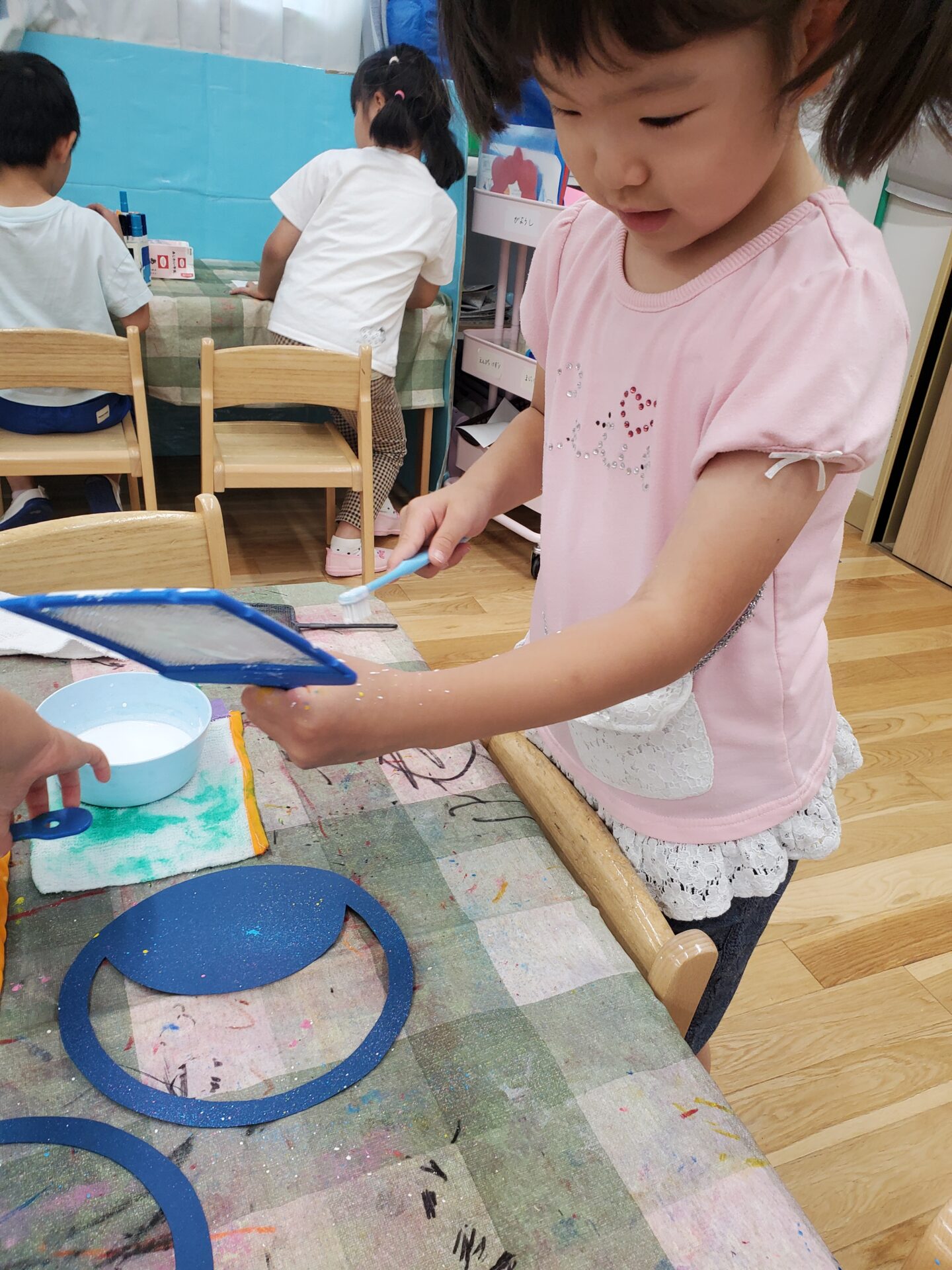カラフルな星ができあがると「今度はこの辺にしようかな~」と夢中で絵の具を弾いていました。