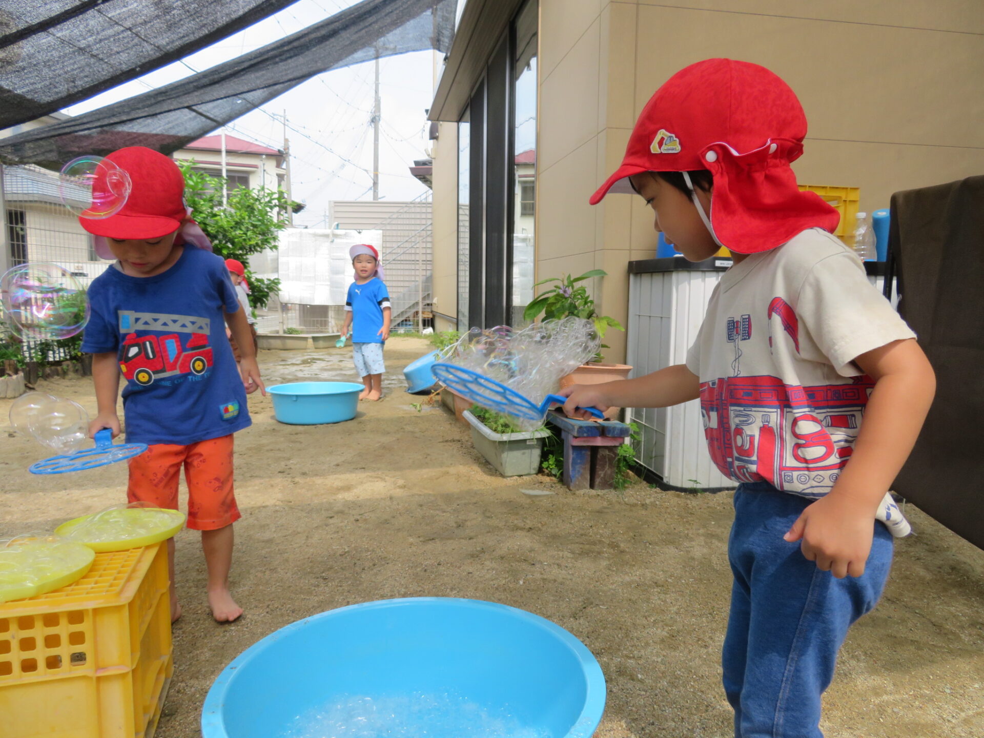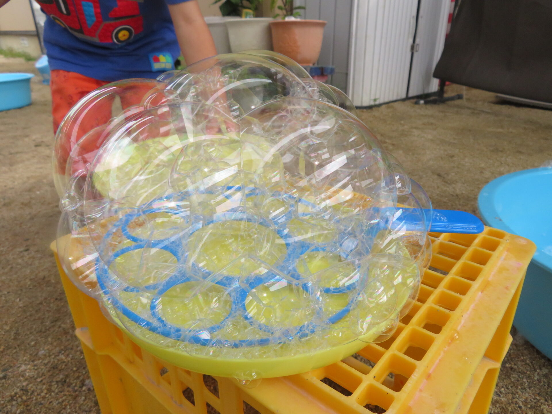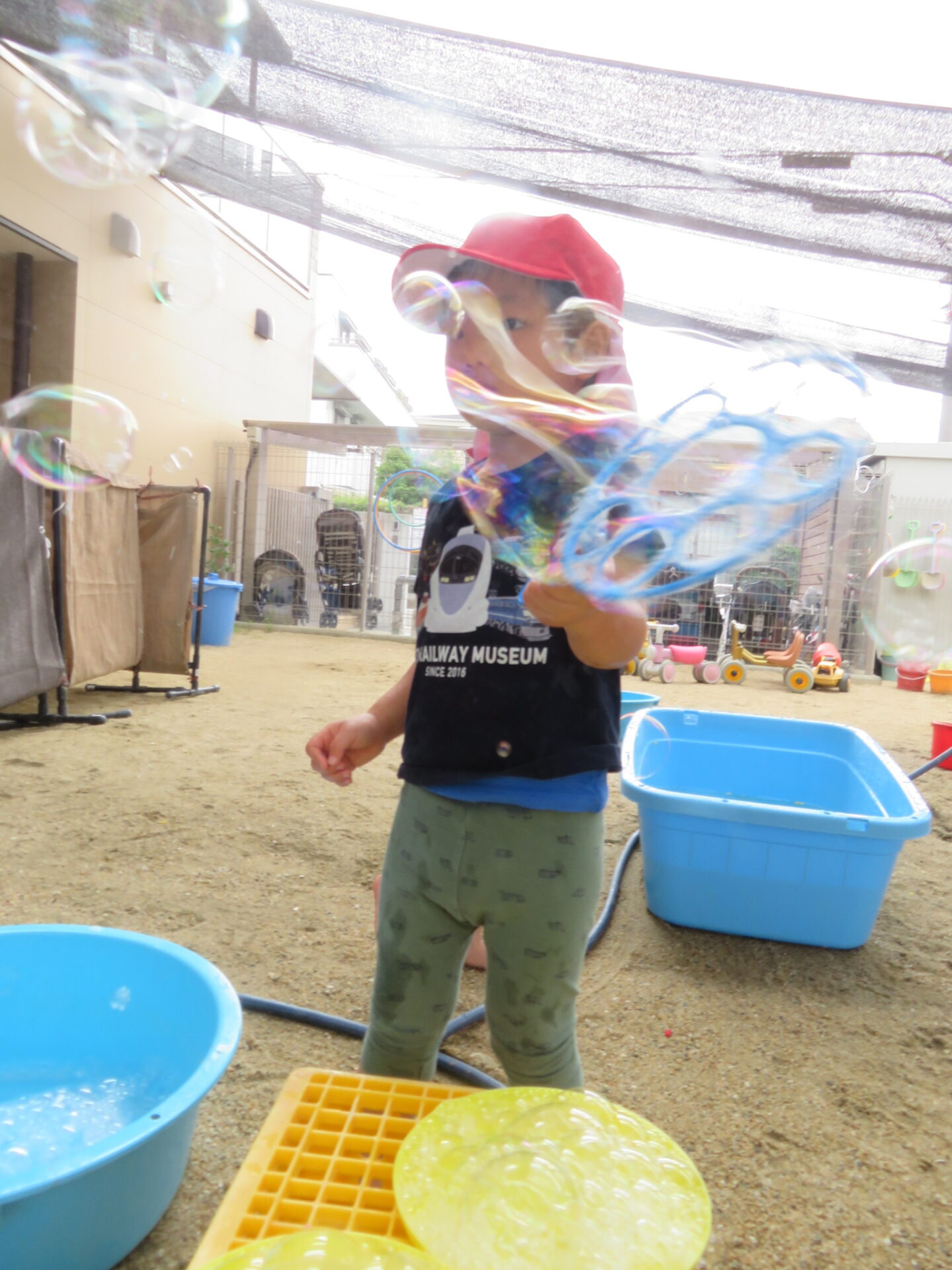 シャボン玉コーナーでは、いつもより大胆にシャボン玉作りを行います。