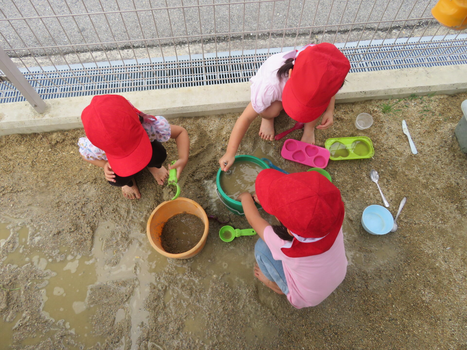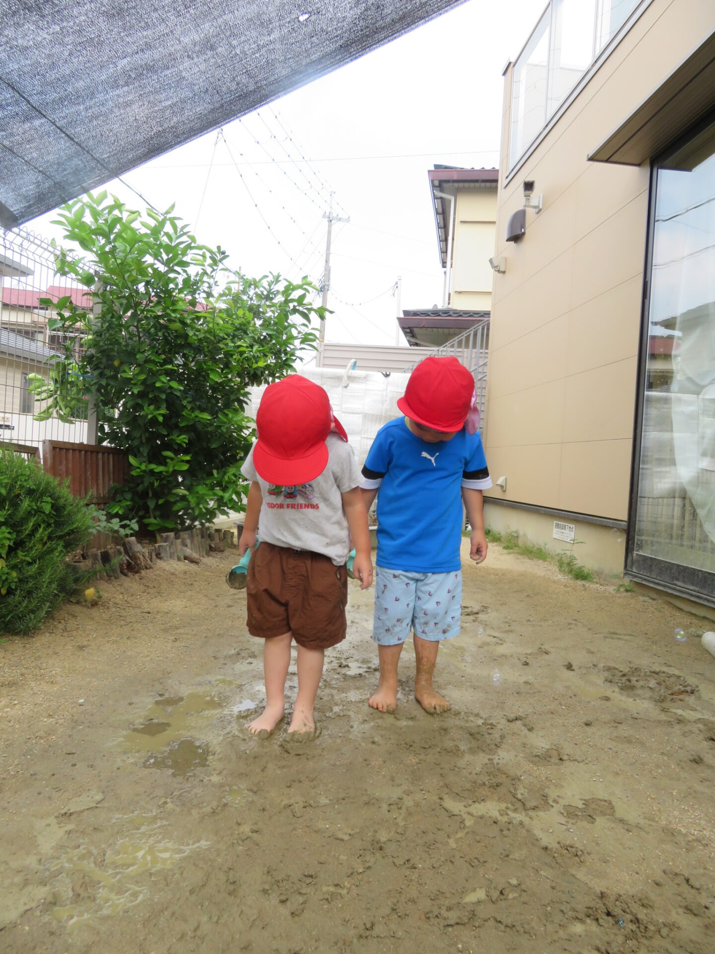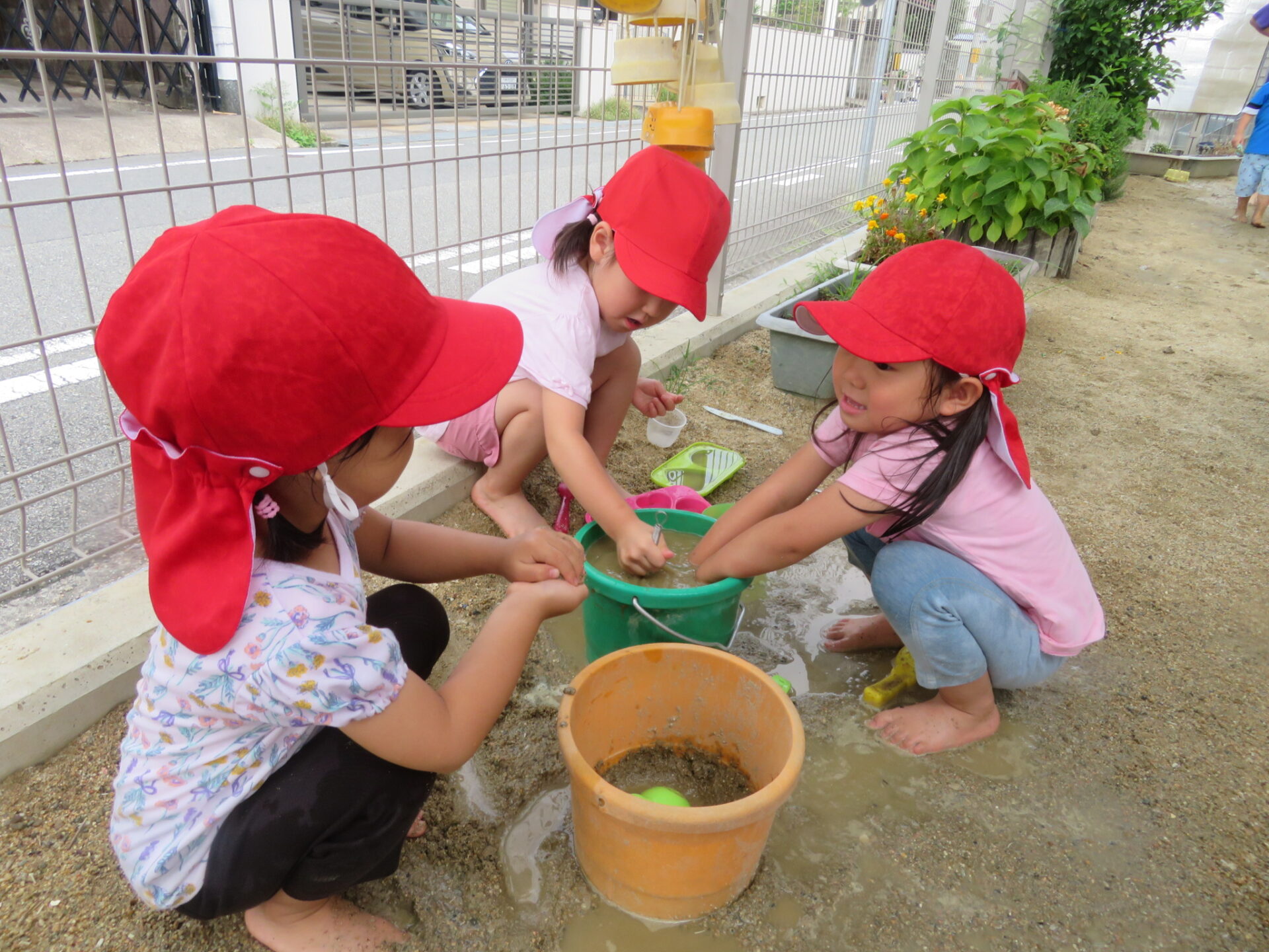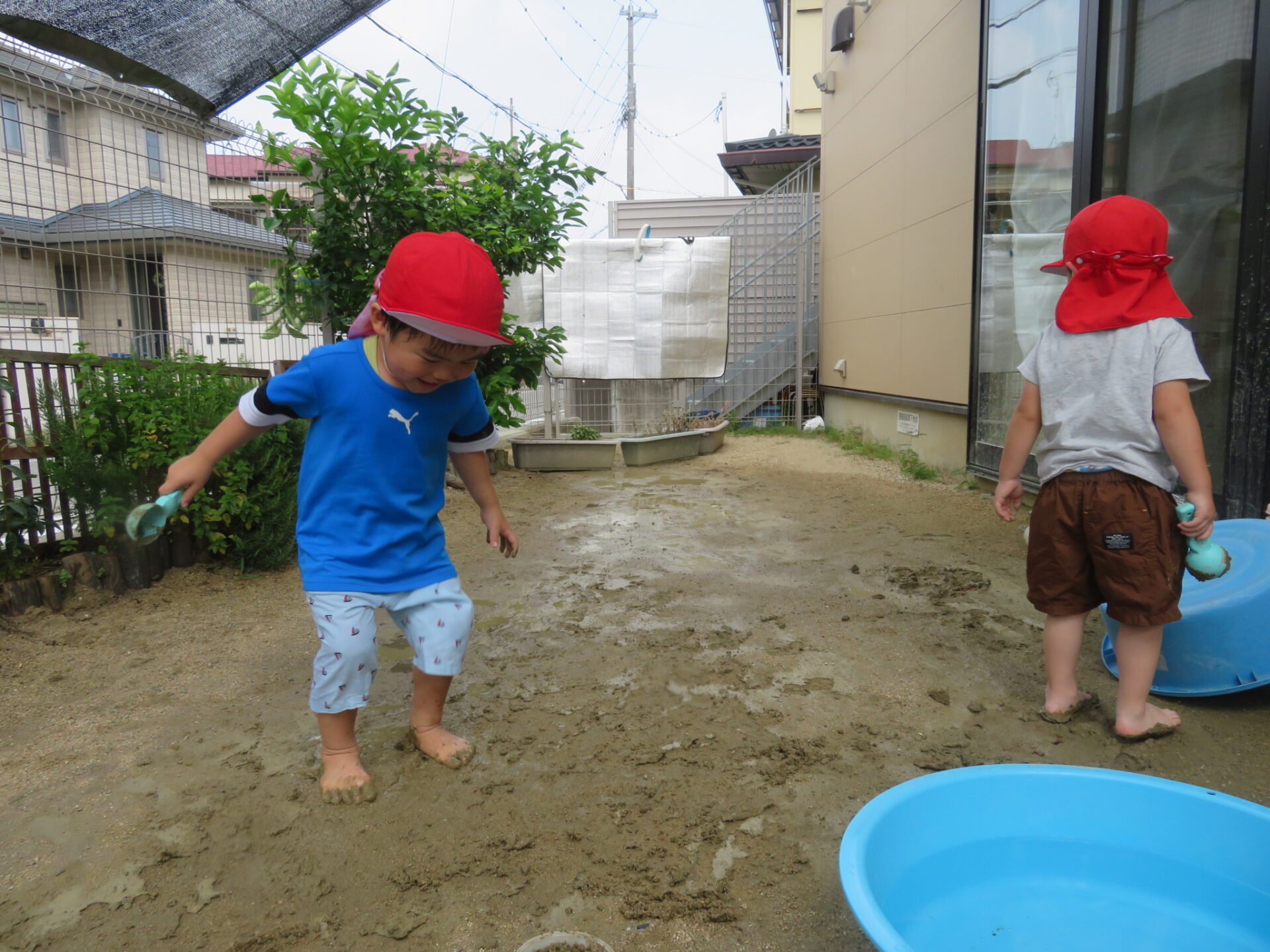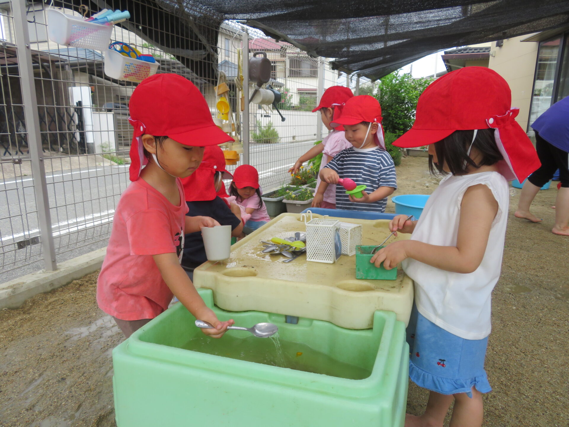 「今日も水遊びの用意、持ってきたよ!」と嬉しそうに、毎日登園してくる子ども達です。