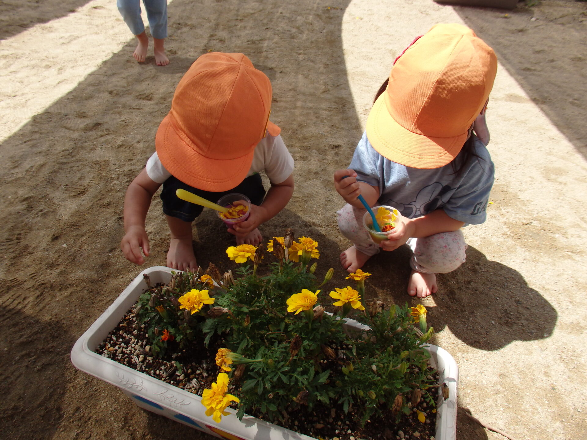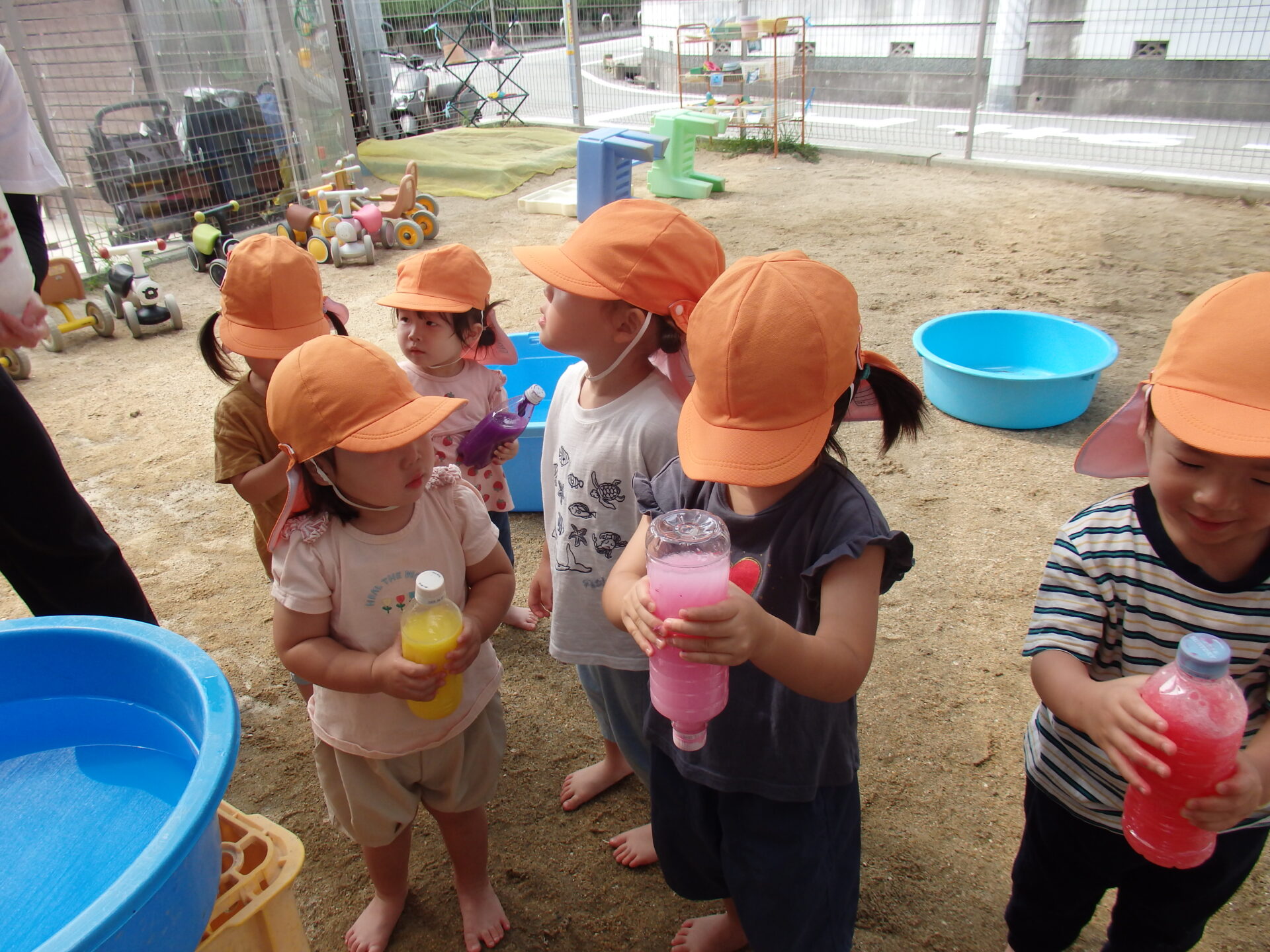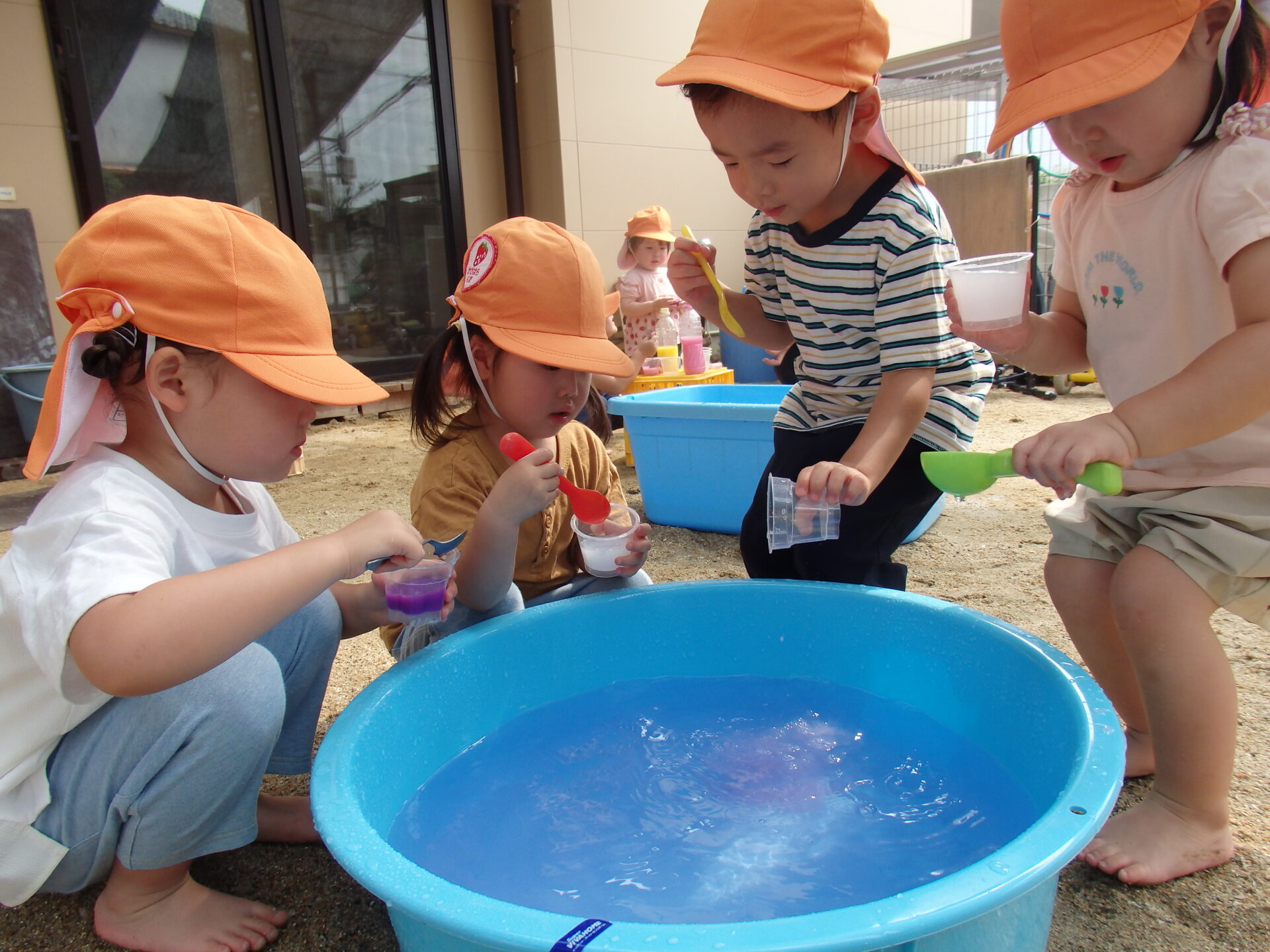 色水遊びでは、みんなで色水を作るところからやってみました。