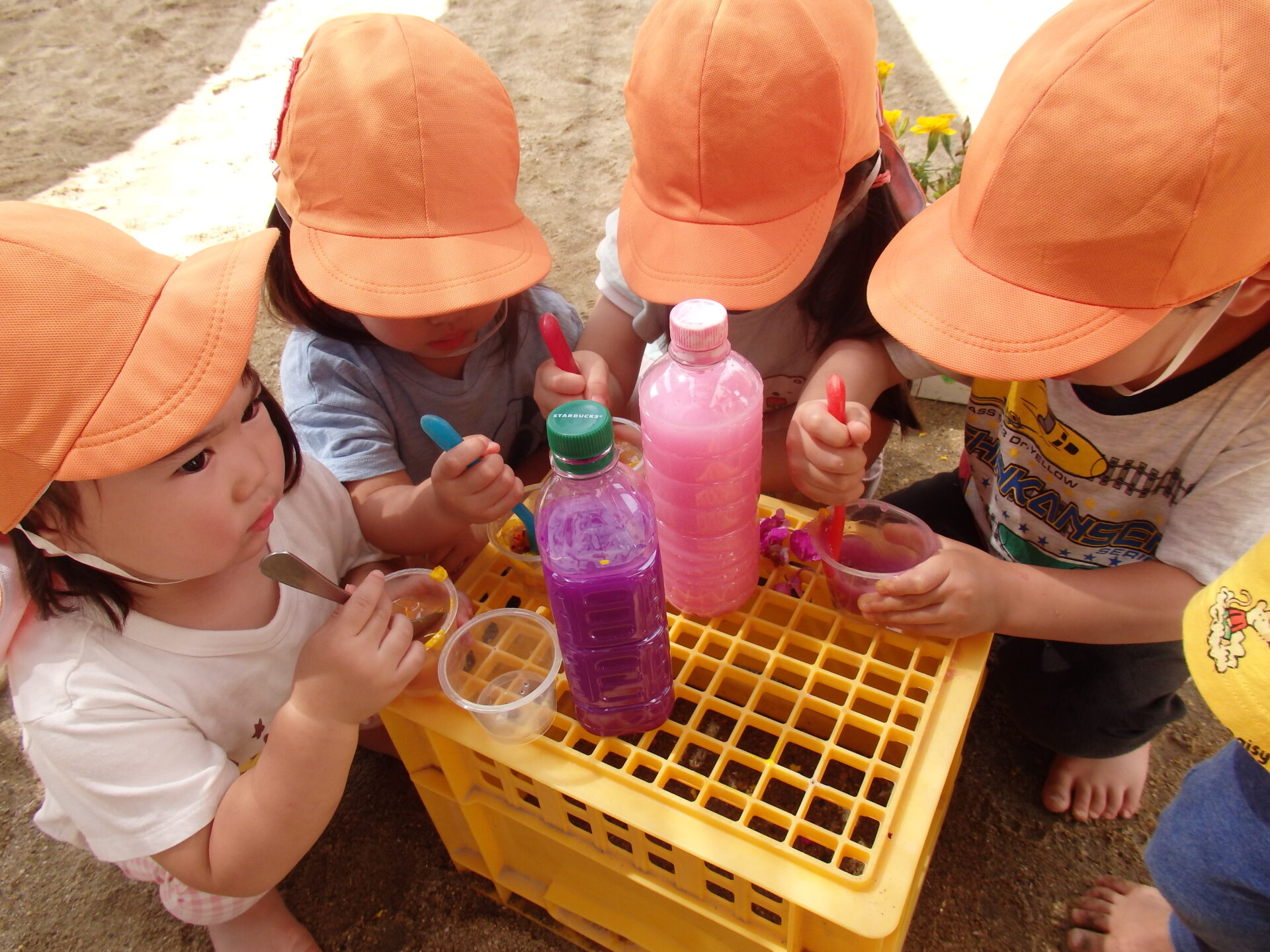 色水になってくると、「ぶどうジュースみたい!」「こっちはバナナジュースだ!」とフルーツのジュースに見立て始めた子どもたち。