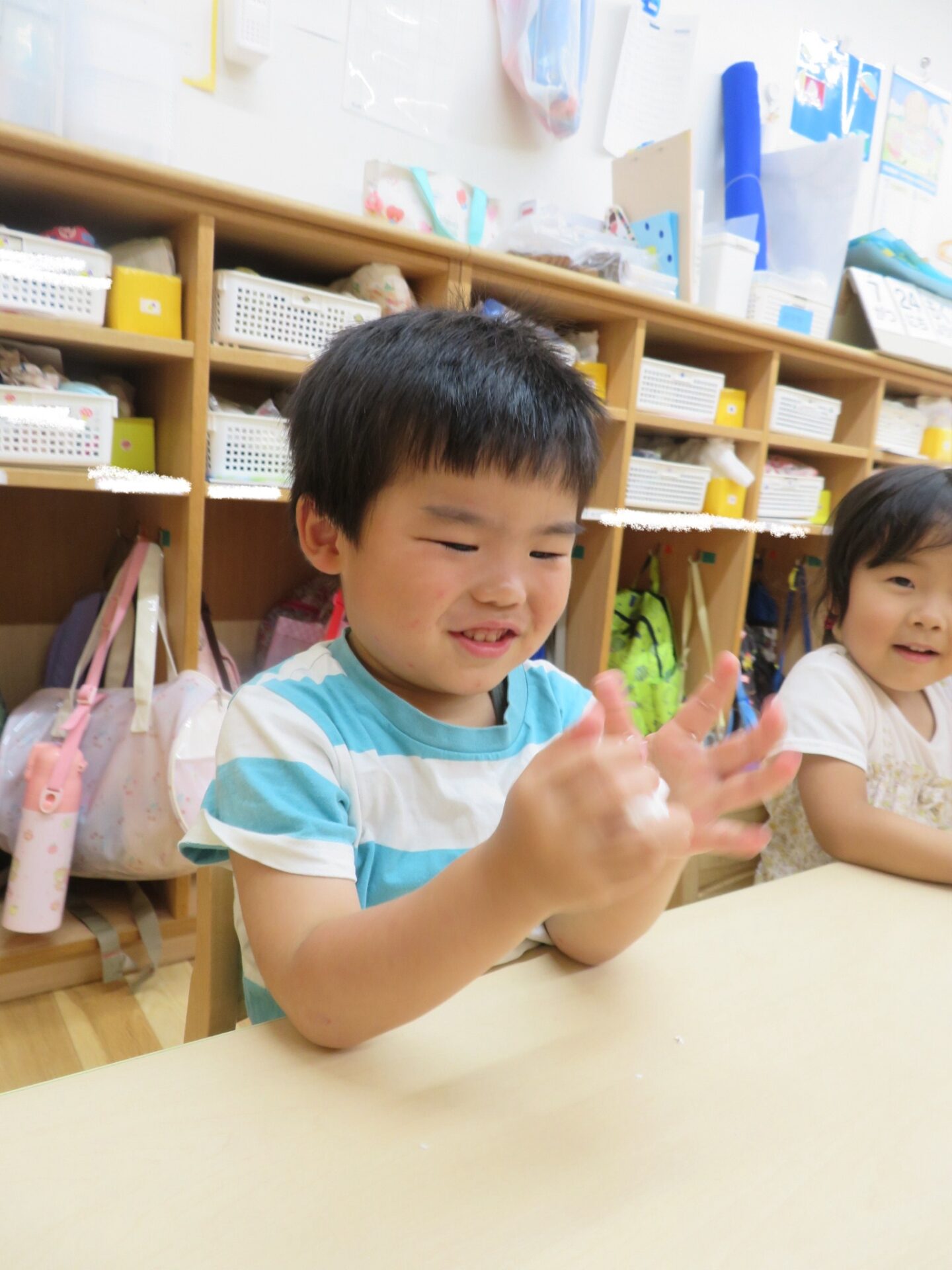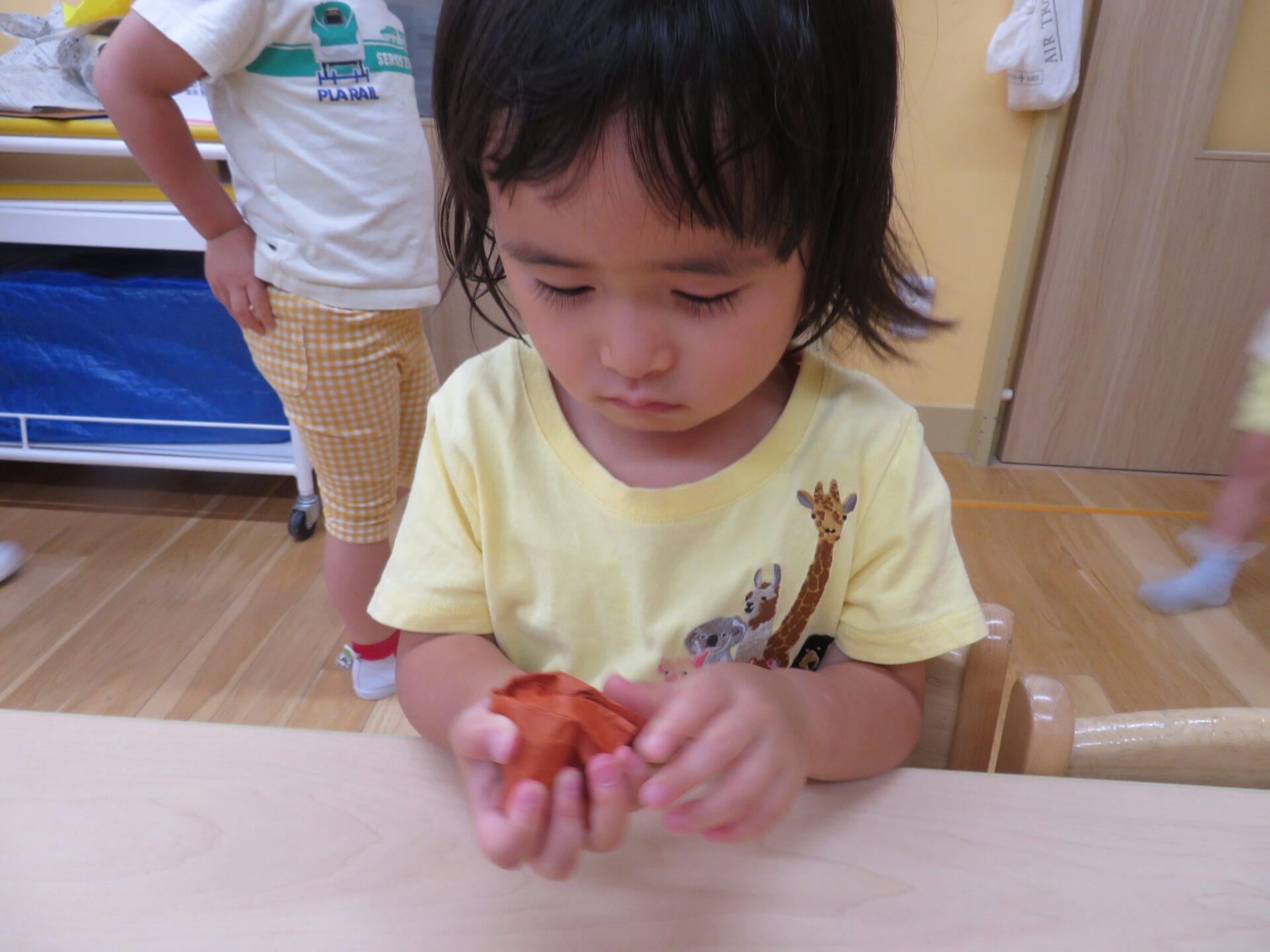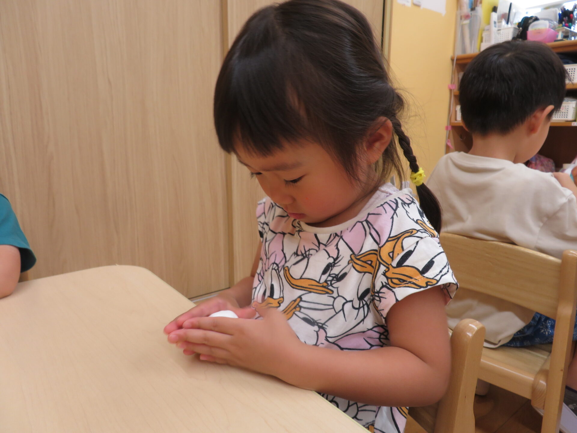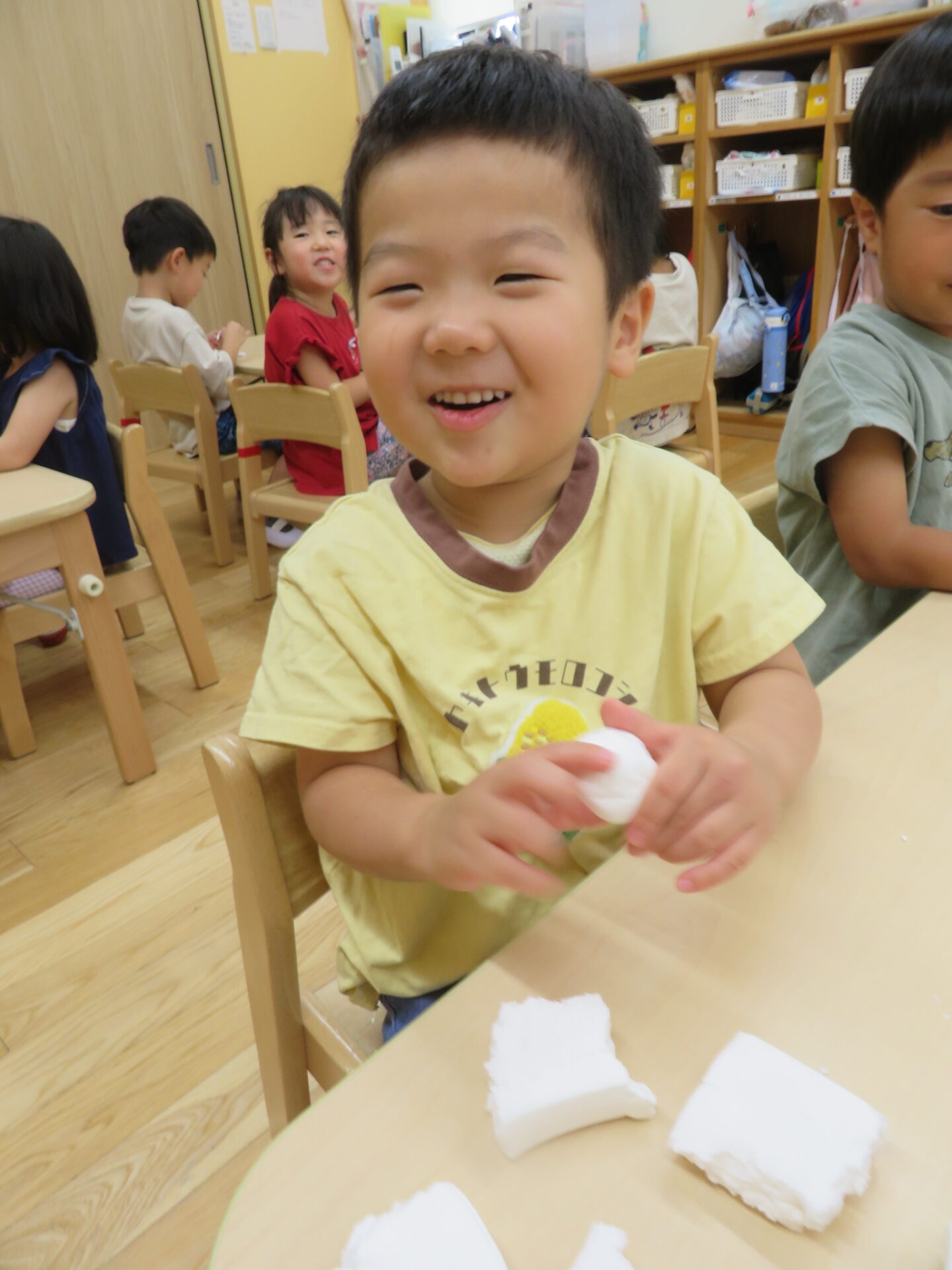 「じゃあ、なあに?」とみんなで尋ねてみると、「この前作ったおにぎり〜」とお弁当作りの時に作ったおにぎりを再現していました。