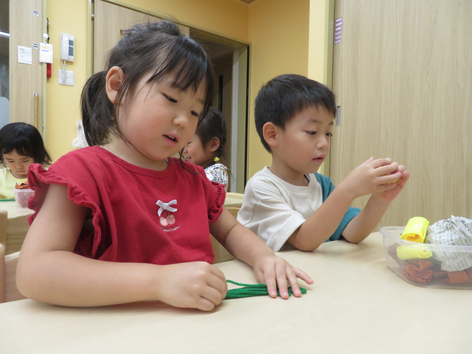 2回のお弁当作りを経験し、ごっこ遊びとしても楽しめるようお弁当の具材を製作遊びで取り入れました。