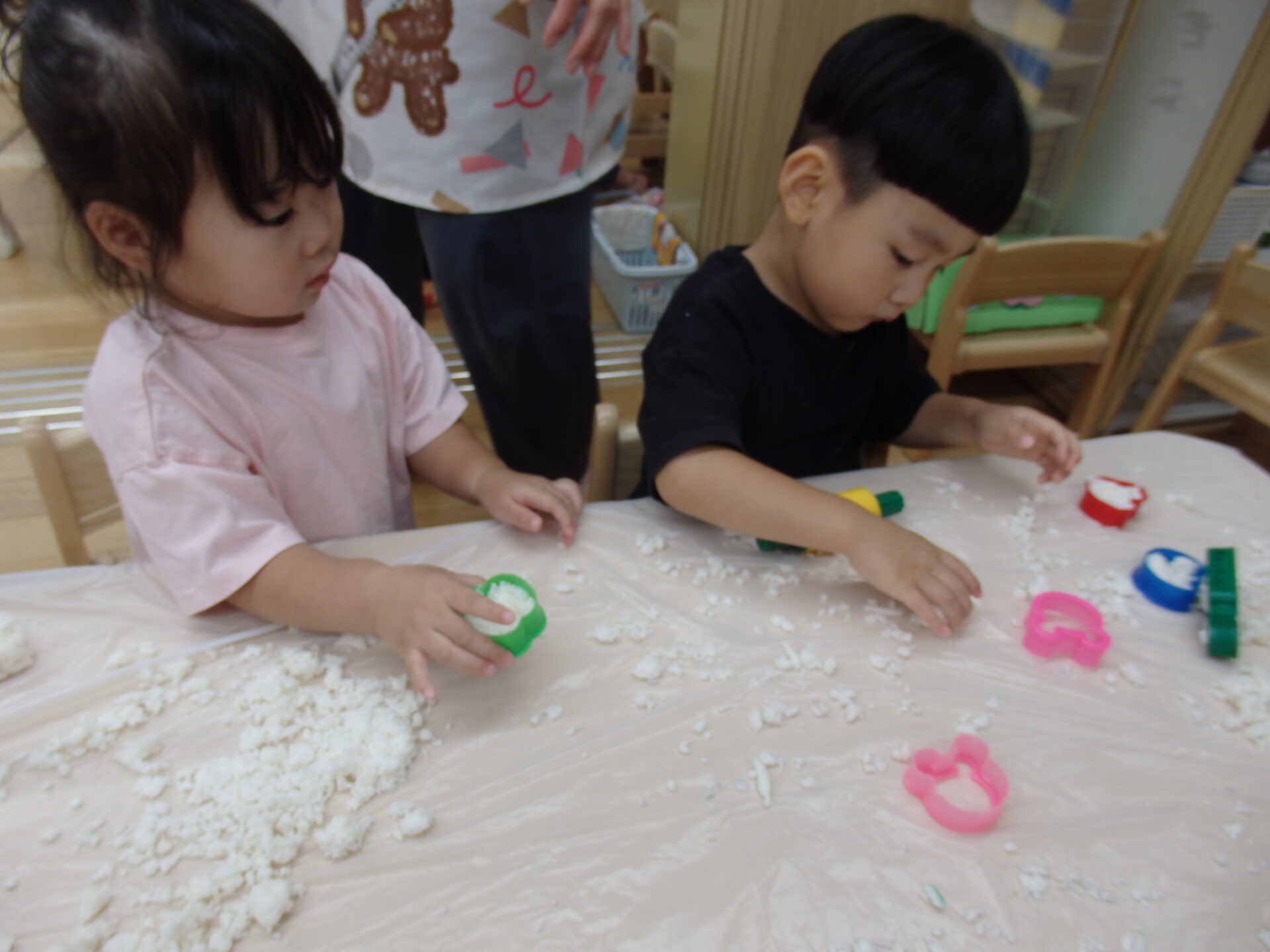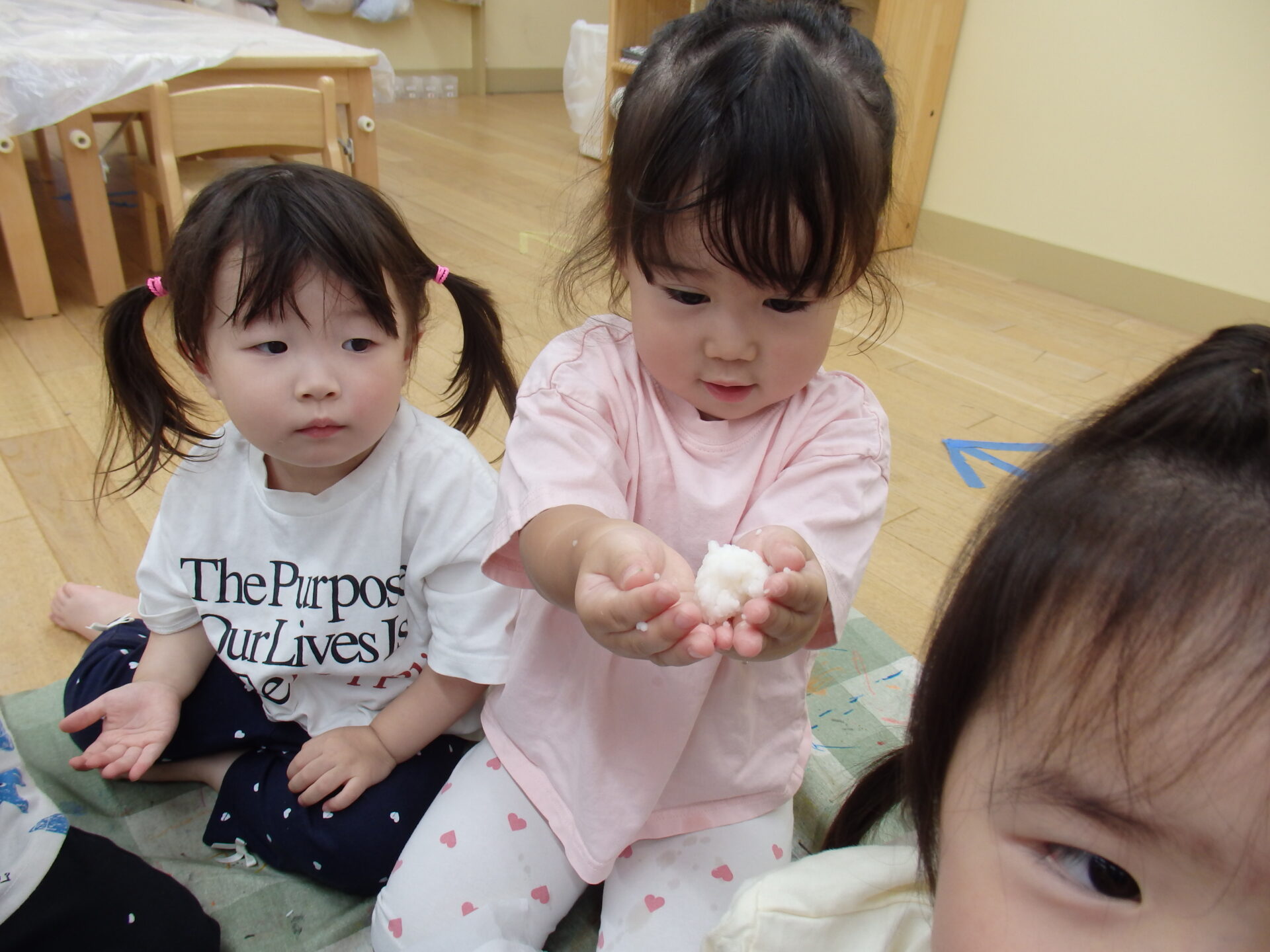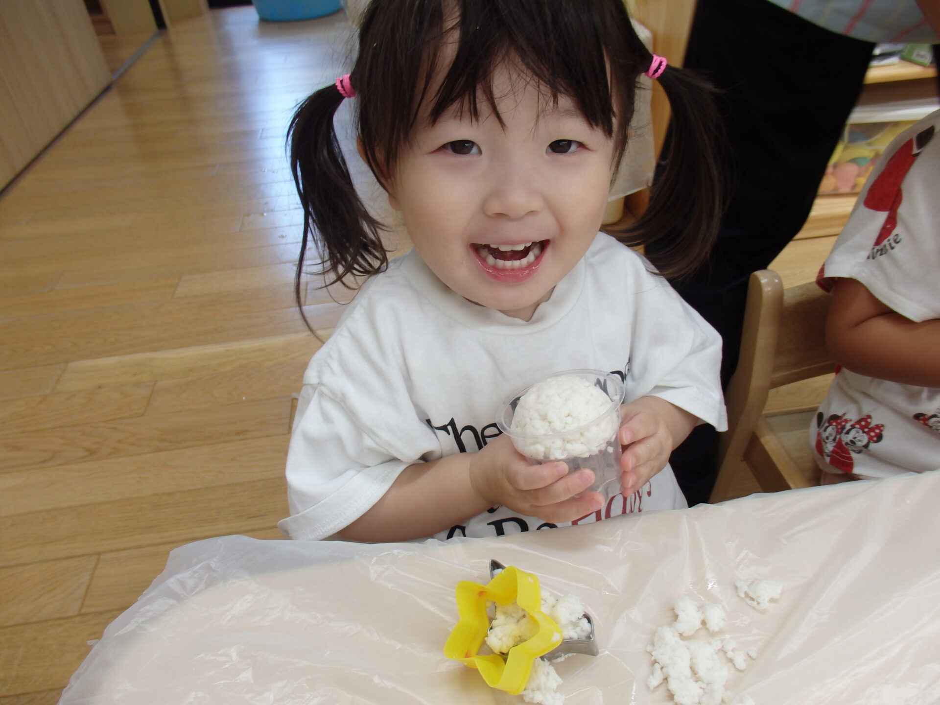 少しずつ感触が変わり、ギュッギュと握ると固まるようになっていることに気付いた子どもたちは、「見て見て!おにぎり!」といろんな形のおにぎりを作って楽しんでいました。