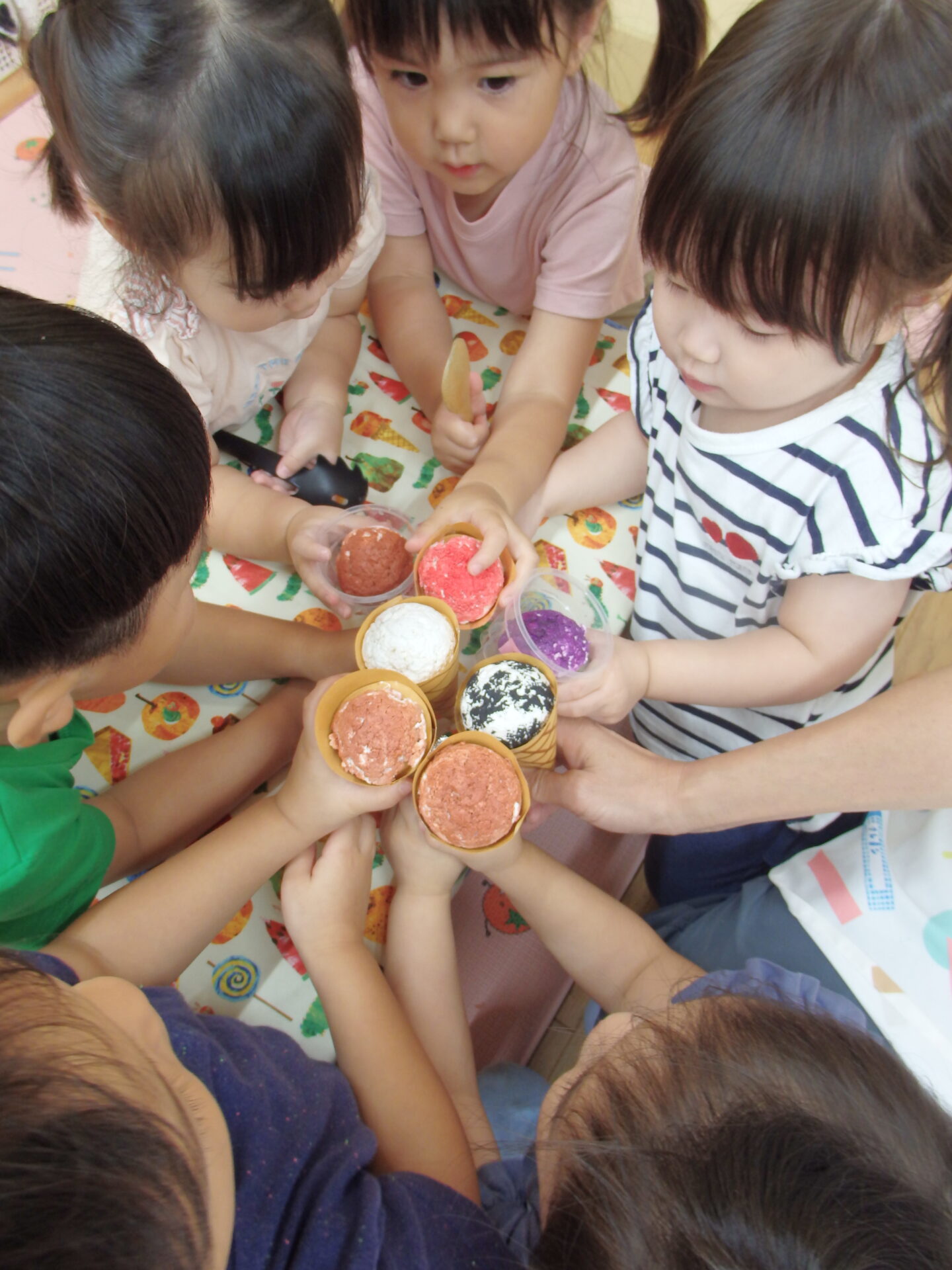 みんなでアイスクリーム屋さんごっこをし、「かんぱ〜い!」してアイスクリームを食べました😋