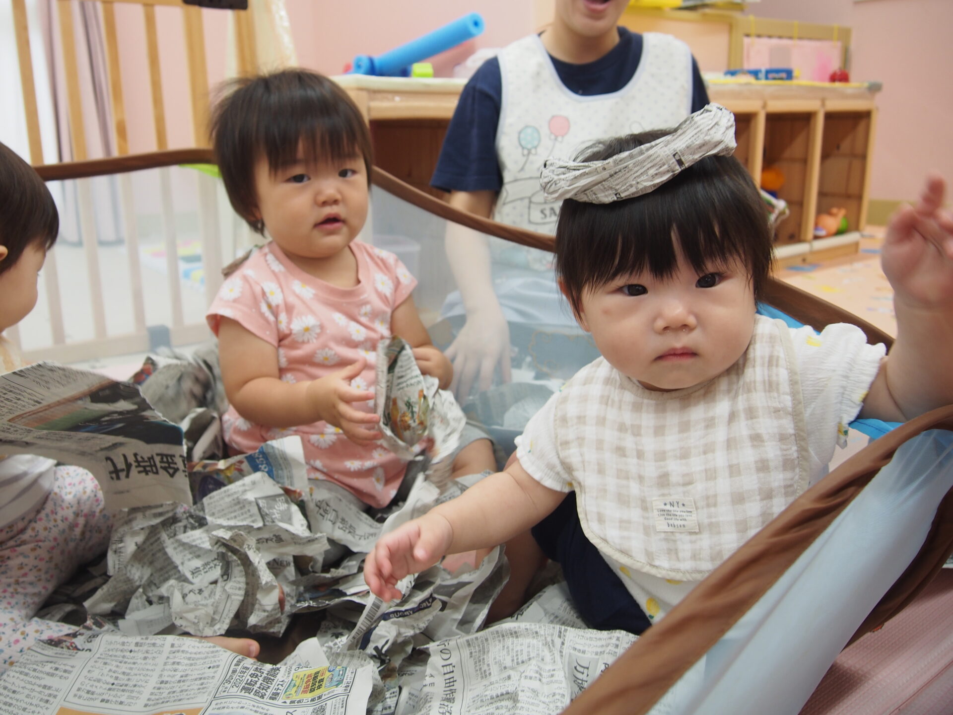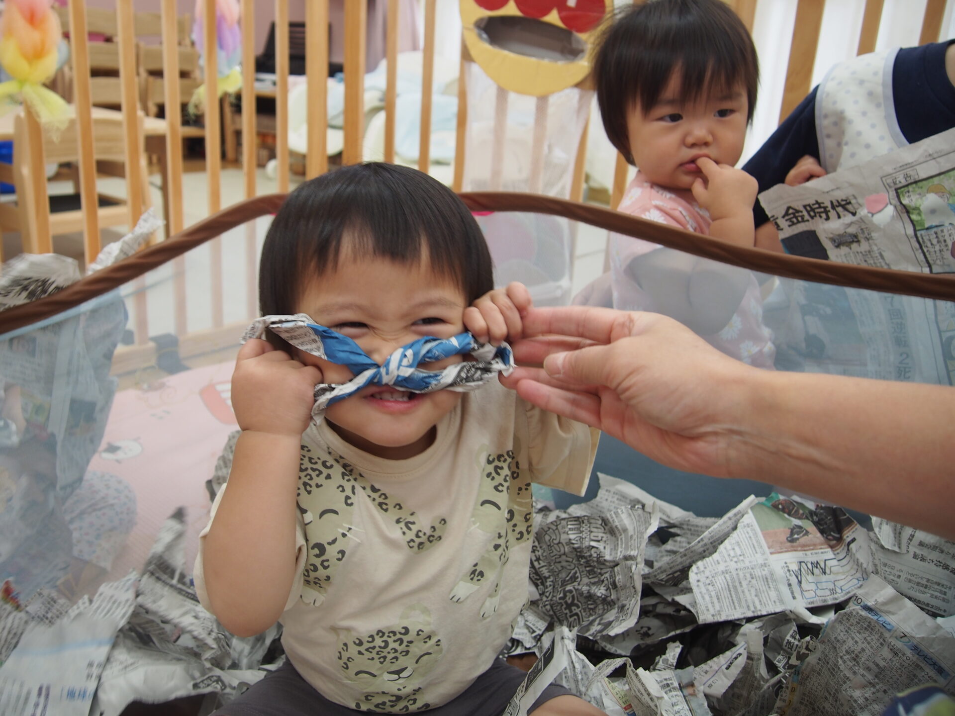 新聞紙って楽しいね(0歳児)