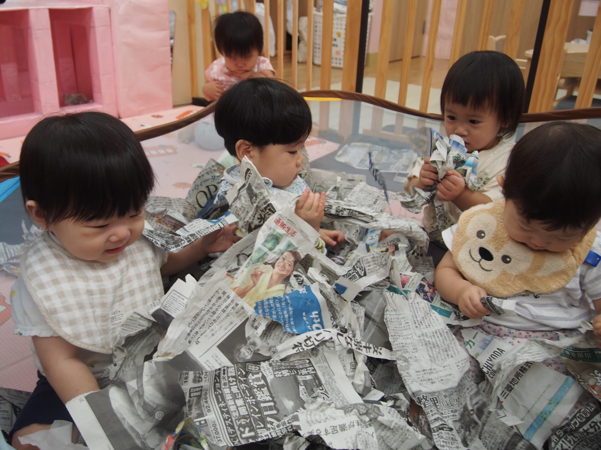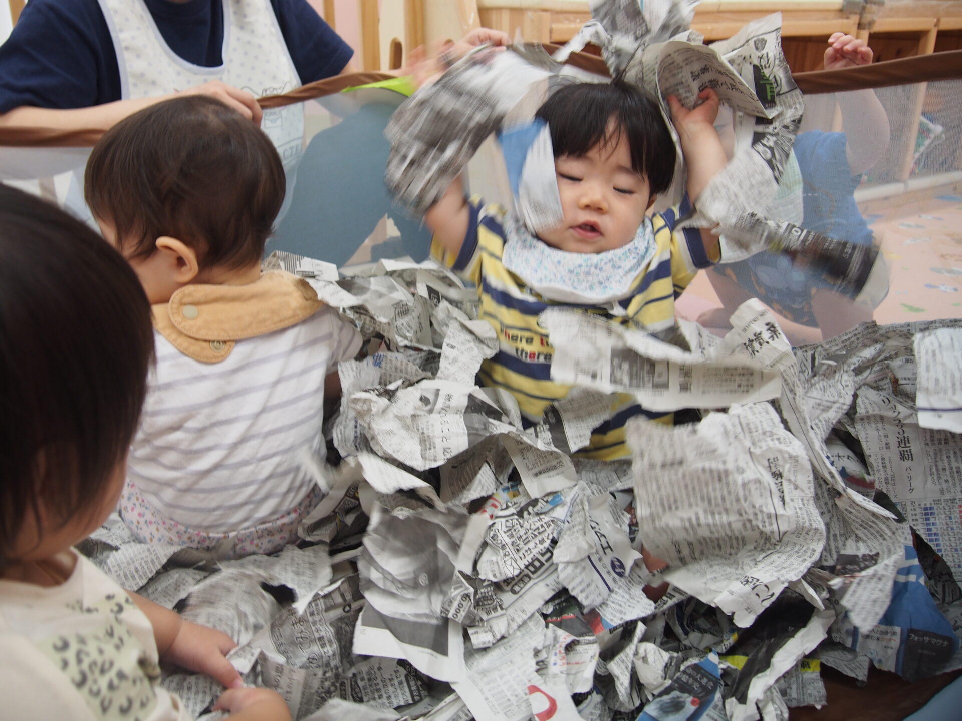 感触を味わう子、音を楽しむ子、細かくちぎることに集中する子、気づけば30分ほど遊び込んでいました!