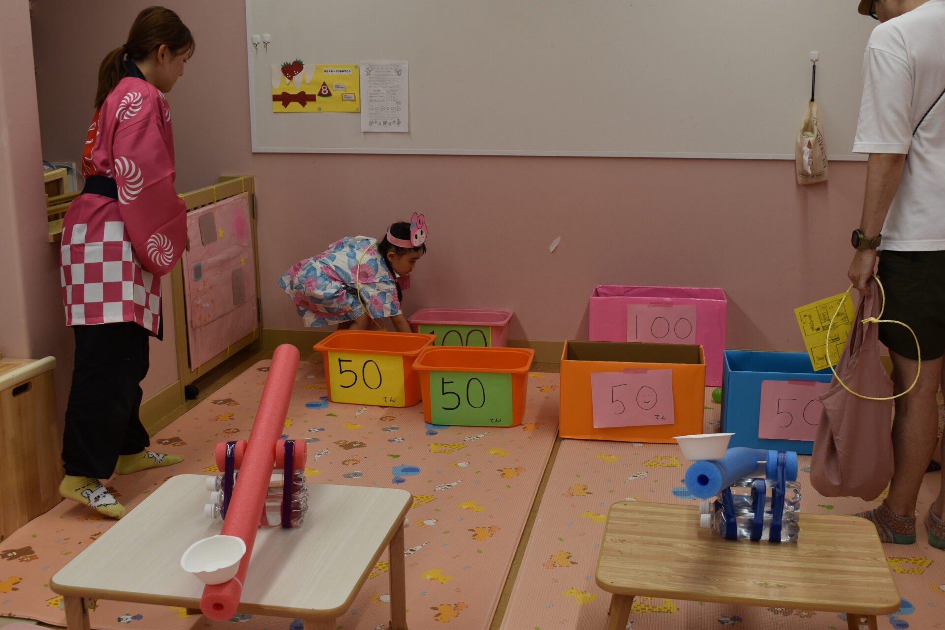 点数が書かれたカゴめがけて飛ばすので、うまく入れられた時は大喜びでした。