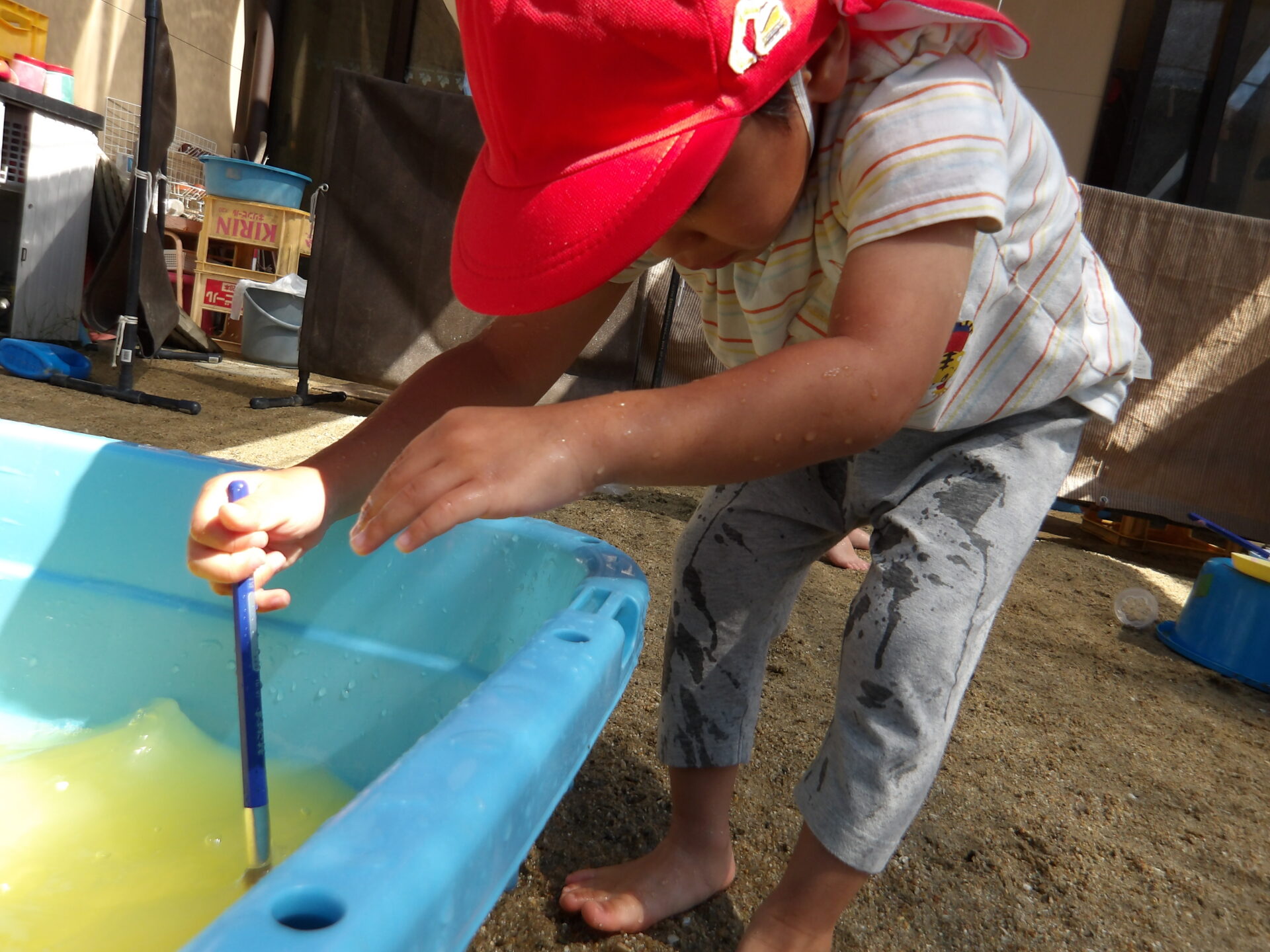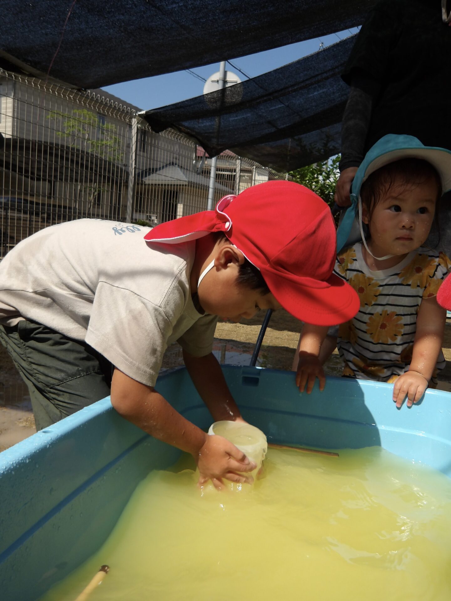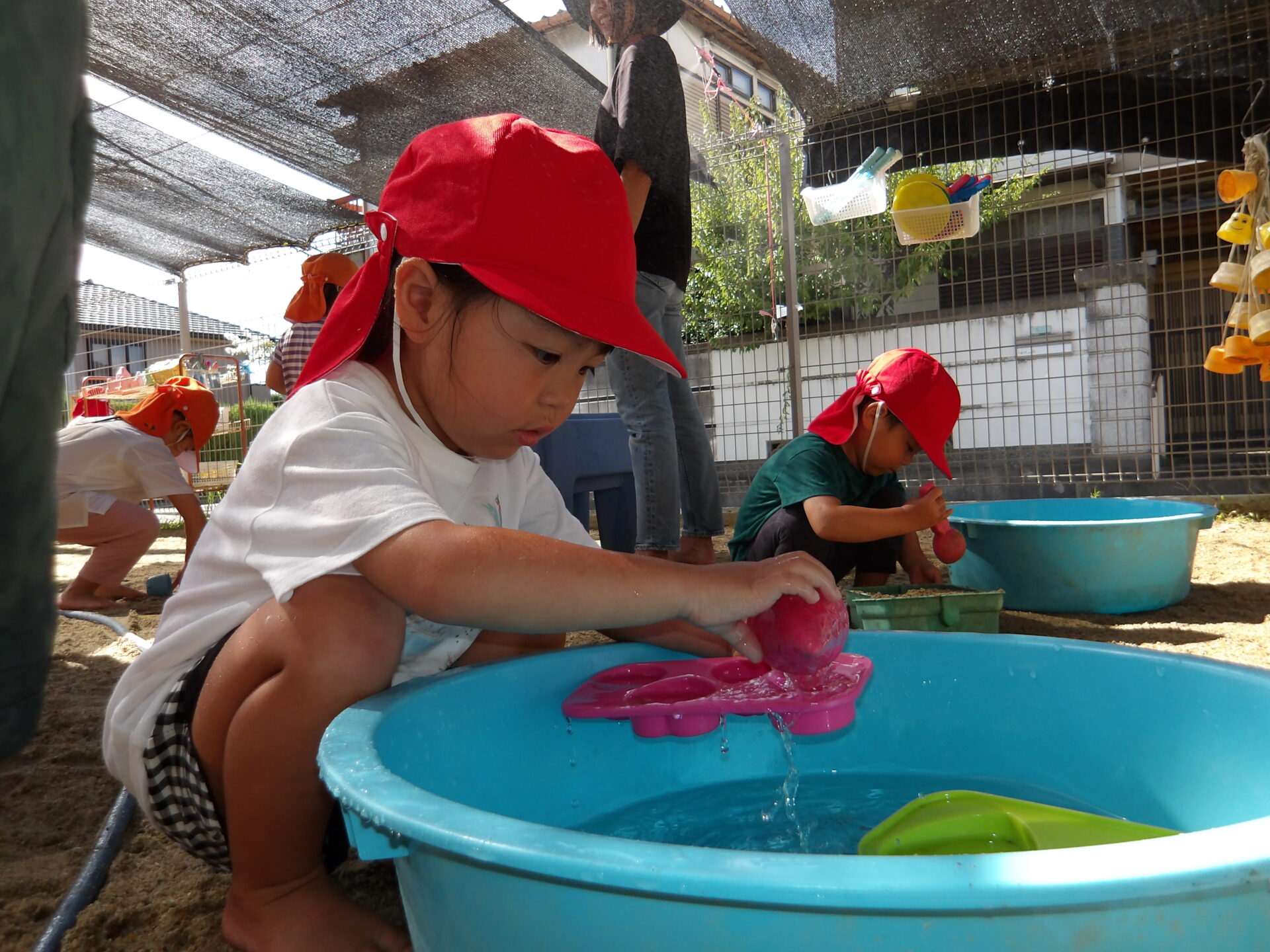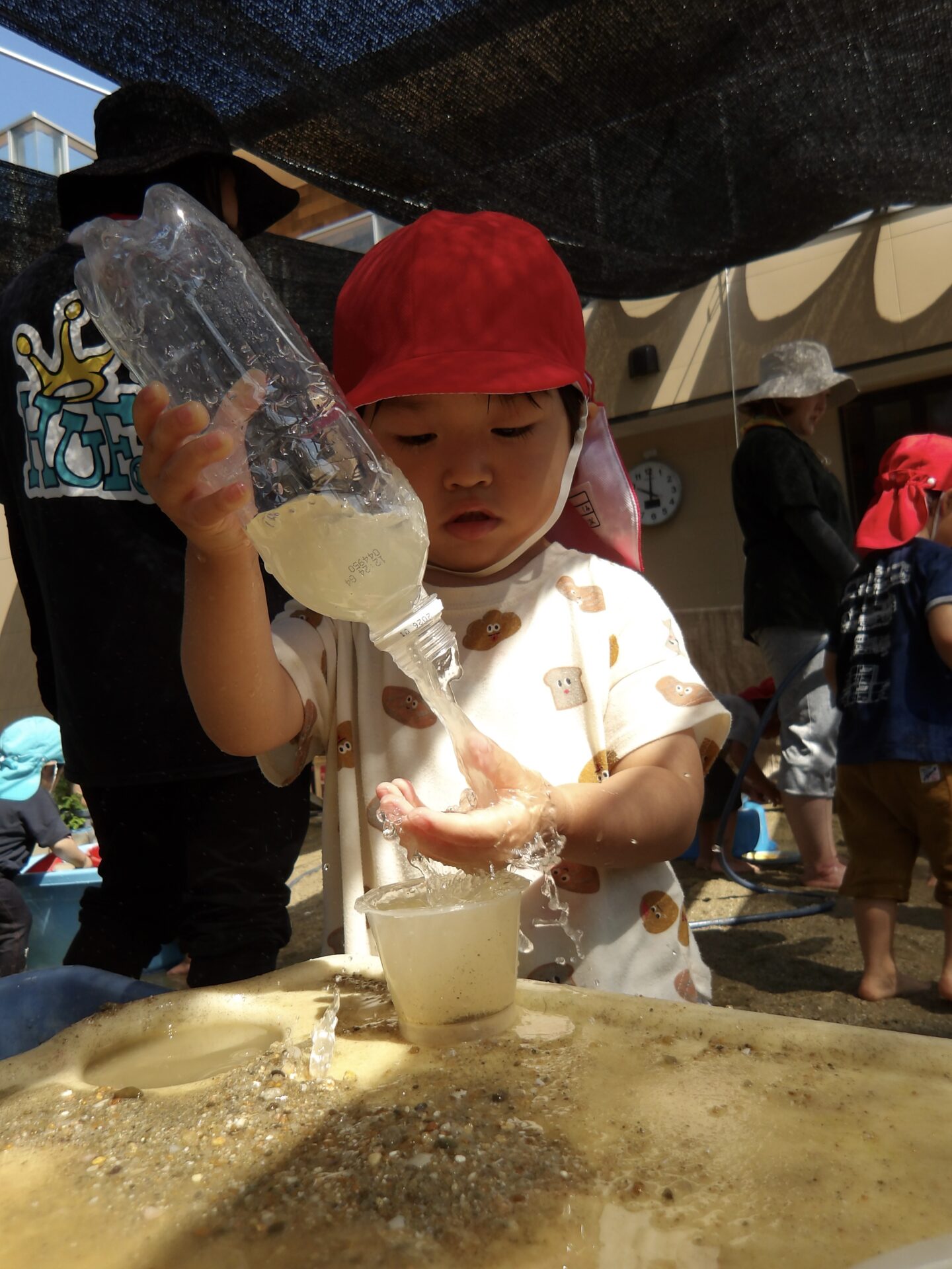 「いいよ!今日もドロドロの砂作ろうか」と相談しながら、その日の水遊びで何をするかを決めて楽しんでいます。