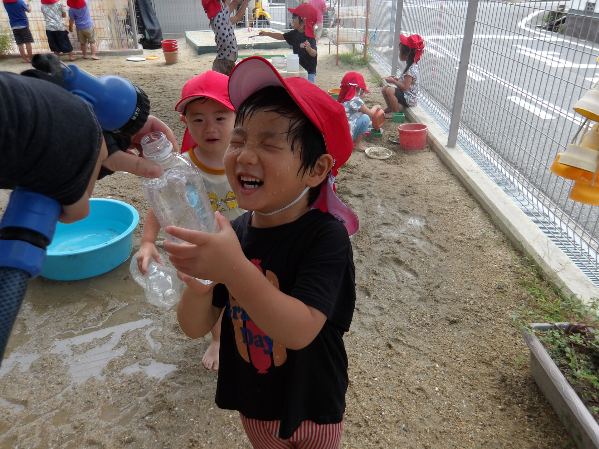 「先生!ここに水入れて!」とホースにペットボトルを近付け、ホースから勢いよく出てくる水に大笑い!