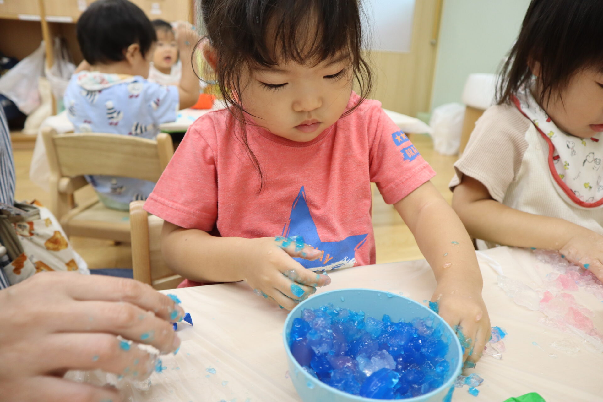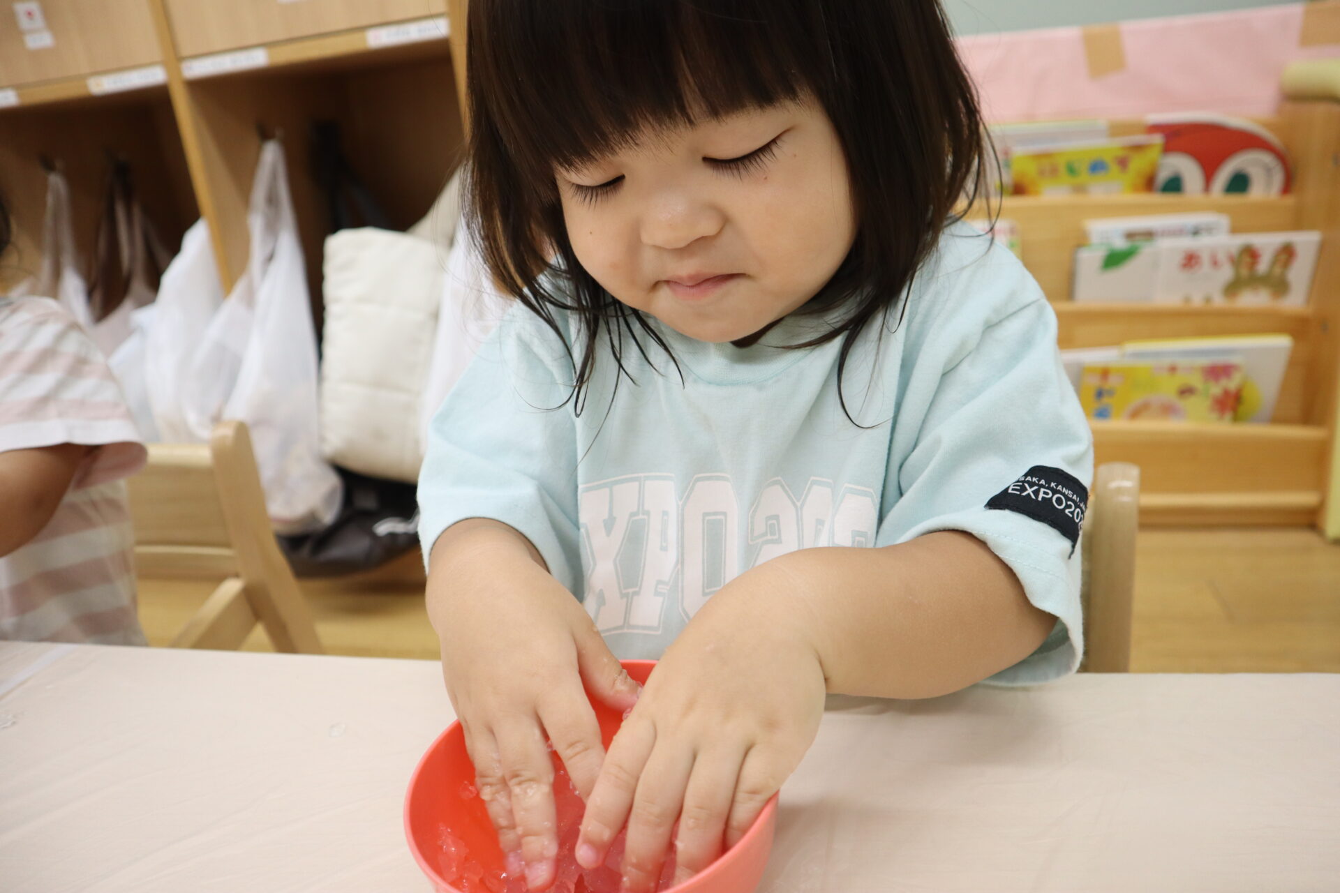 中から出てきたのは、なんと“寒天ゼリー”初めは不思議そうに見ていましたが、触ってみると冷たくて気持ちくて、手のひらで握ったり、かき混ぜたりして楽しんでいました。