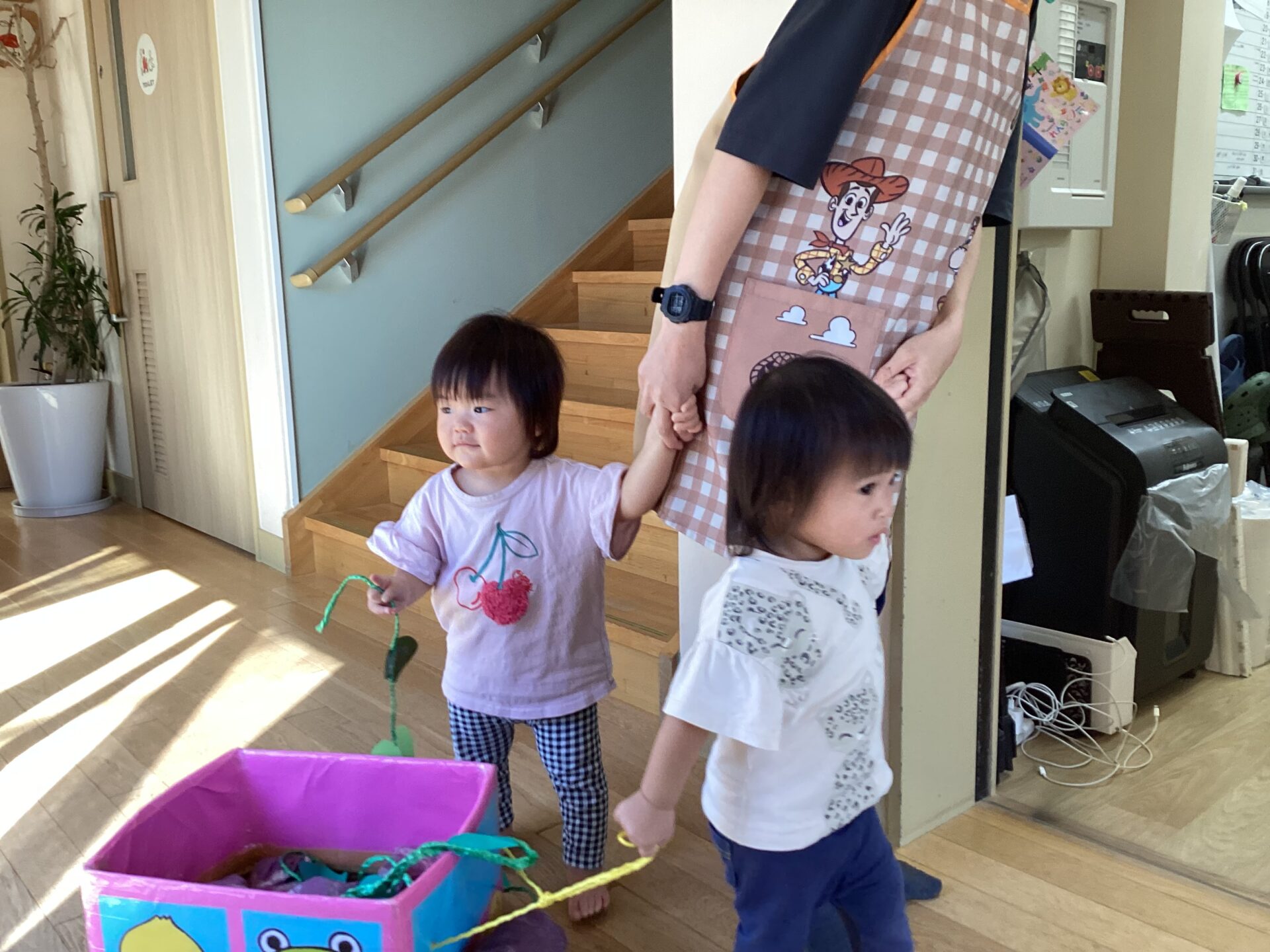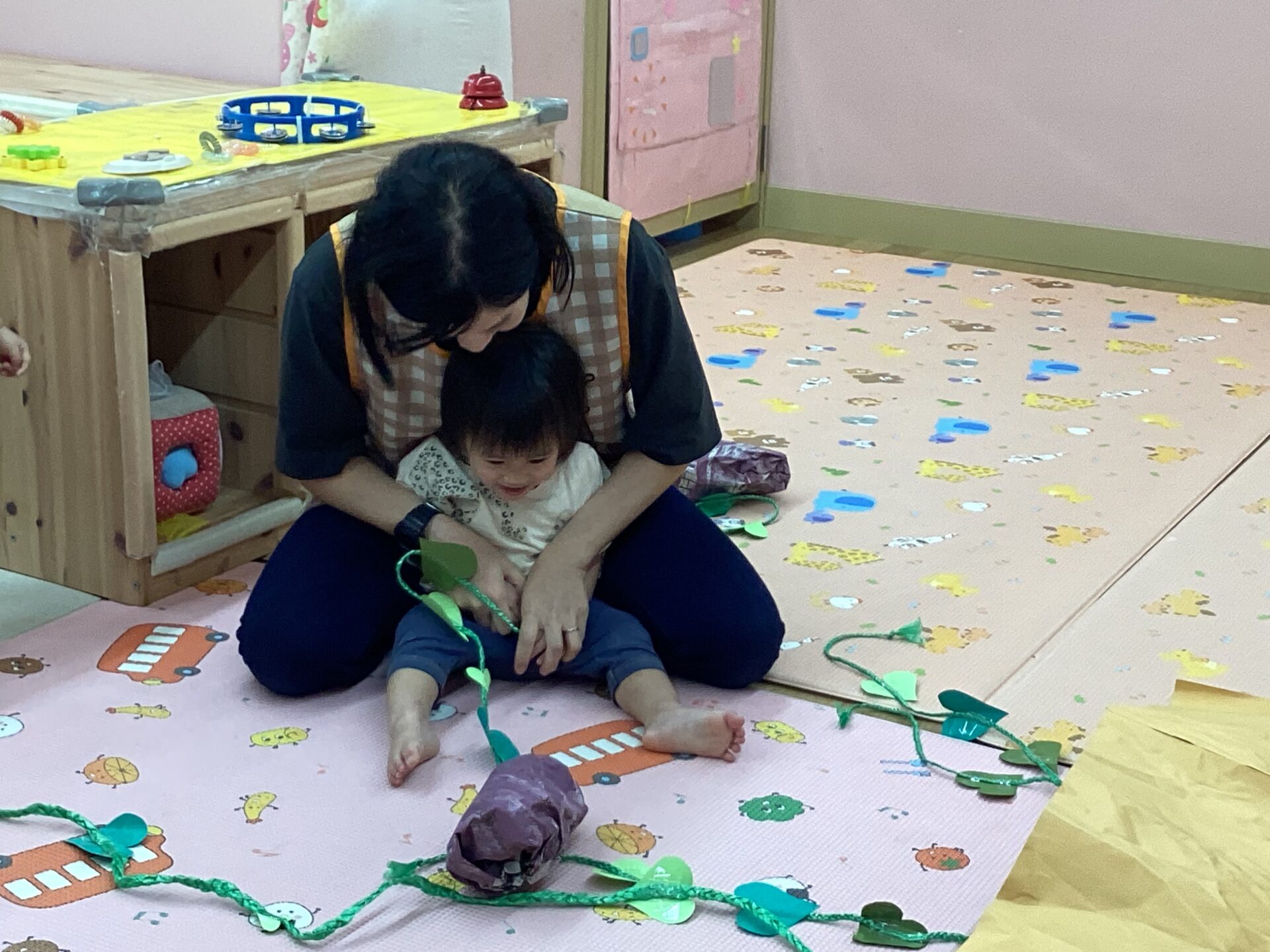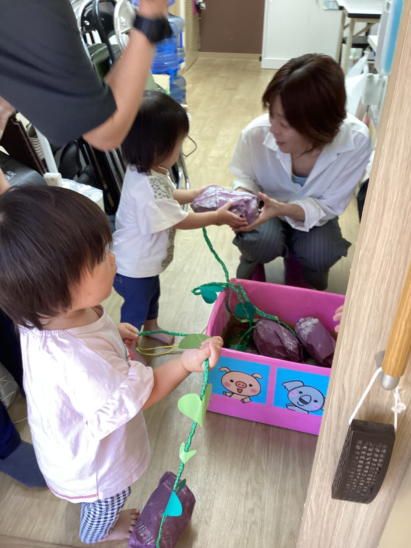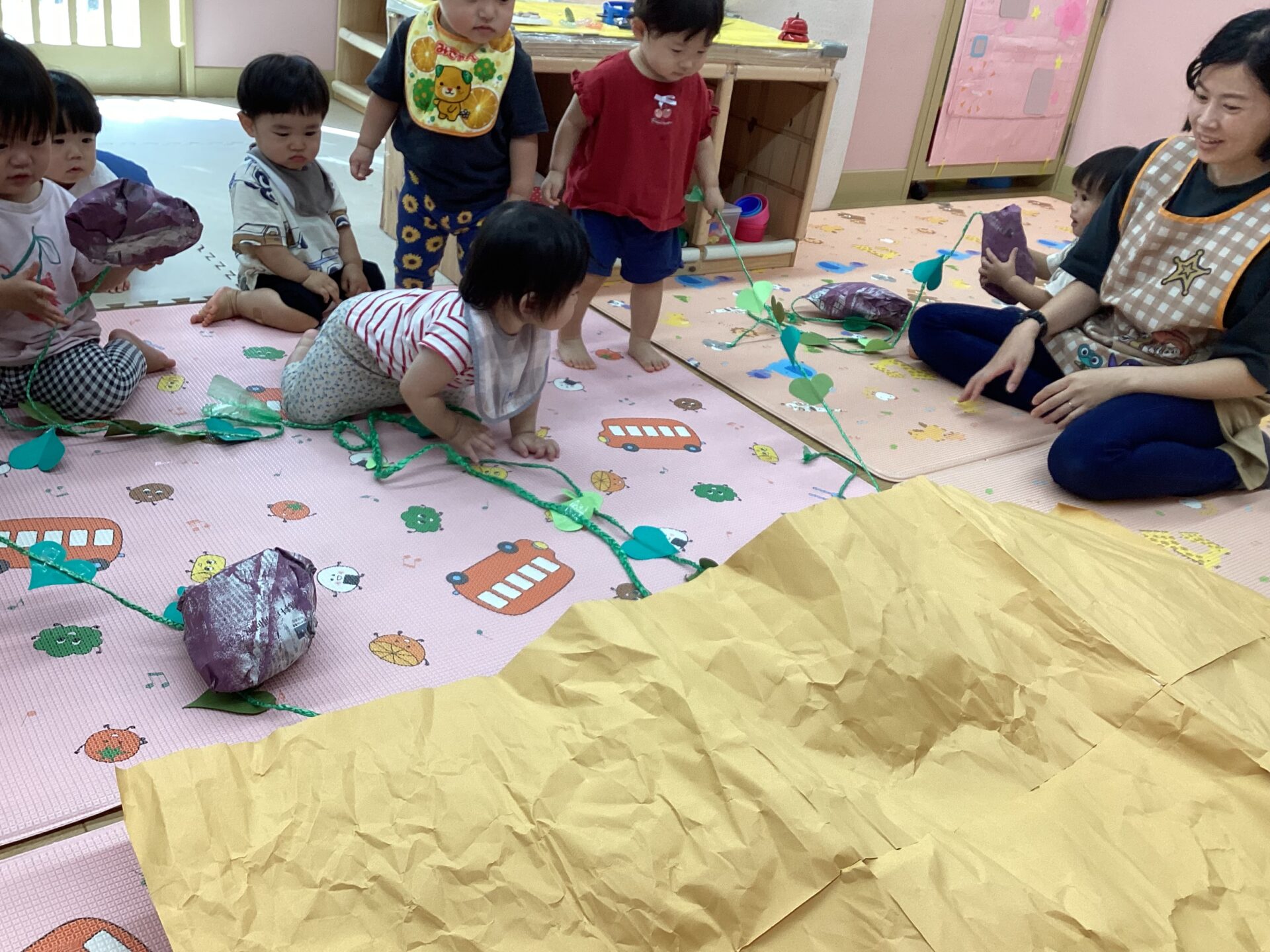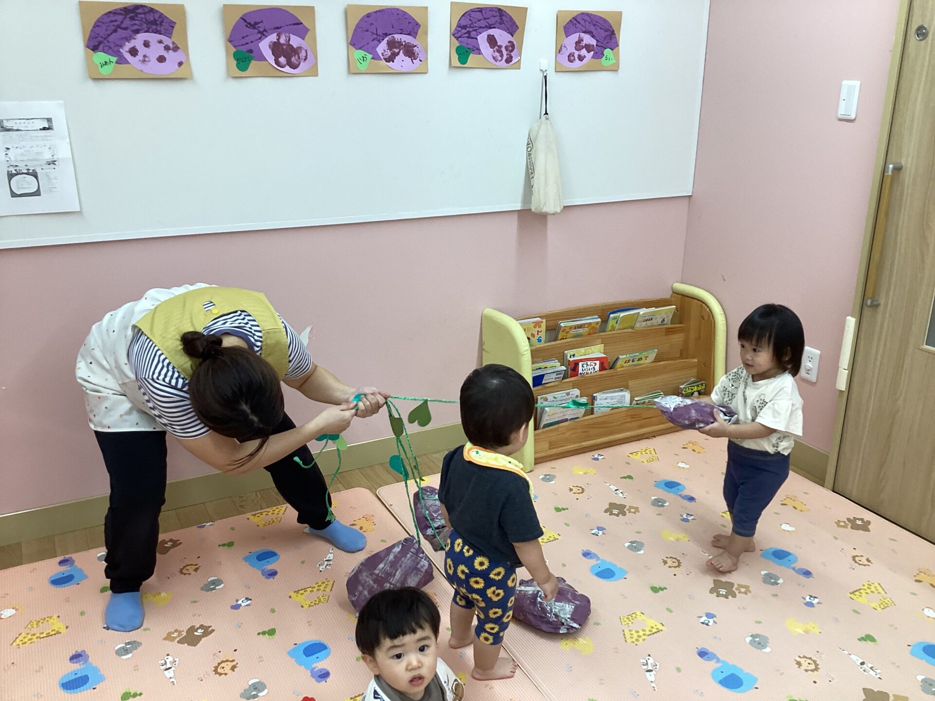 保育室が畑に変身!保育者が見つけたツルを引っ張ってみると『何かな?何かな』とみんな真剣に見守ってくれました。