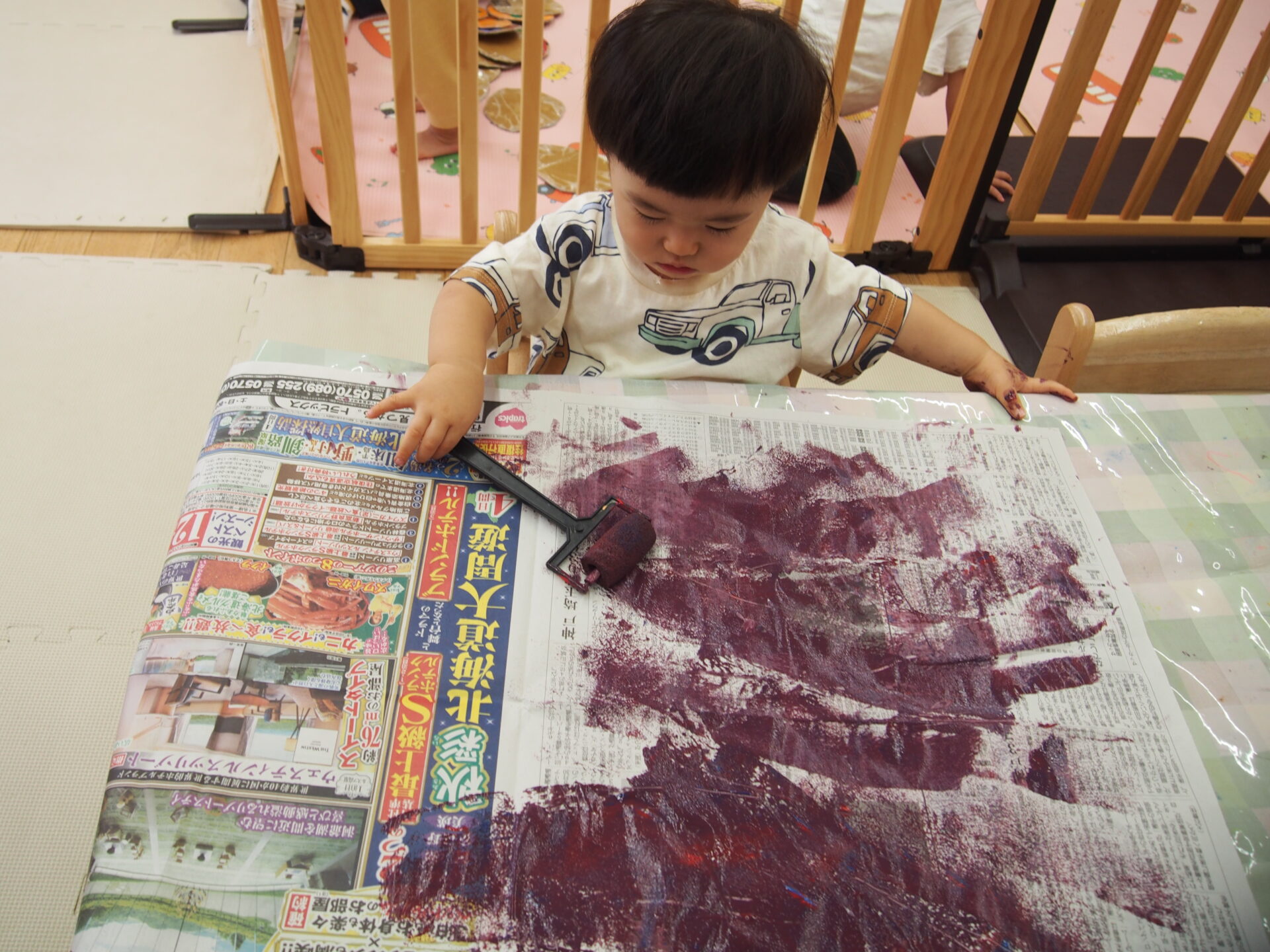 新聞紙にローラーを使って絵の具を塗りました。みんな大きく動かして塗ってくれました!