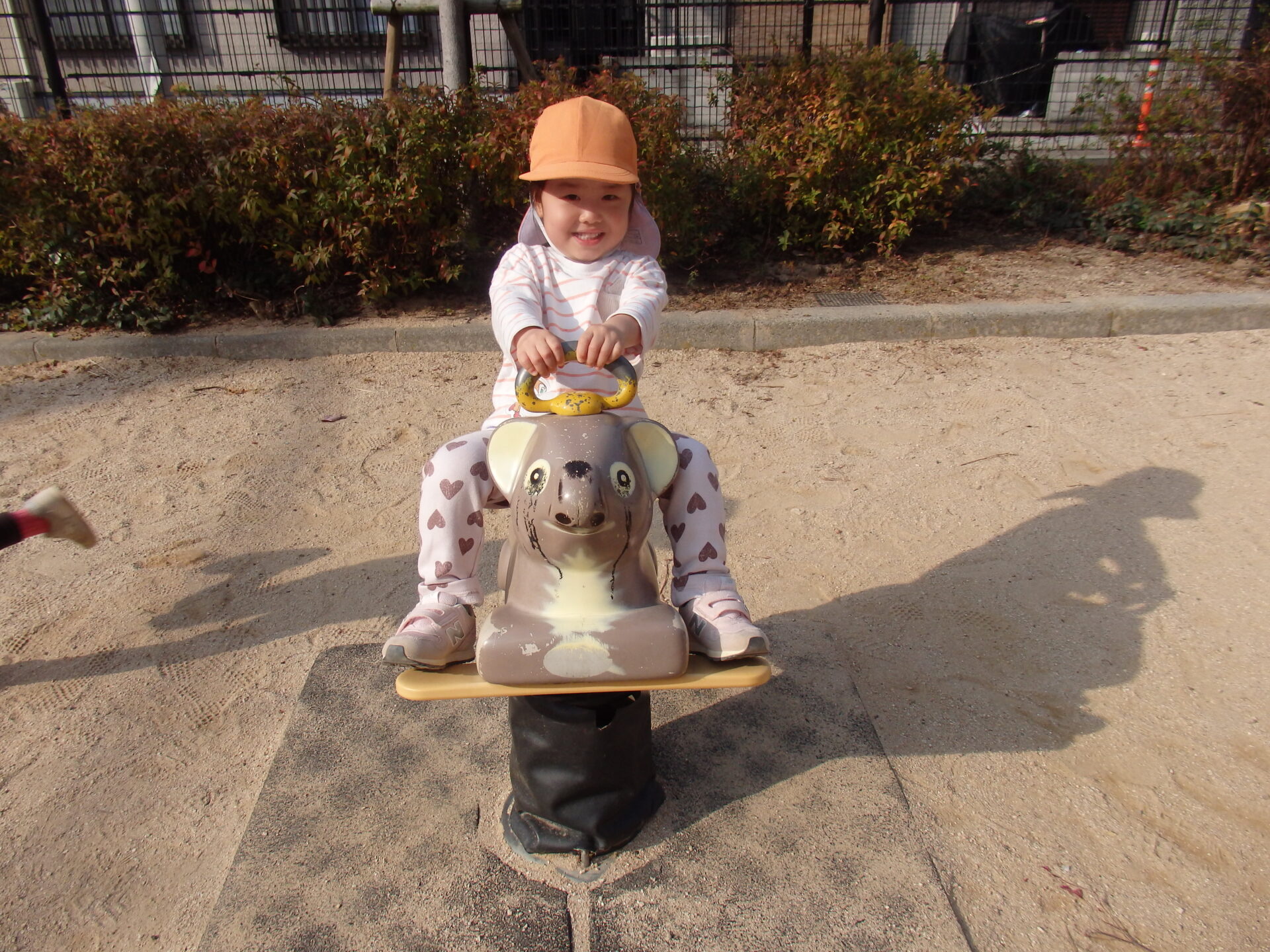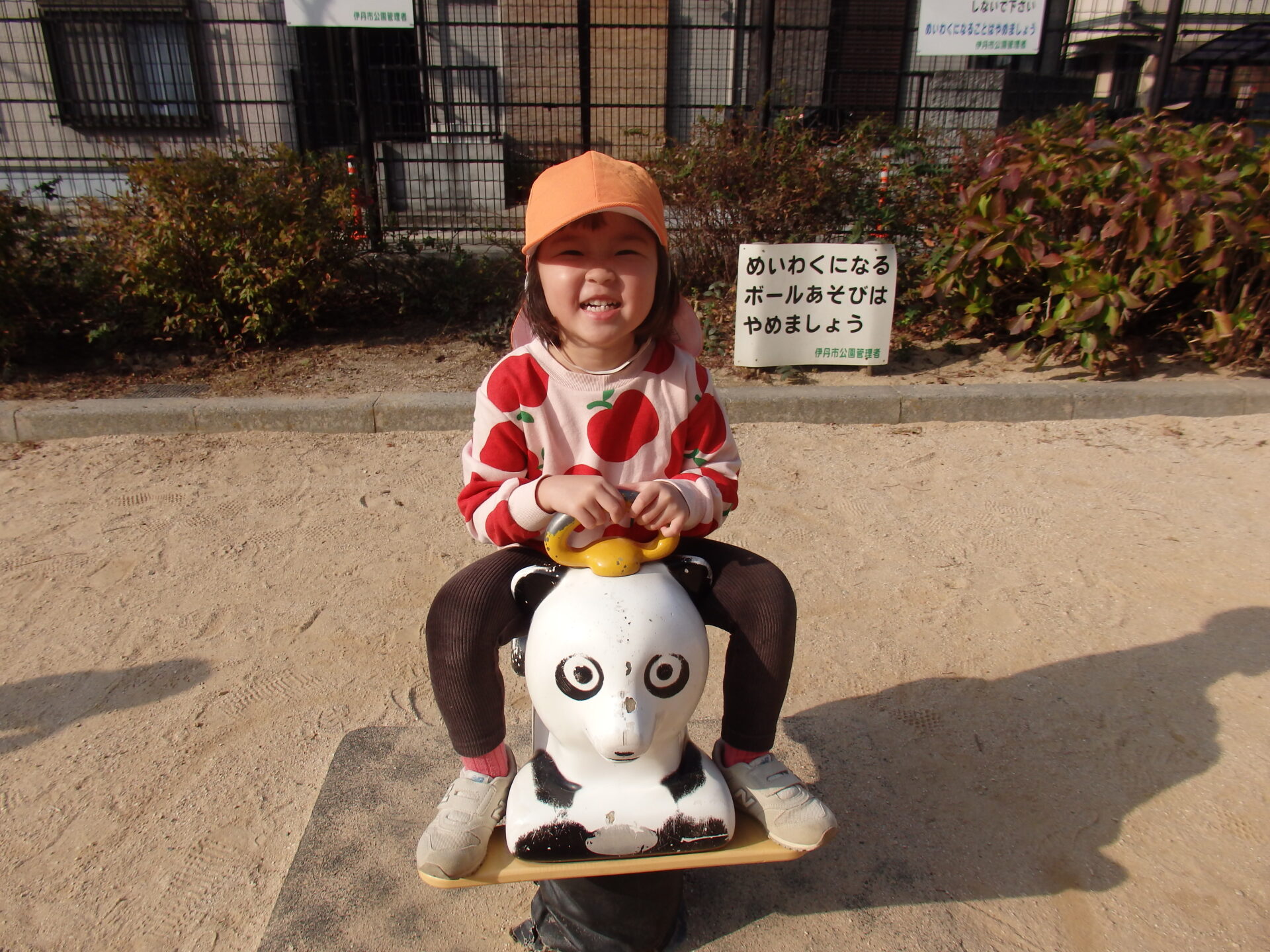 パンダやゾウのスプリング遊具にも乗って遊びました。「い〜ち、に〜、」と10まで数えてから、友だち同士で順番を交代して乗っていましたよ。成長を感じる一コマです。