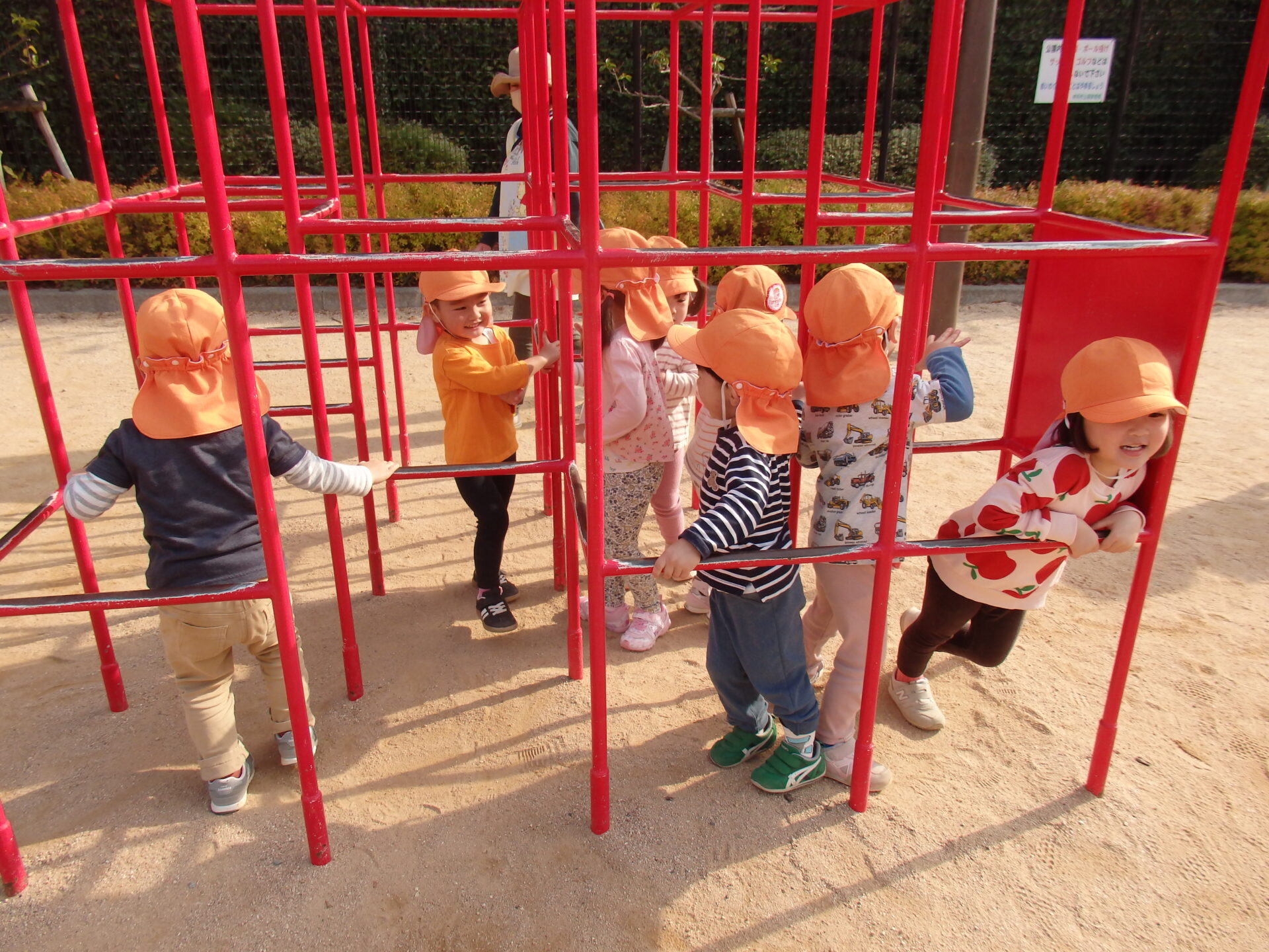 公園の真ん中にあるジャングルジムに全員集合!「せんせい!やっほー😊」と笑顔をのぞかせてくれていました。