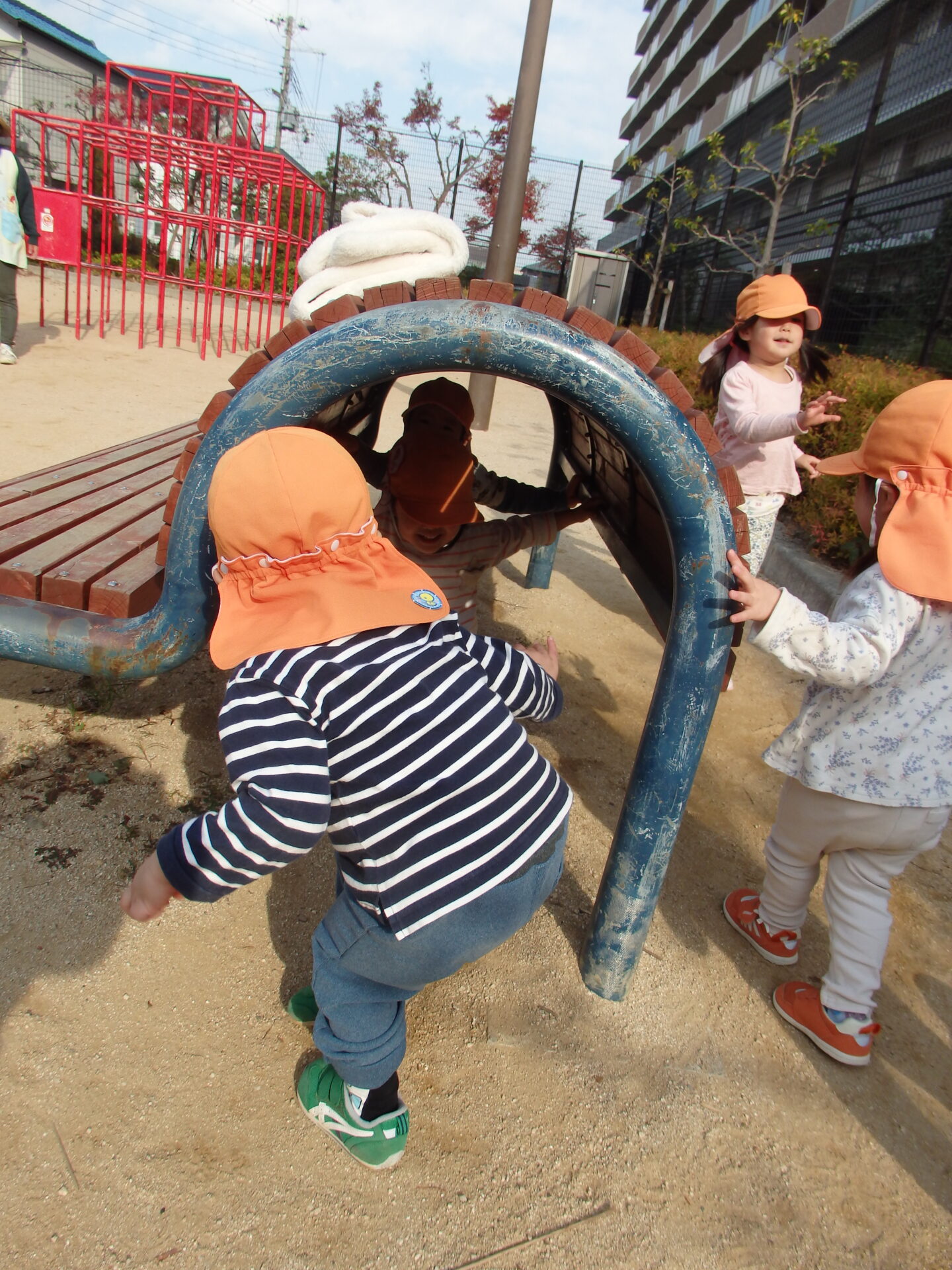 公園のベンチも遊び場になっていました。ベンチの下がちょうどトンネルのようになっていて、通り抜けて遊んでいました。