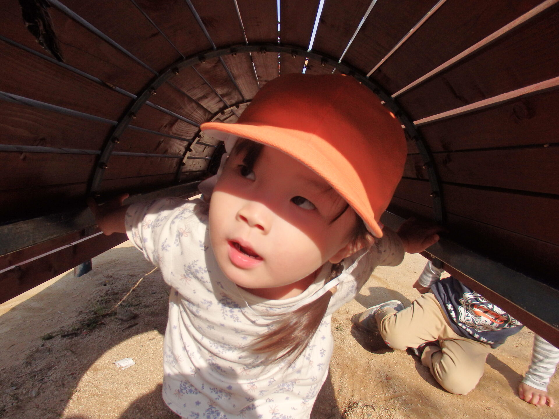 トンネルを通るだけでなく、お化けが向こうからやってくる!という設定や、オオカミから隠れよう!という設定など、子ども達が様々なお話を作り遊びを広げていました。