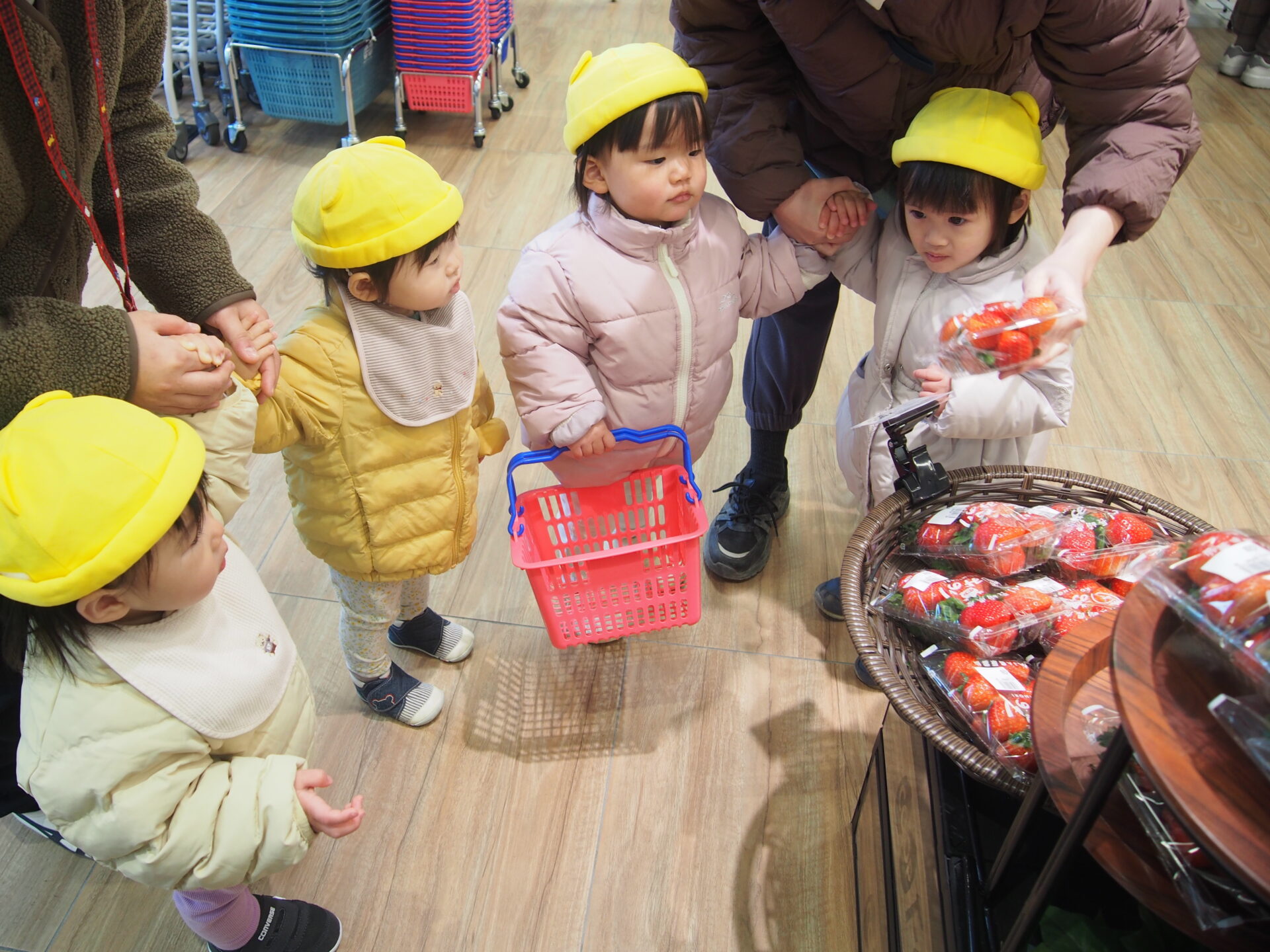初めてのスーパーにどきどき。保育者としっかり手を繋いで入店です〜‼︎