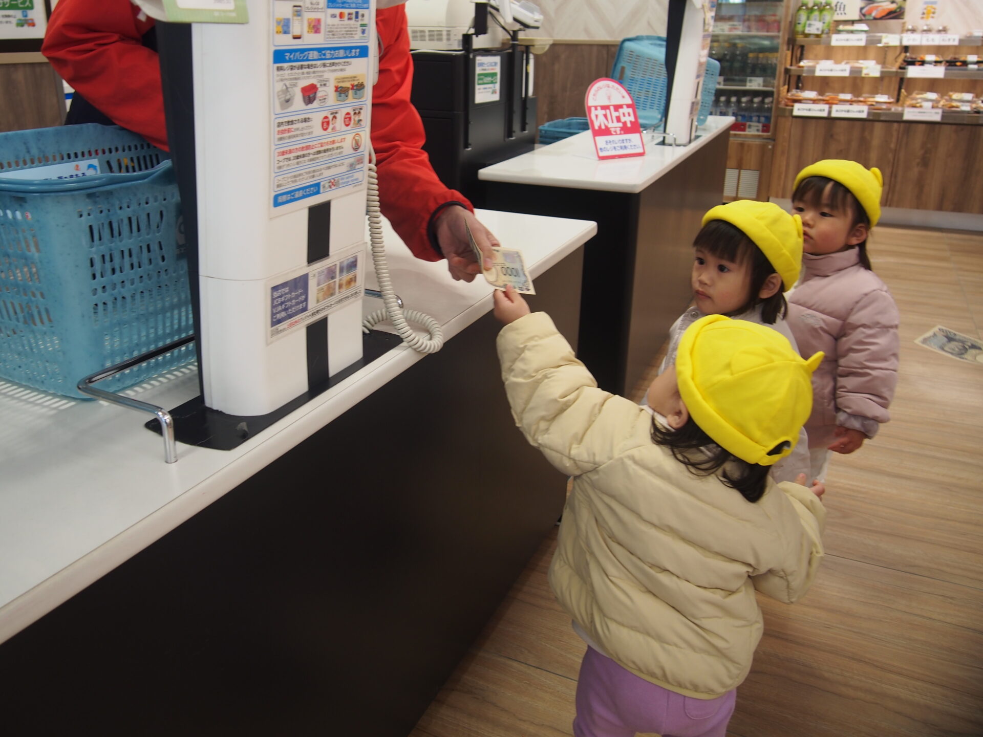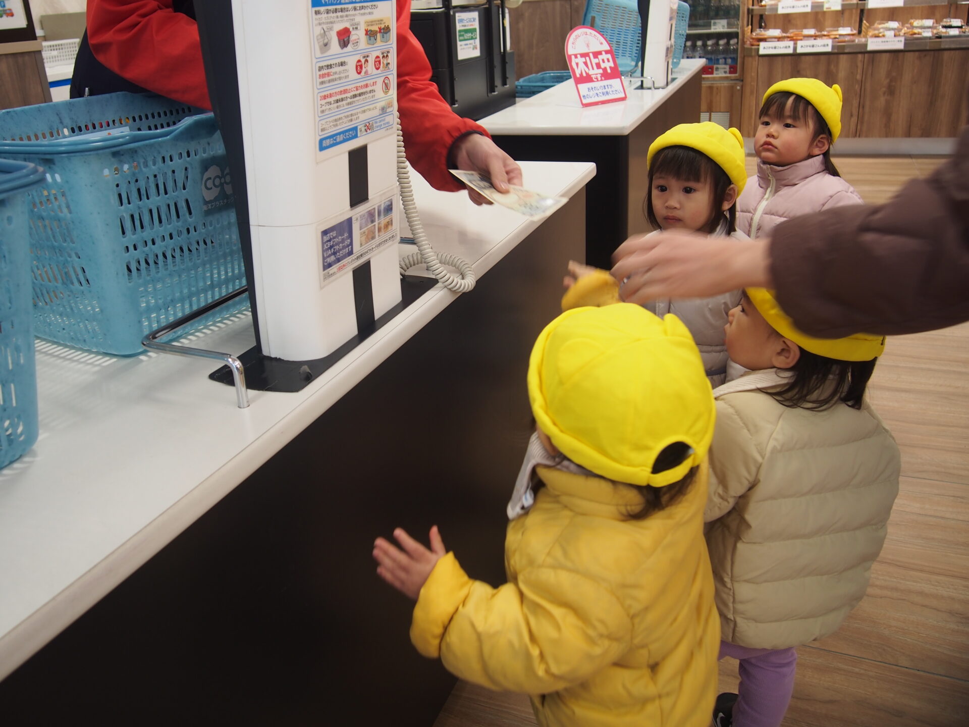 次は「ばなな」を見つけて、、「ばな〜‼︎」と口にしながらカゴに入れてくれました。棚から保育者と一緒に取るお友だち、カゴを持つお友だち、レジでお金を渡すお友だちに分かれてみんなで手分けをしてお買い物をしました♪