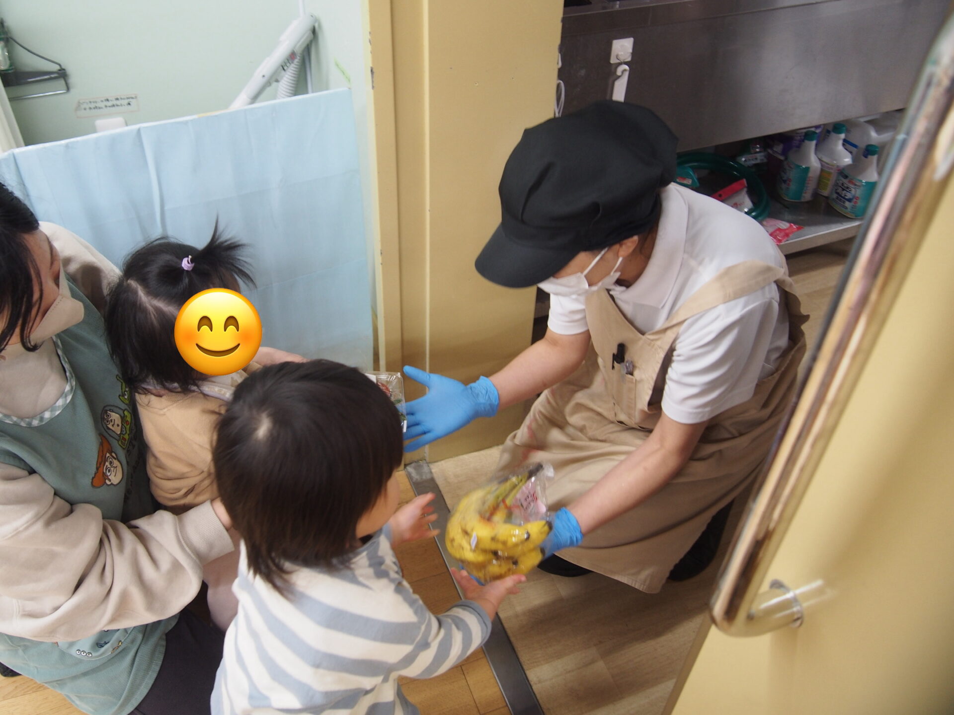 最後に保育園に帰って来て、調理の先生に「いちご」と「ばなな」を大事そうに抱えて渡しに行きました✨