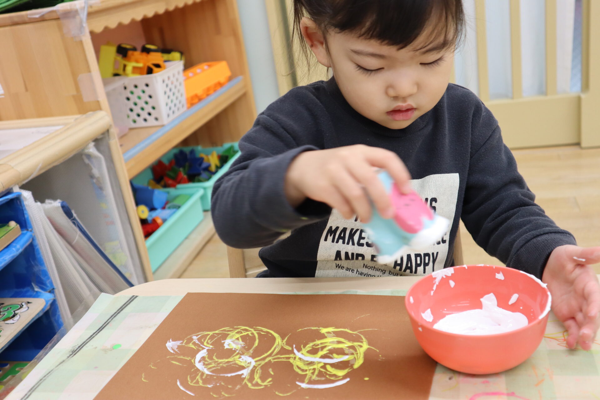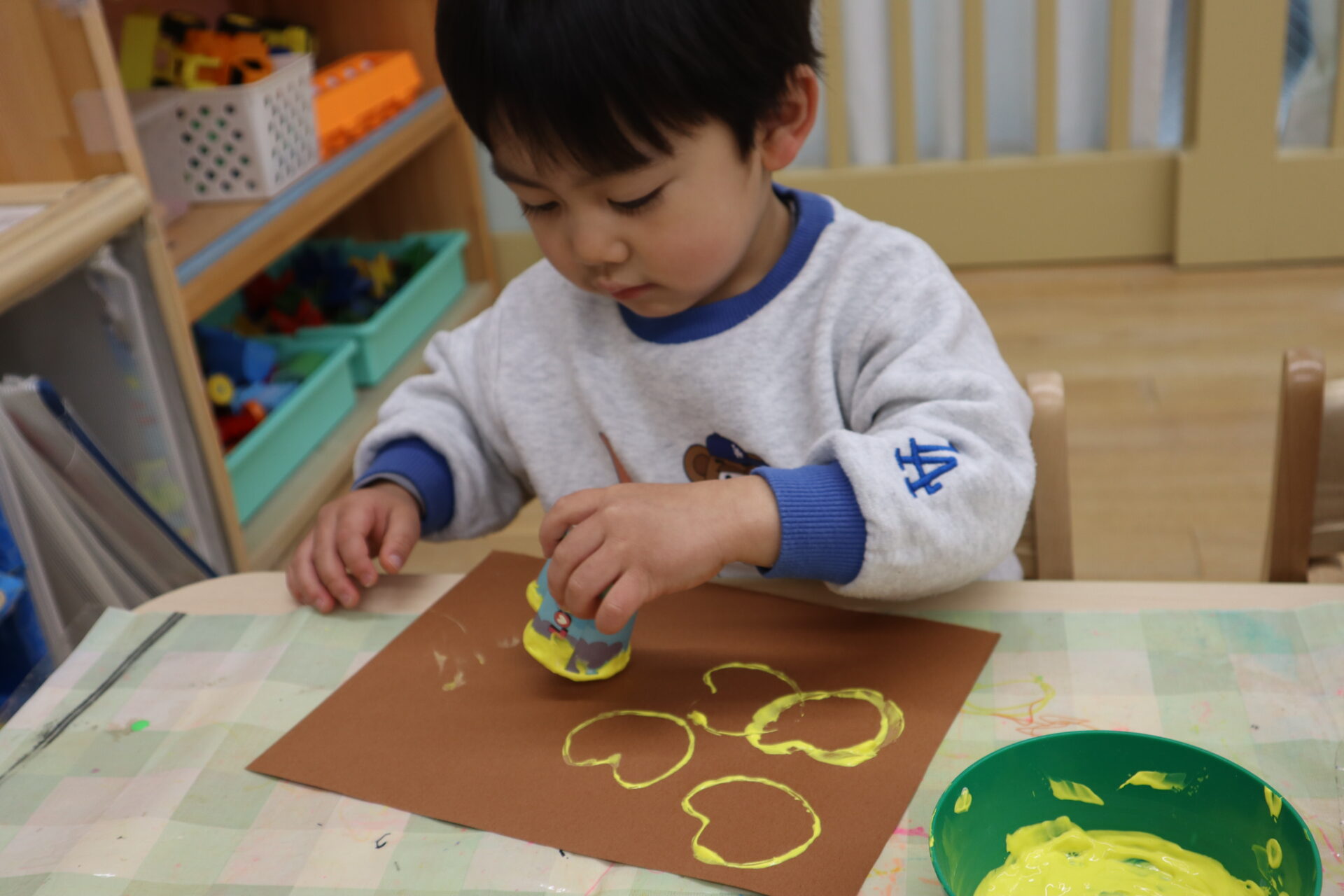 画用紙いっぱいにスタンプを押し色が付かなくなると「ちょんちょん」と言いながら絵の具を付けたくさんデコレーションをしていました。
