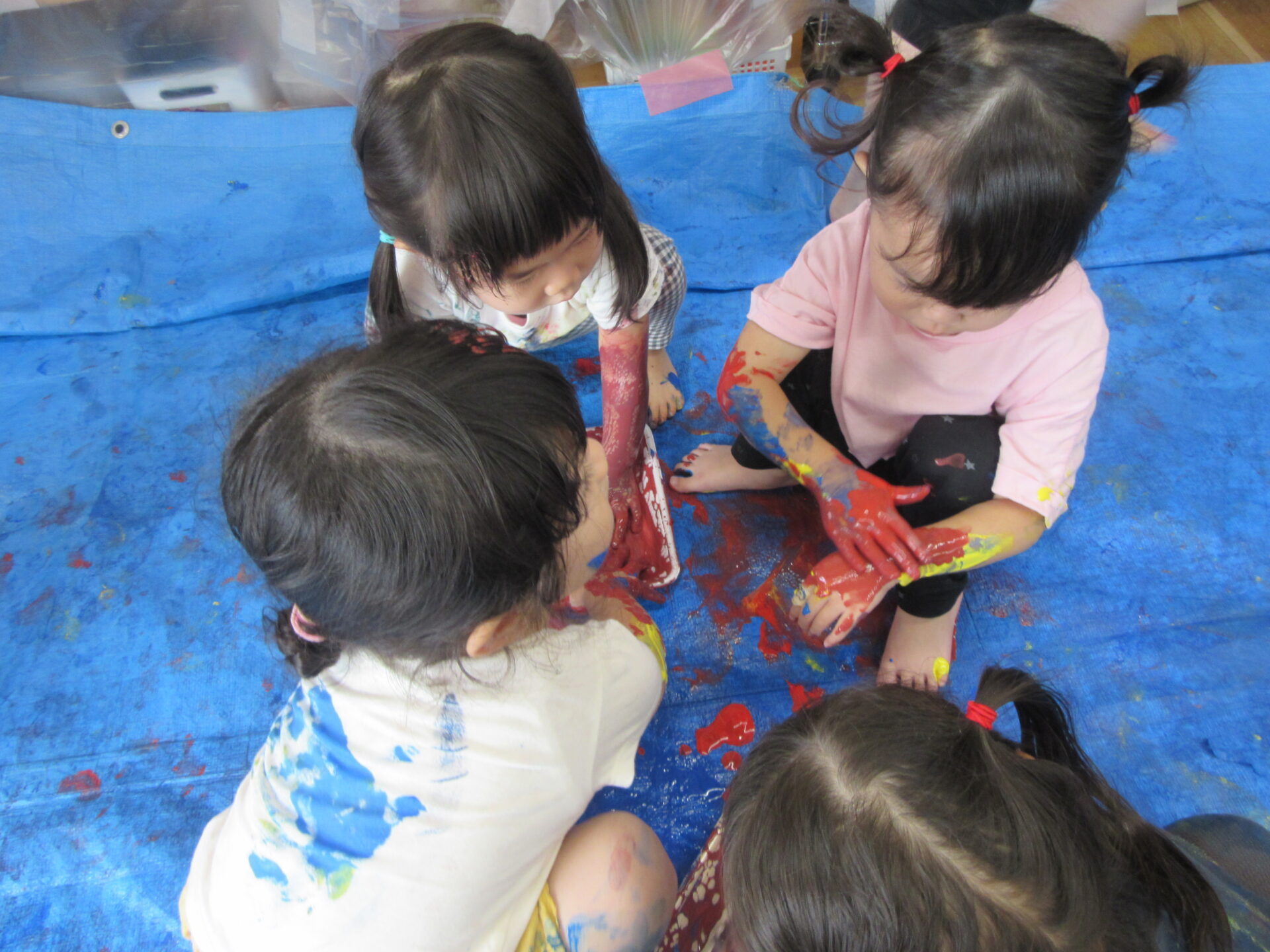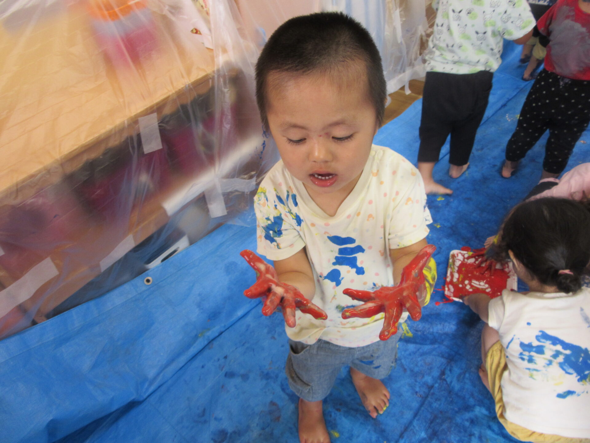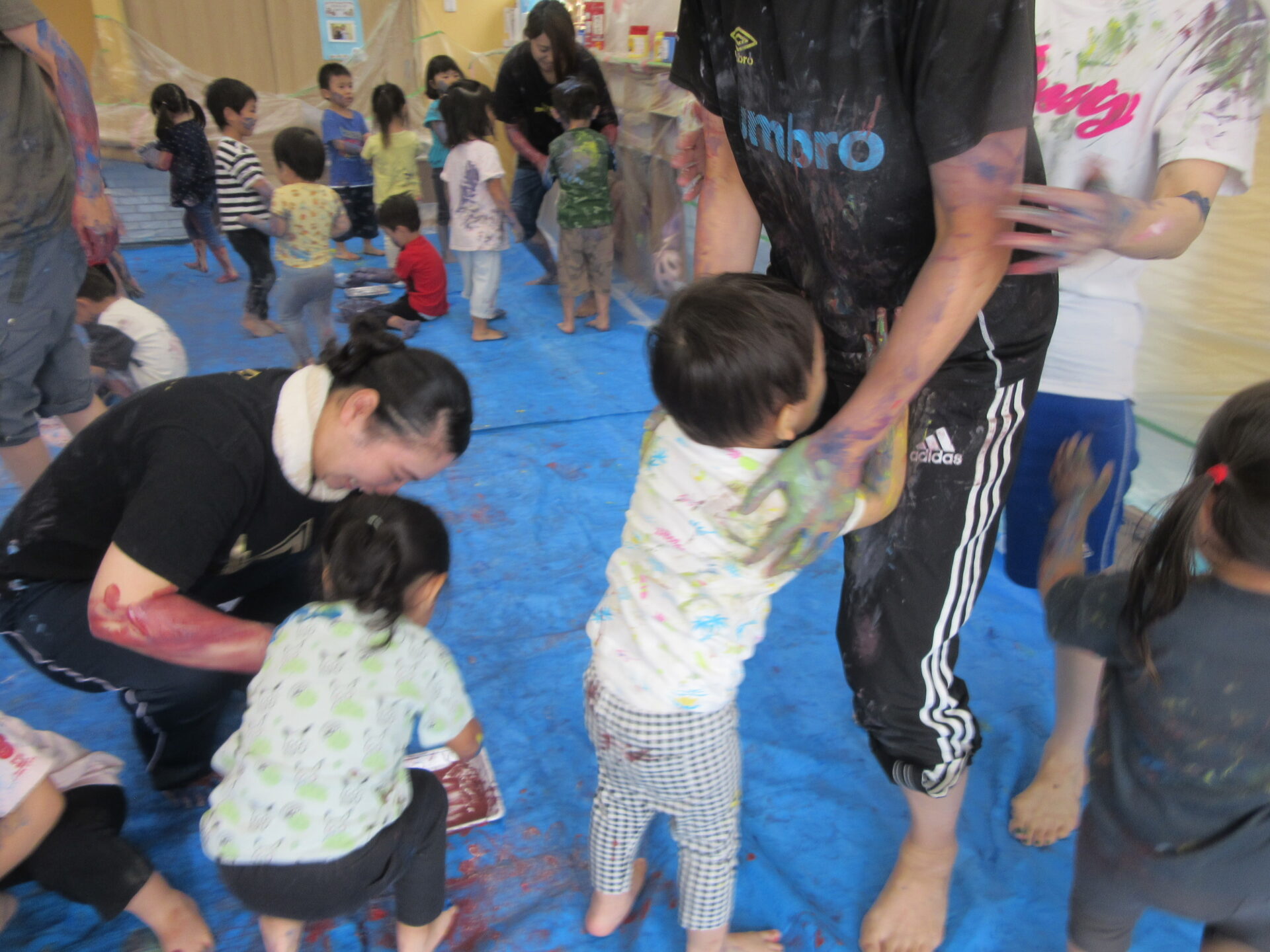 さっそく絵の具の感触に触れて、手で「ペタペタ」足につけて「ペタペタ」と普段ではできないようなことばかりで子どもたちは大はしゃぎ!