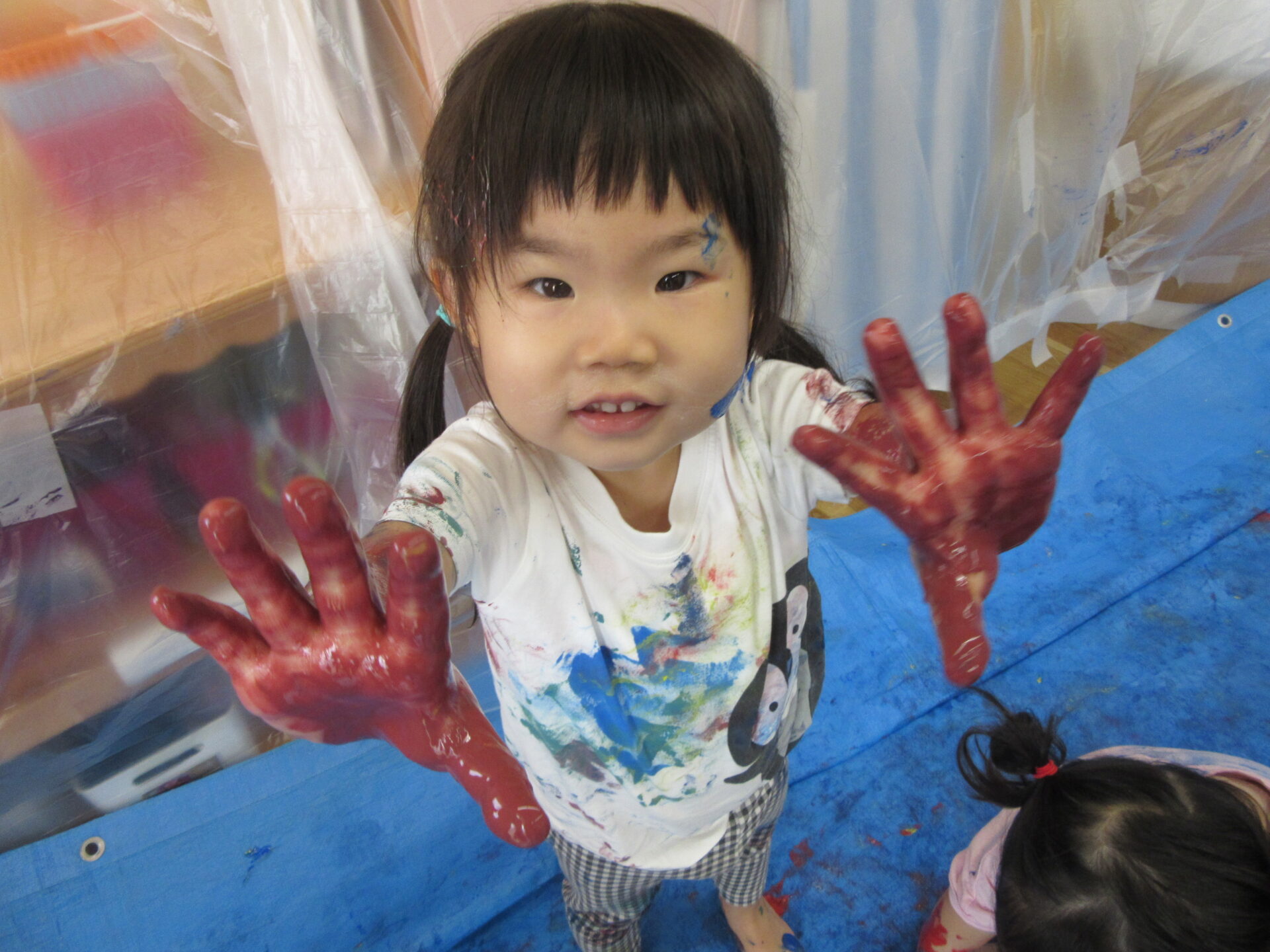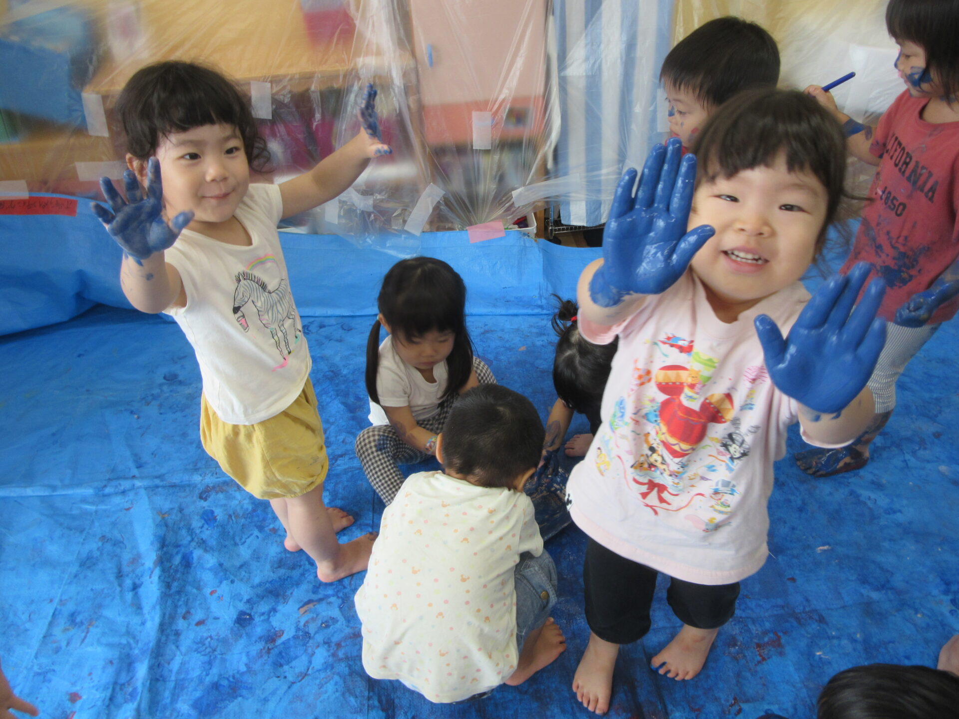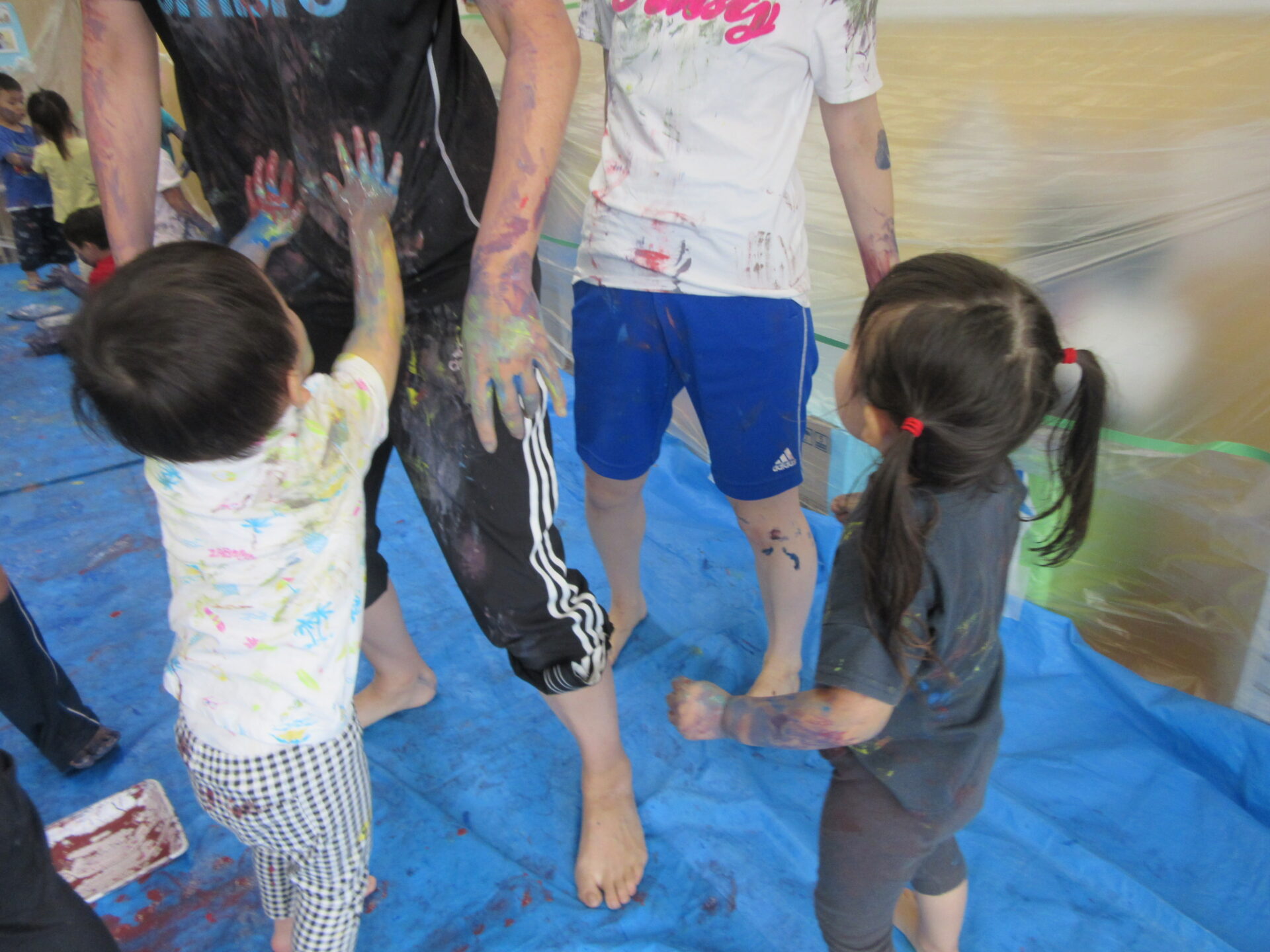 さっそく絵の具の感触に触れて、手で「ペタペタ」足につけて「ペタペタ」と普段ではできないようなことばかりで子どもたちは大はしゃぎ!