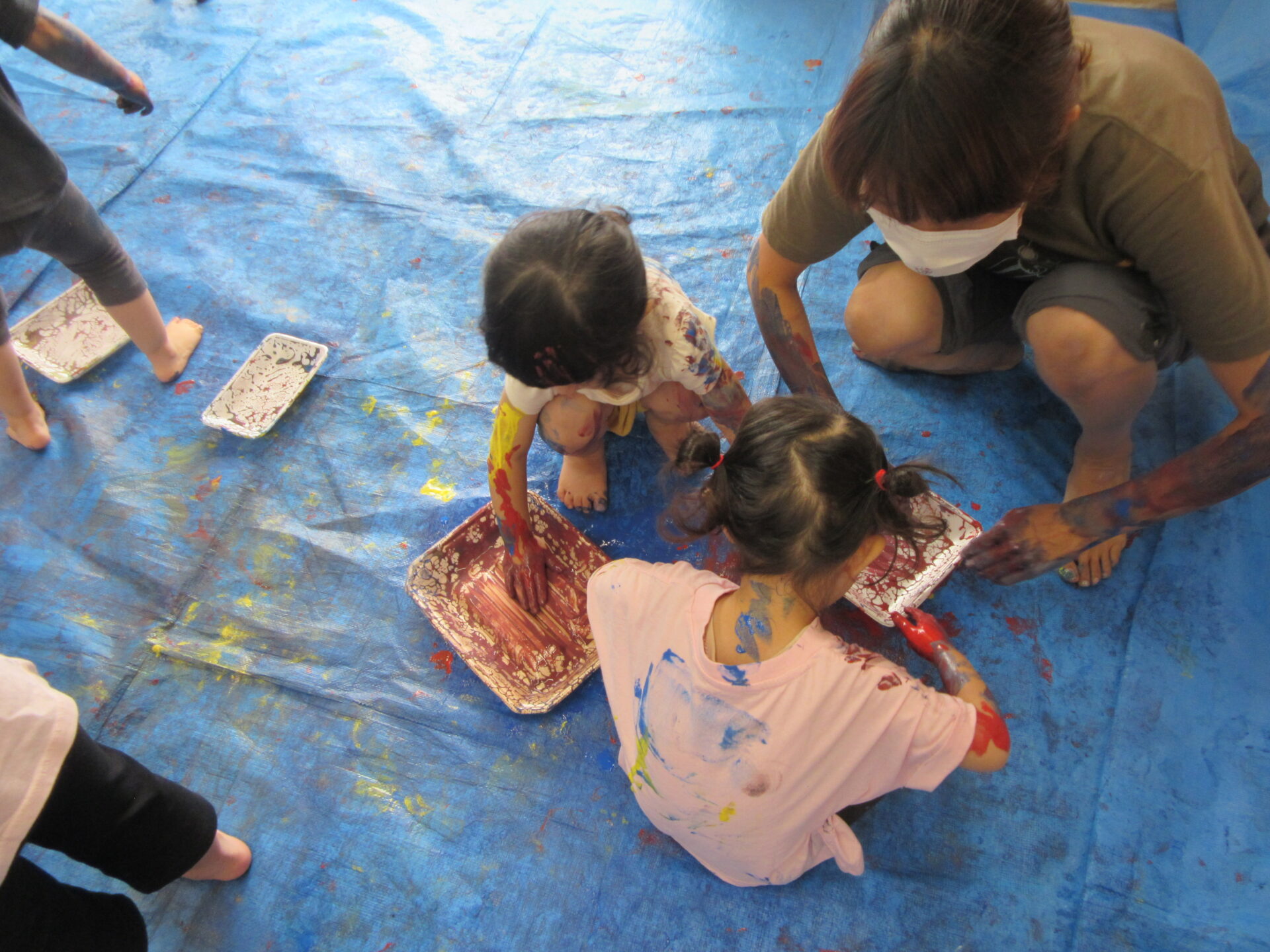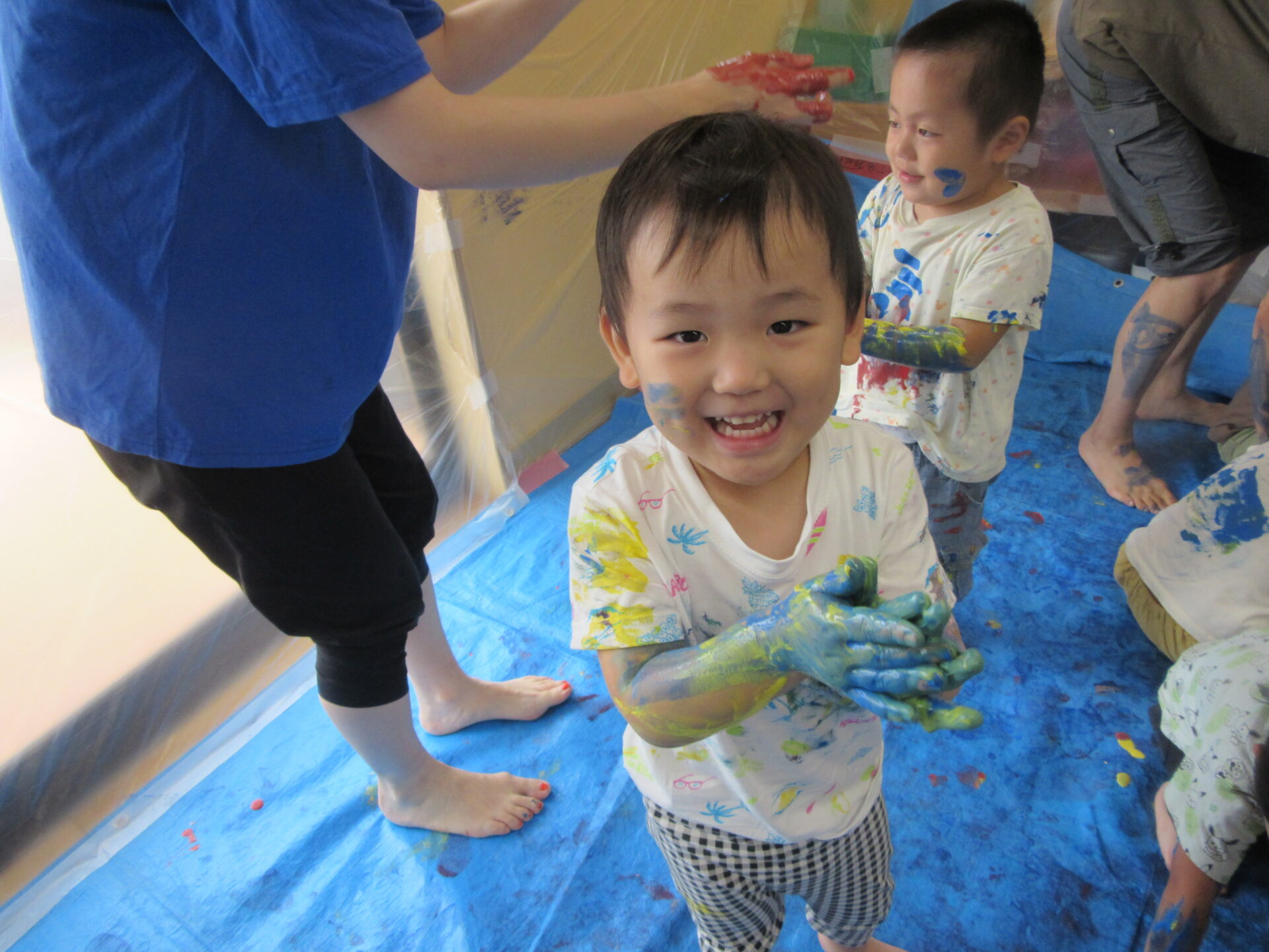 最後の絵の具までしっかり使い切り、みんなで「楽しかったね」「またしたいね」と友だちや保育者と話しながら初めてのボディペインティングを終わることができました。