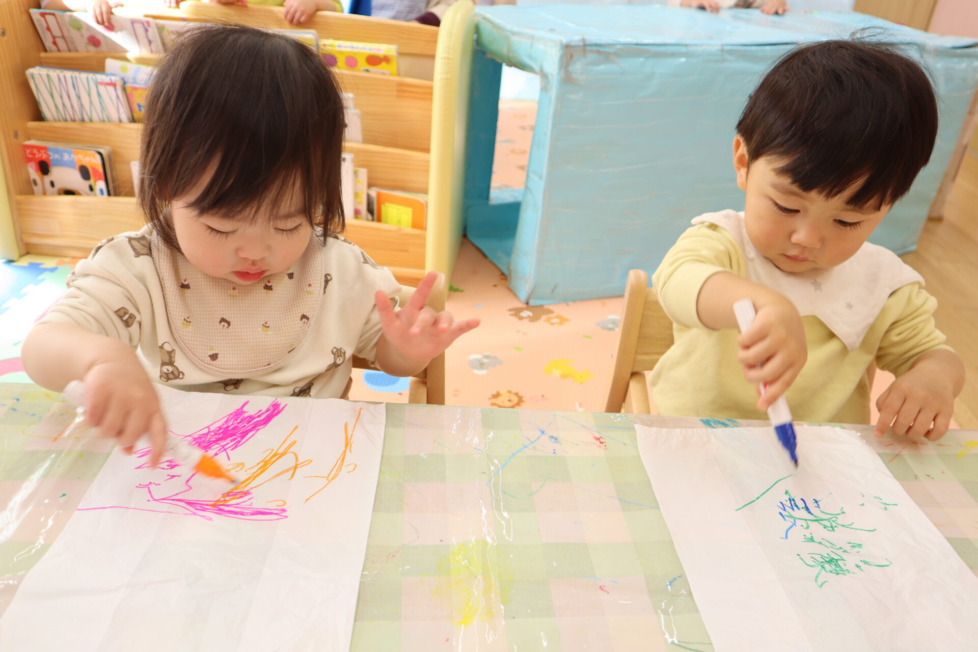 好きな色のマジックで凧に模様をつけるため、それぞれお絵かきを楽しみました。