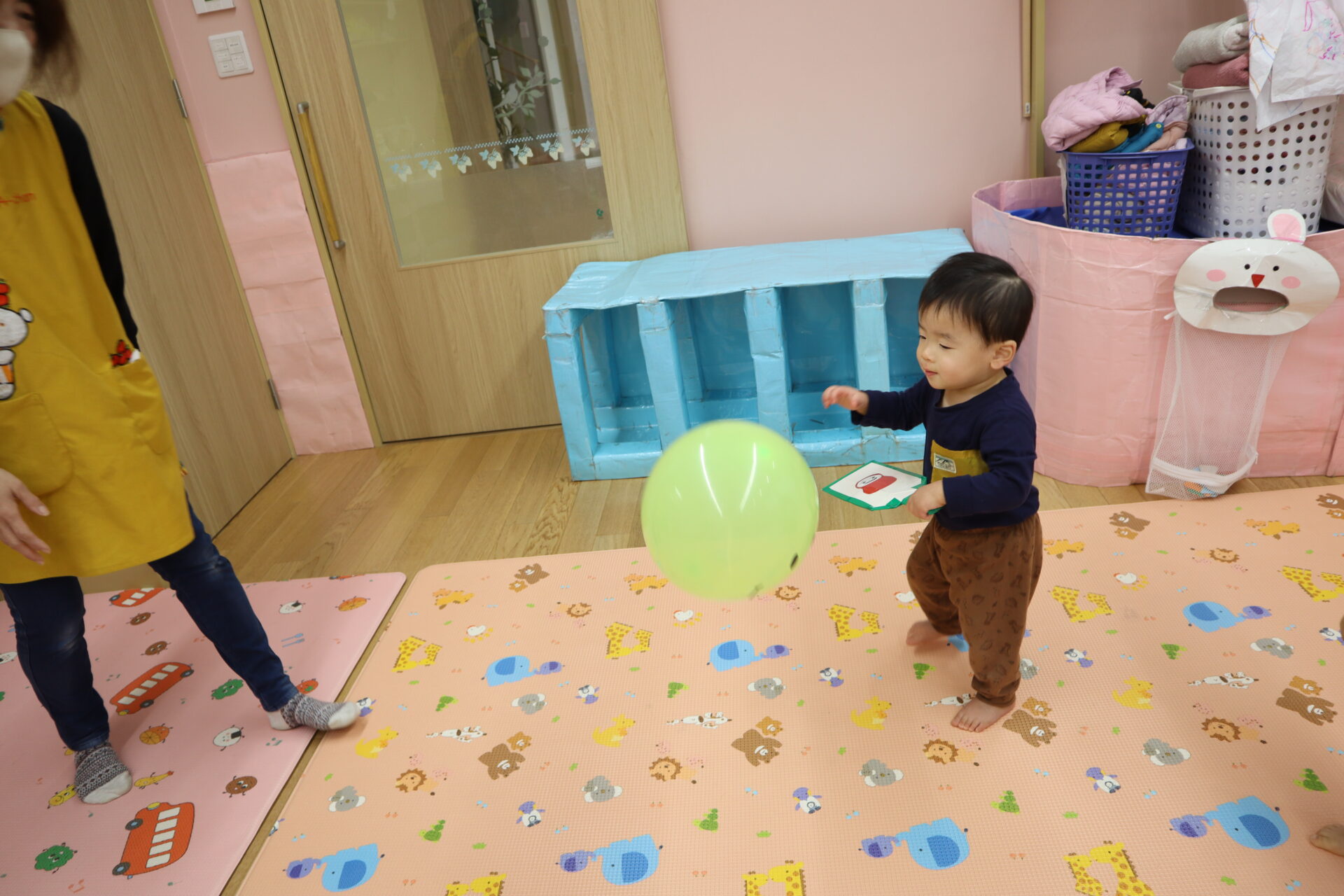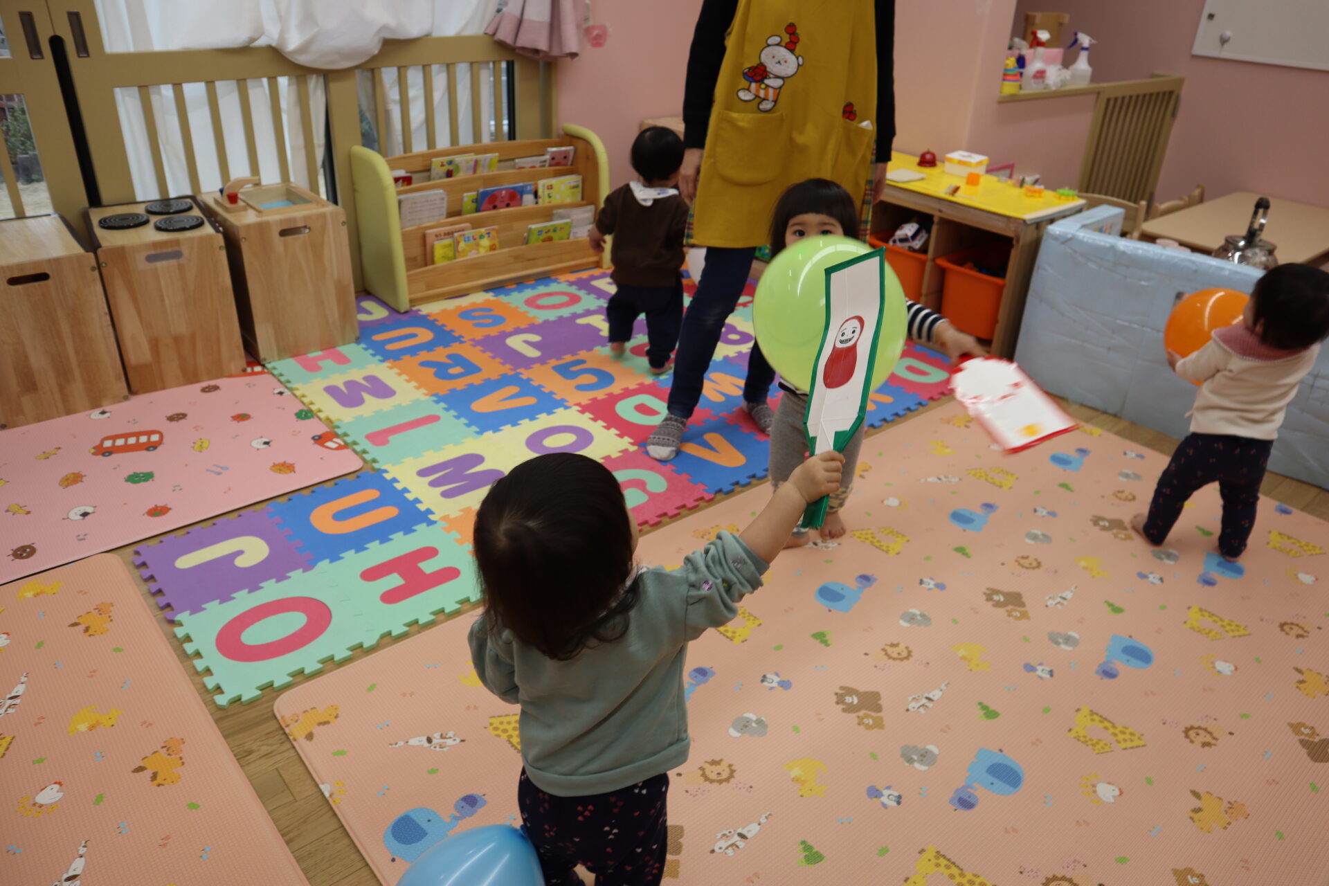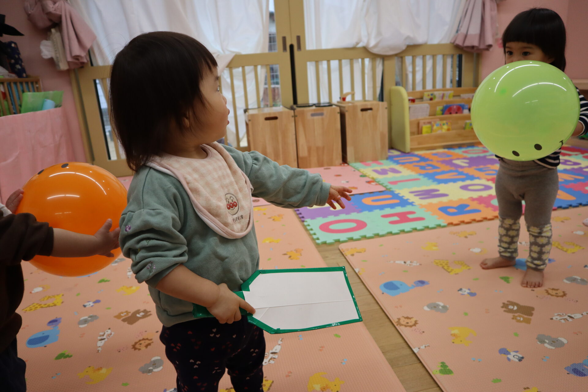 風船をめがけて羽子板を上手に振って、風船に当たると拍手して喜んでいました✨