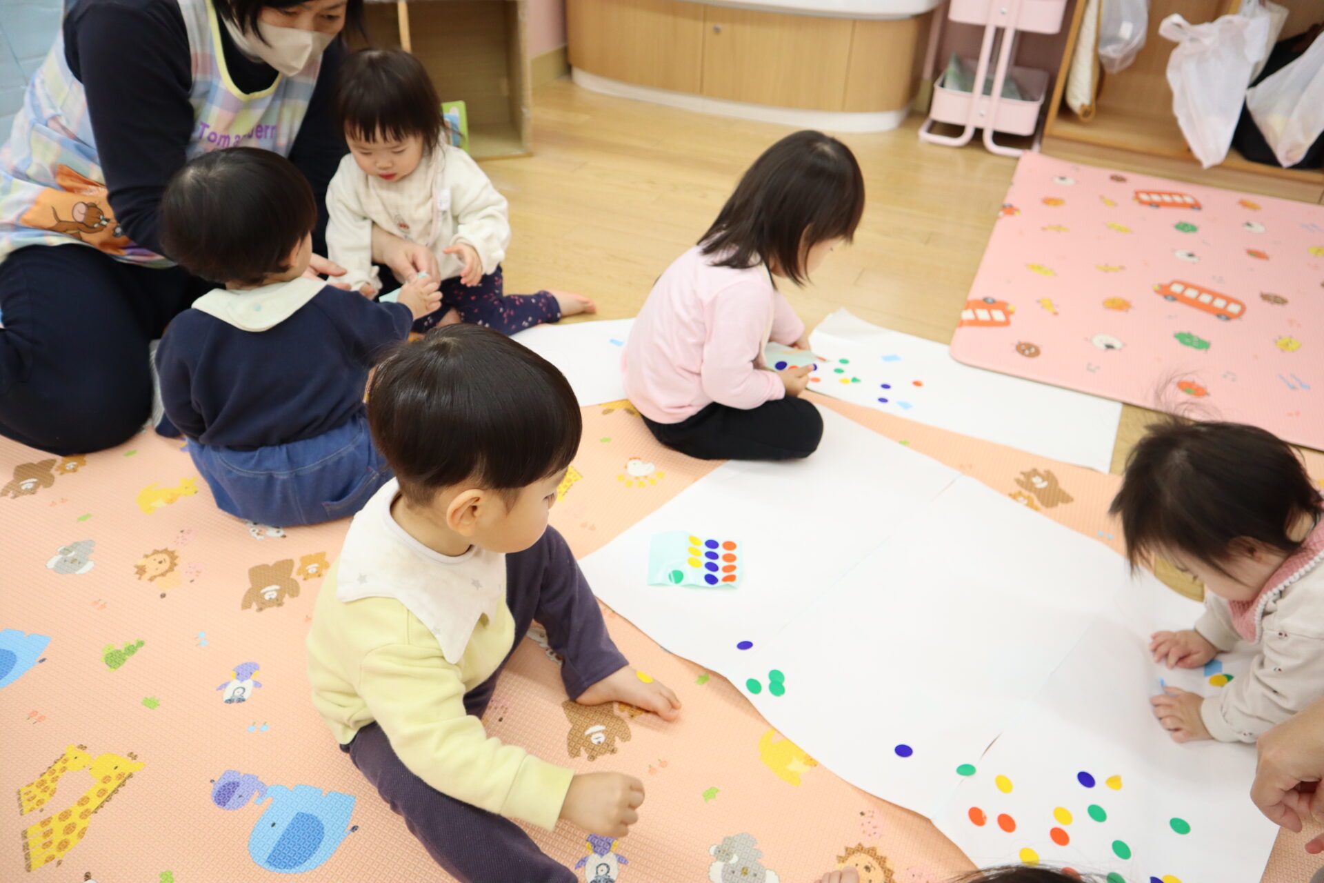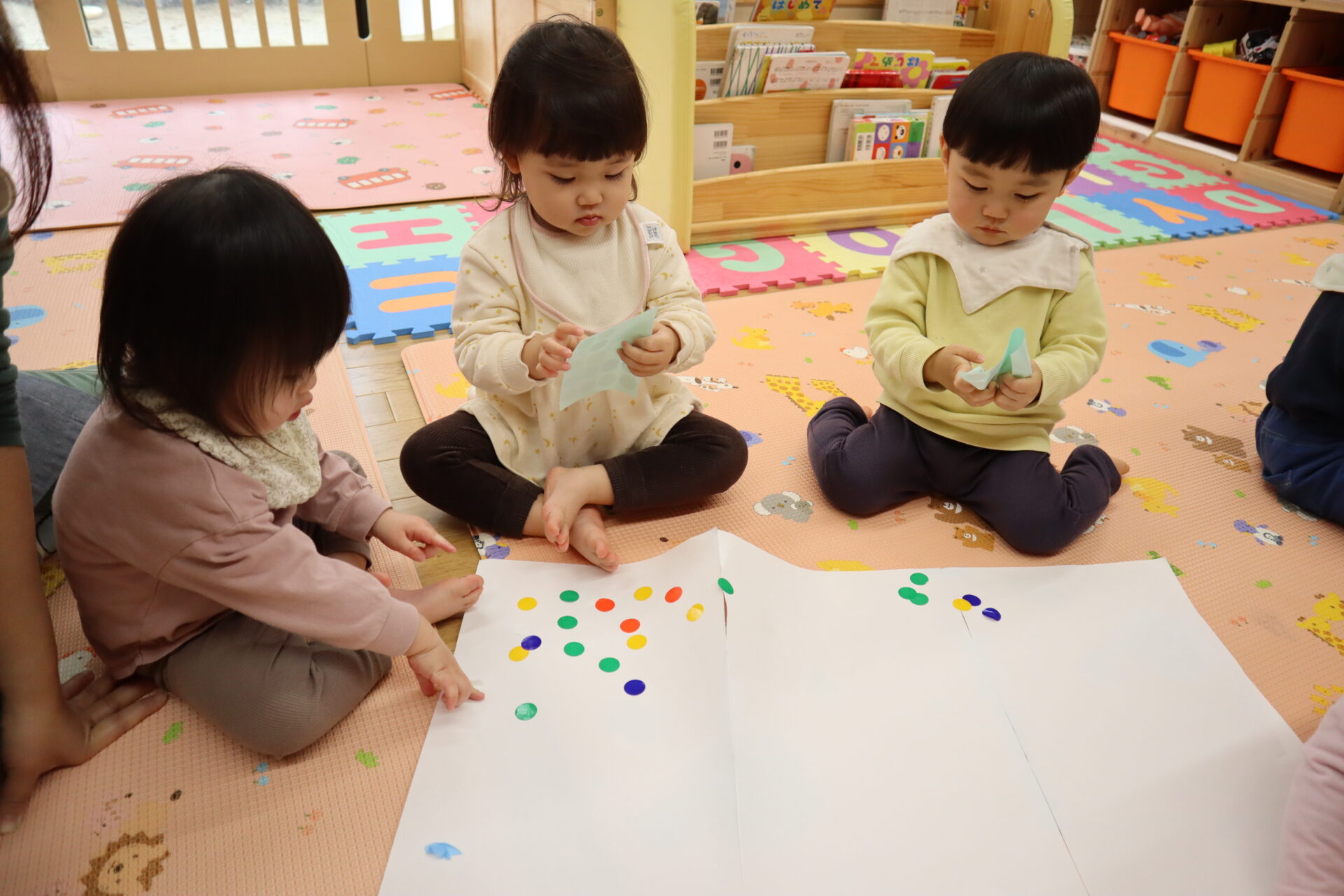 お友だちに「どうぞ」と渡したり、一度貼ったシールを剥がしたりしながら楽しんでいます。