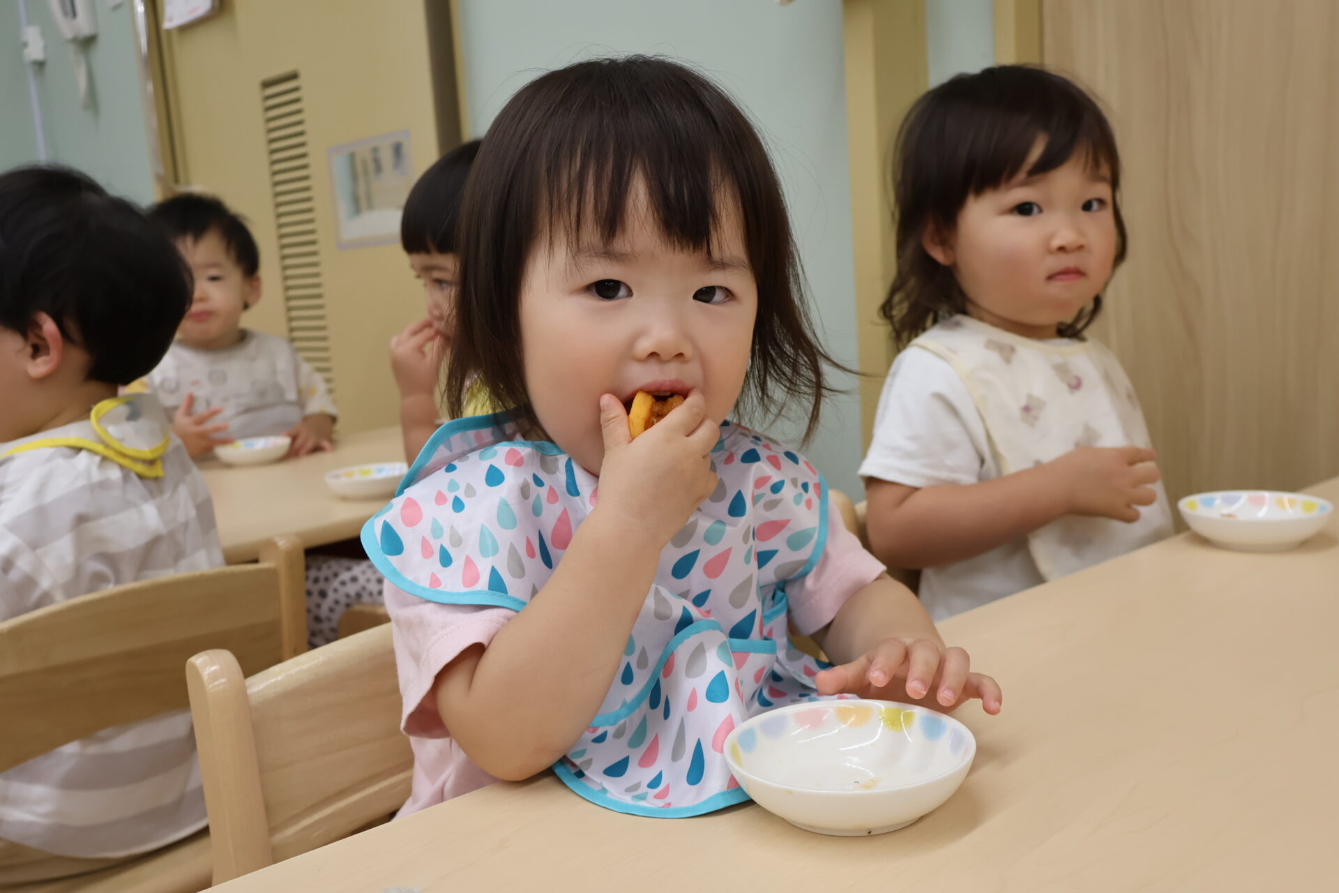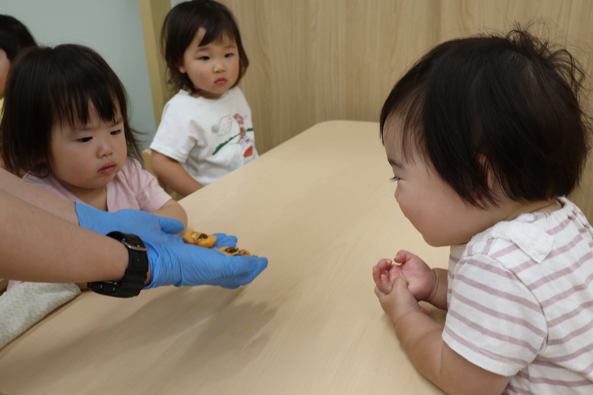 目も前で皮を剥いてみると、「わぁ~おいしそう!」と言い、目がキラキラしていました。