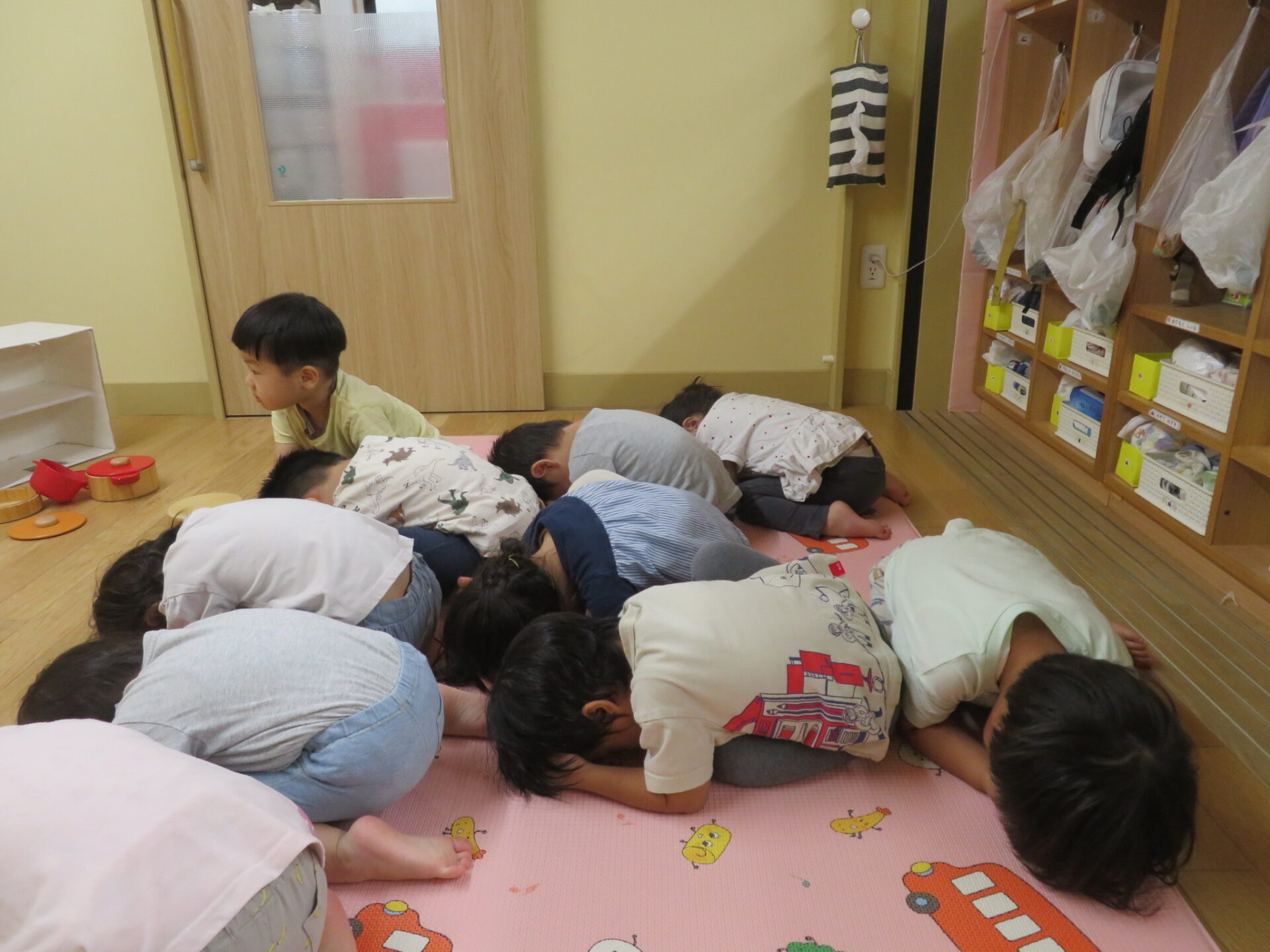 次に地震を想定した訓練では、「もし地震が来て地面がグラグラ揺れたり、棚の中のおもちゃが出てくることがあるかもしれないよ。こんな時、どうする?」と問いかけると子どもたちは頭上に何もなく安全で広い場所にいき「ダンゴムシポーズ」をして自分の頭や身体を上手に守ります。何度か訓練を繰り返し行うことで地震=ダンゴムシポーズという知識を子どもたちは持っています。