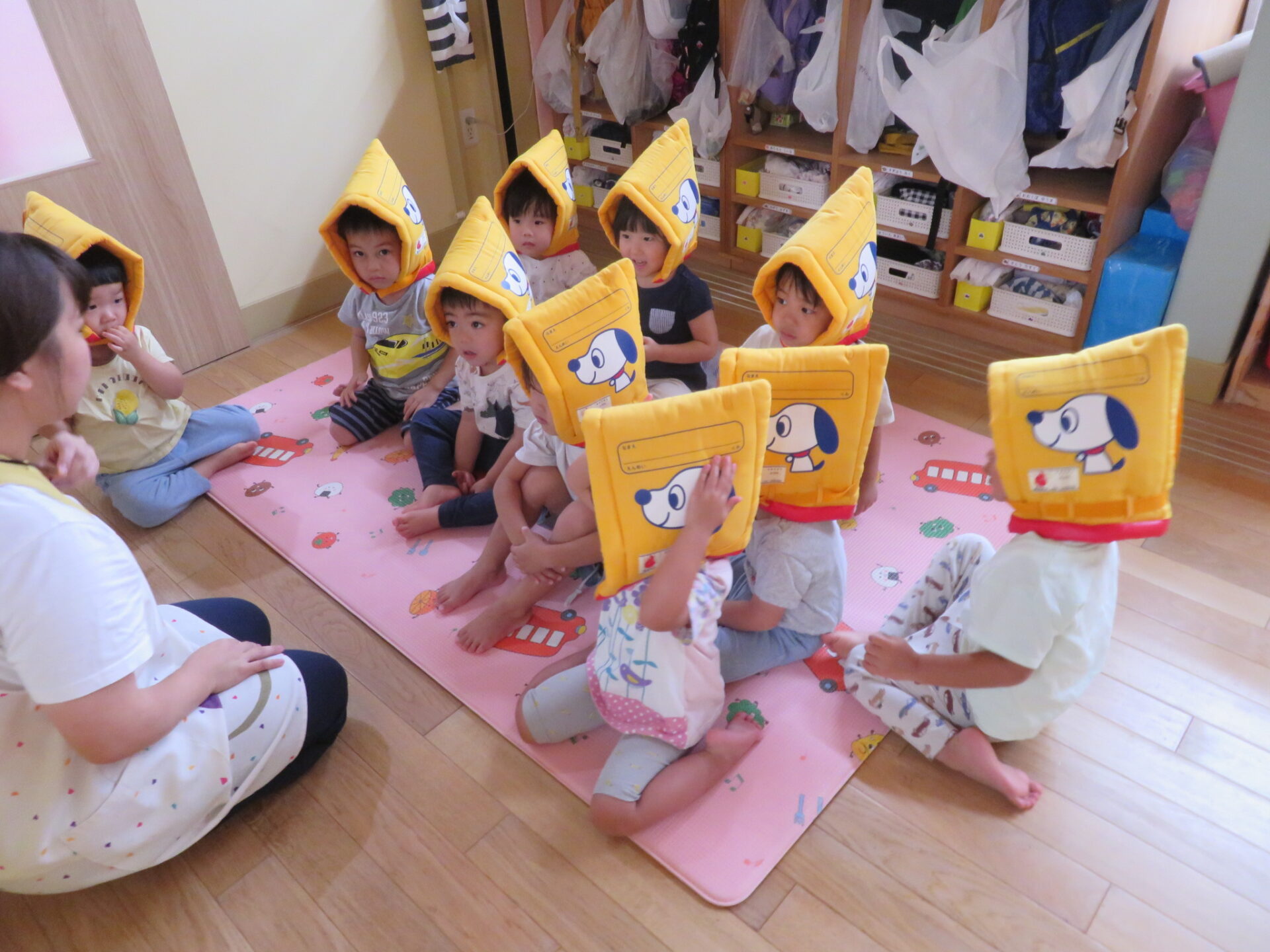 「これって帽子?」「犬が描いてあるよ」「なんで黄色いん?」と思い思いに言葉を口にしていた子どもたち。