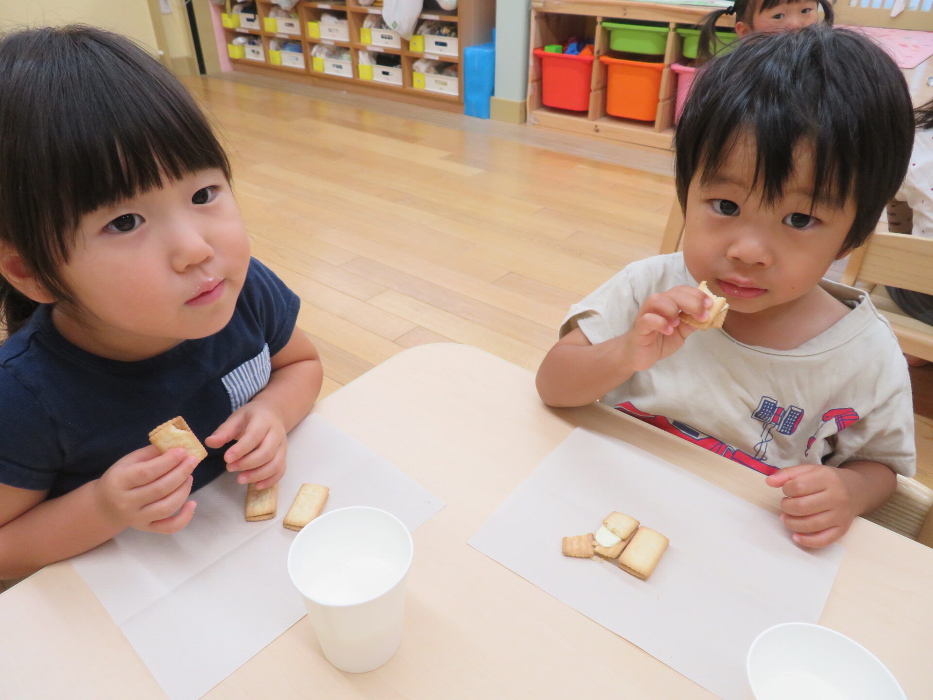 この日のおやつは非常食体験を行いました。今回はビスコをペーパータオルで牛乳を紙コップを使用し、いつもの使っているお皿やコップと違い食べにくさはあったと思いますが、上手に食べる・飲むことができました。