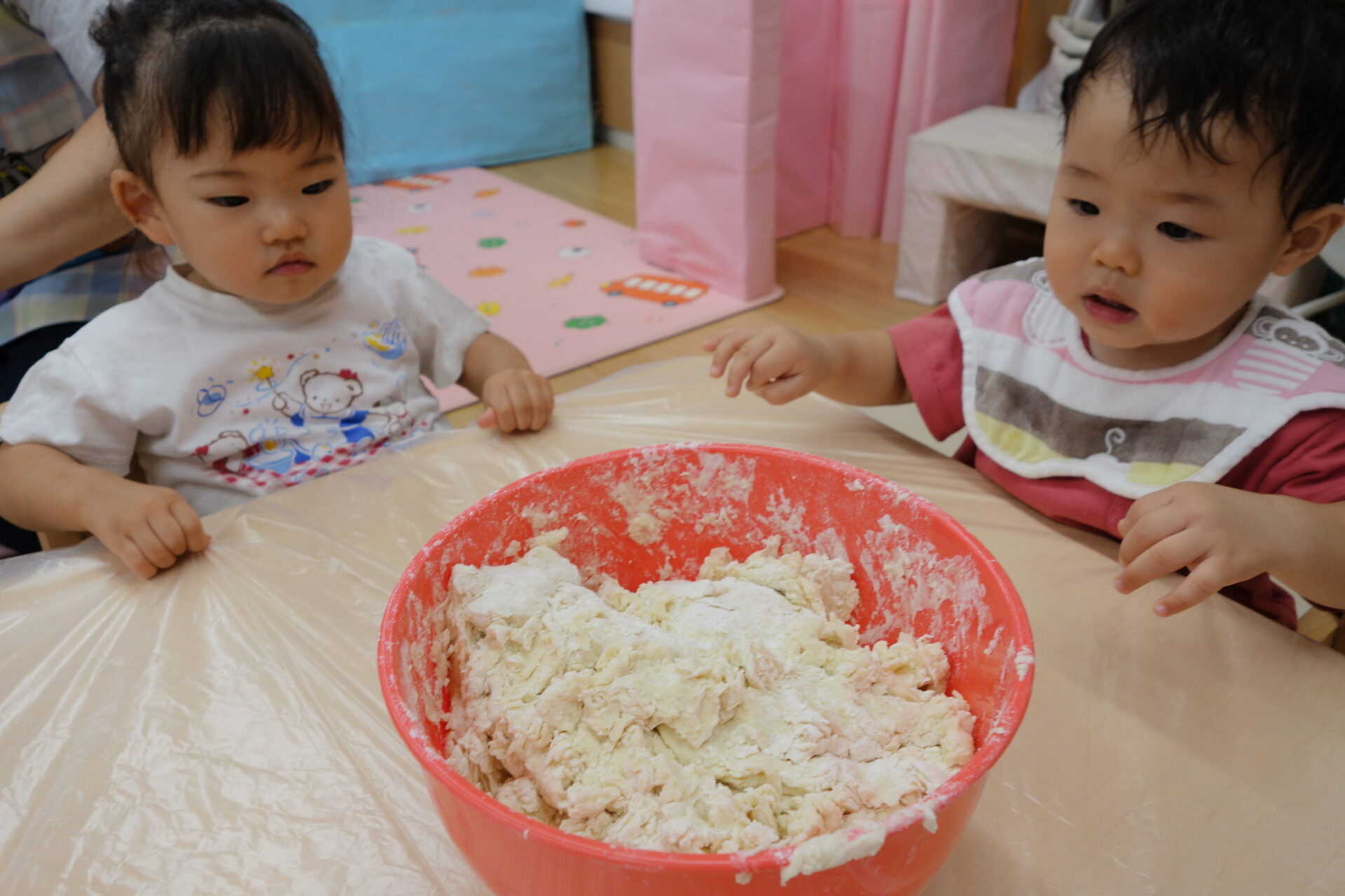 「揉み揉み」「よいしょっ」と言いながら、みんなで一生懸命に生地を作っています。