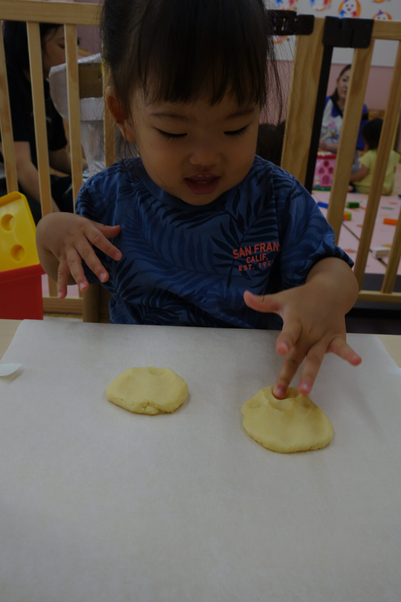 生地を伸ばして、「ペタペタ」と言いながら保育士と一緒に、様々な形を作って自分だけのクッキーが完成しました。
