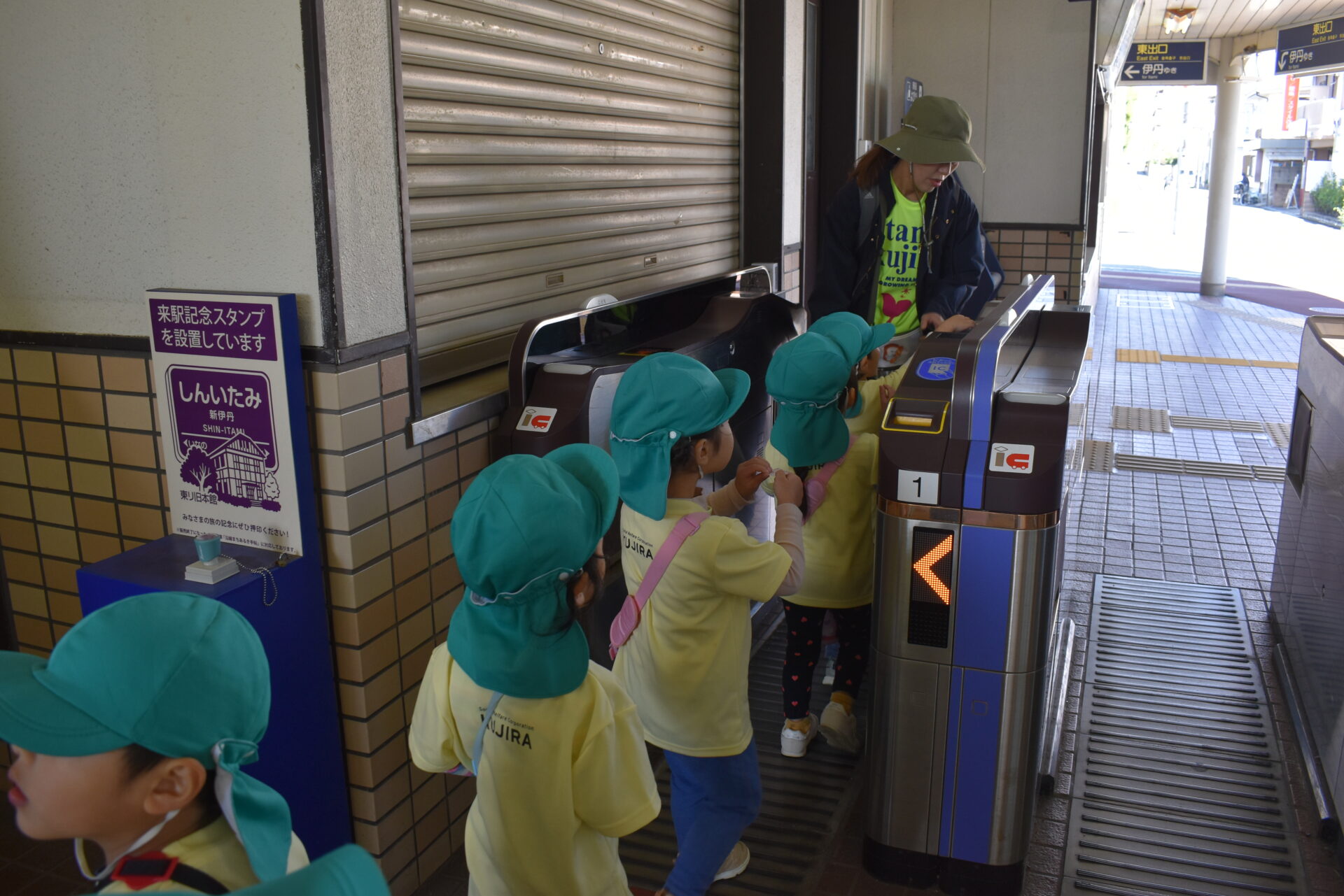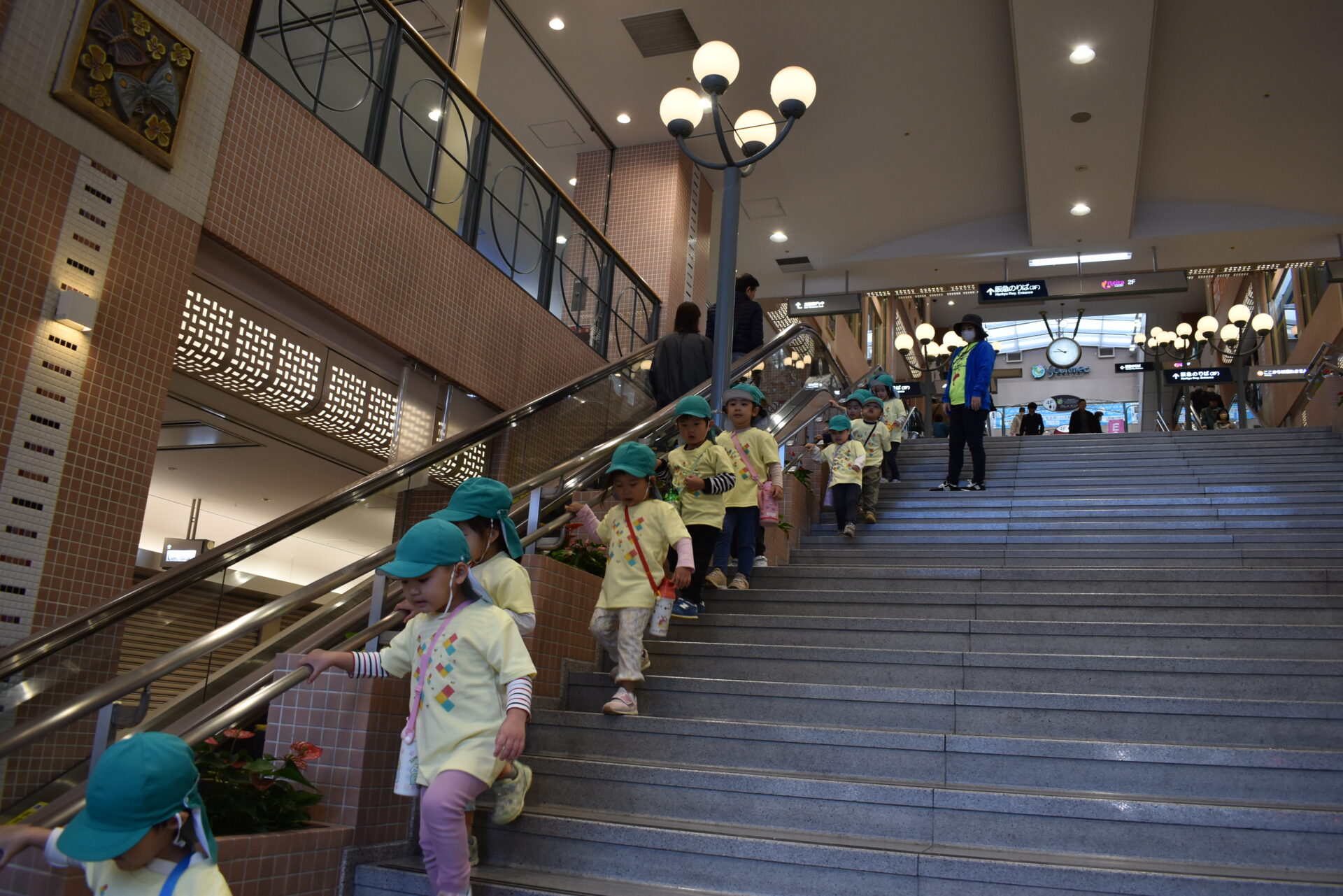 伊丹駅から長い階段を慎重に降りる子ども達。手すりをちゃんと持って順番に降りました。