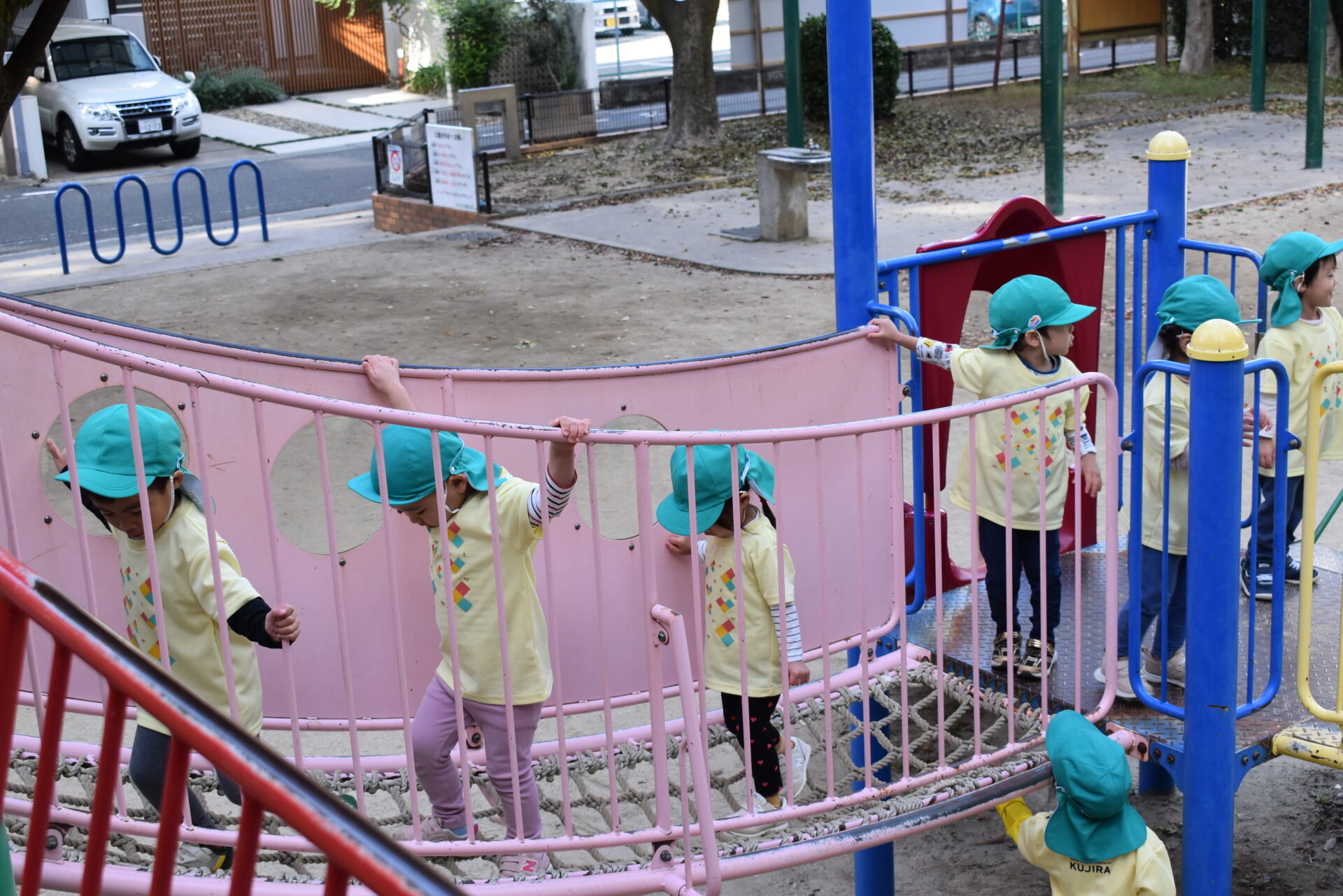 魅力的な遊具に早く遊びたい気持ちやワクワクが止まりませんが、公園内での約束事を聞いてから。
