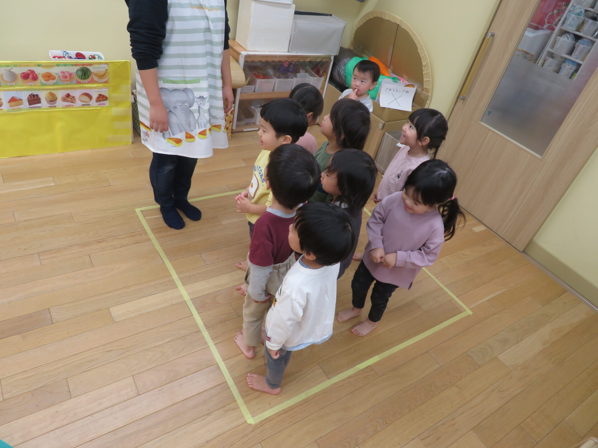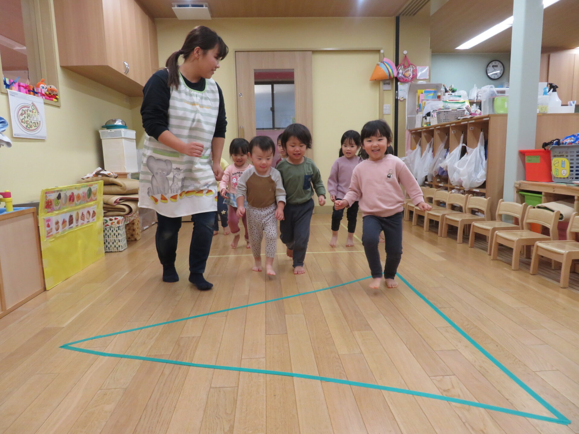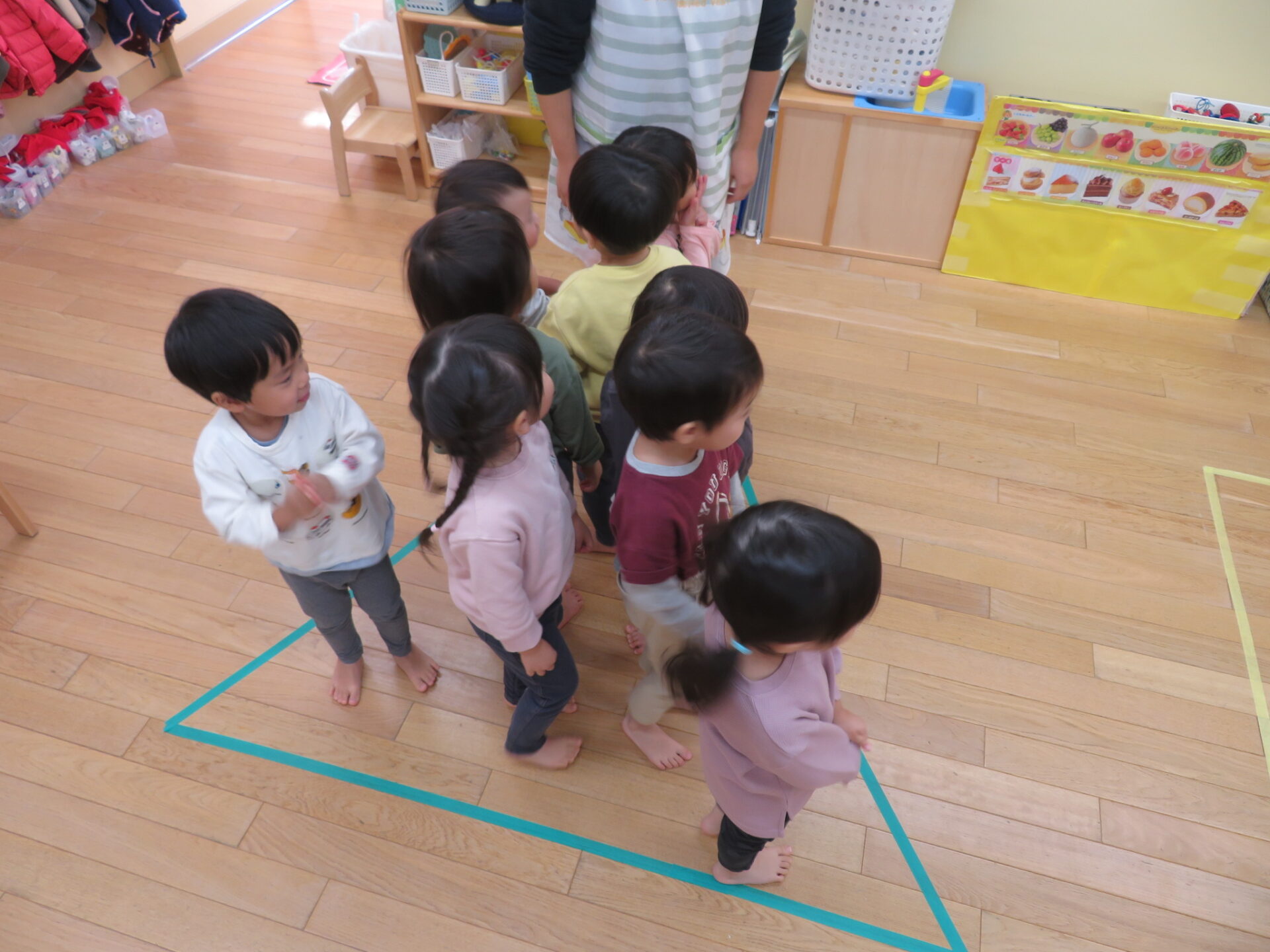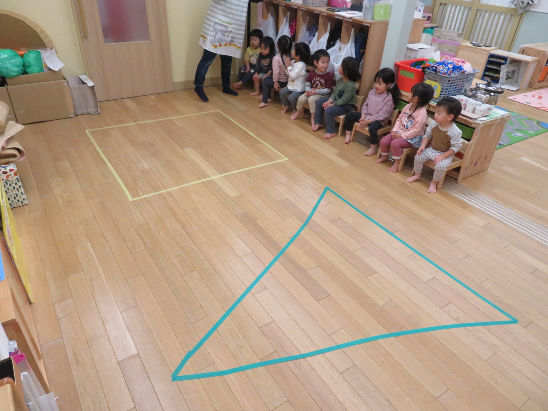 保育士がマスキングテープで床にお家を作り始めると、、「四角や」「三角?」「何してるん?」と興味を持ち思い思いに口にしていた子どもたち。今回のお家は「黄色の四角」とクリスマスにちなんで「緑の三角ツリー」の二つのお家が完成しました✨