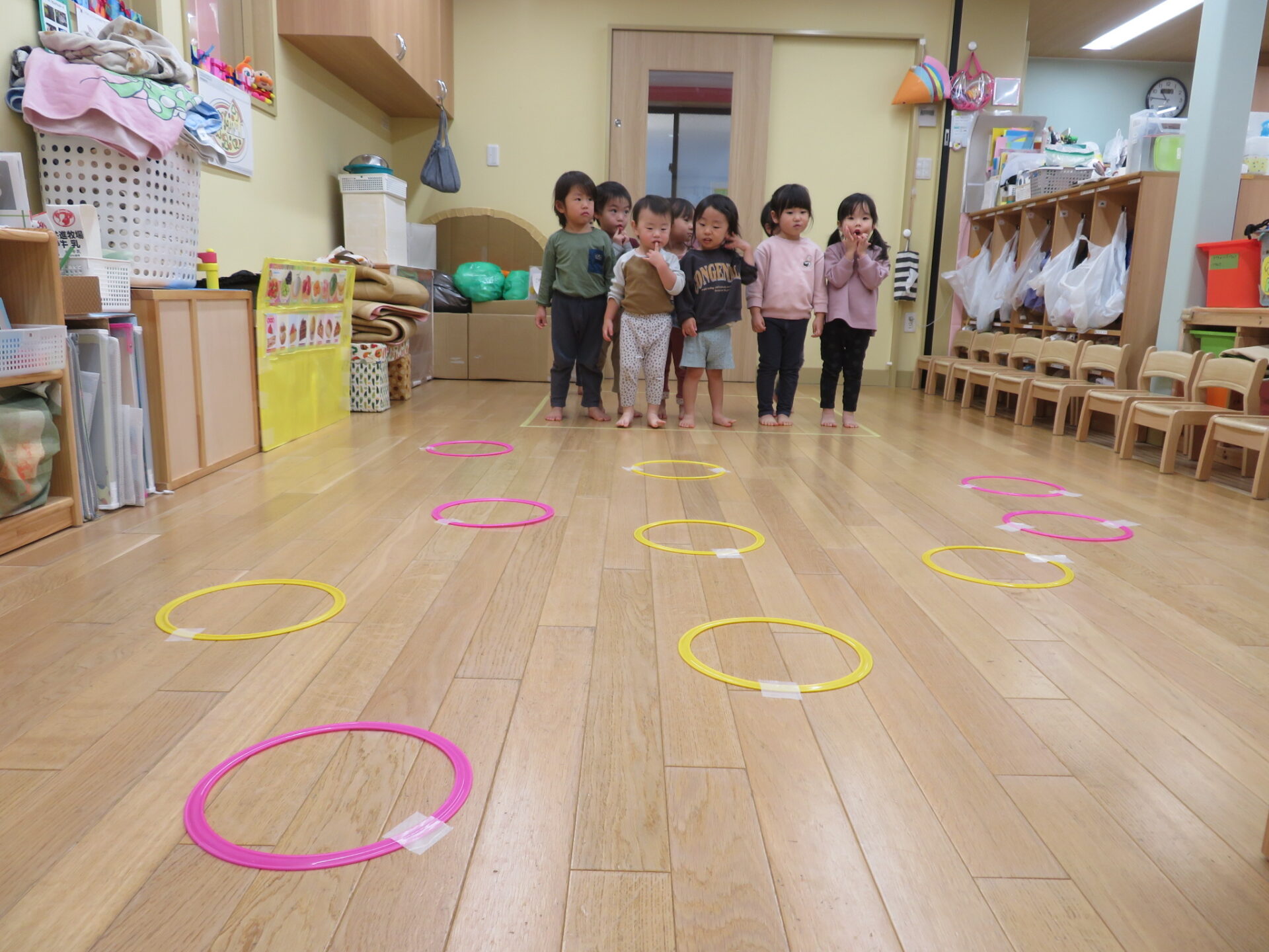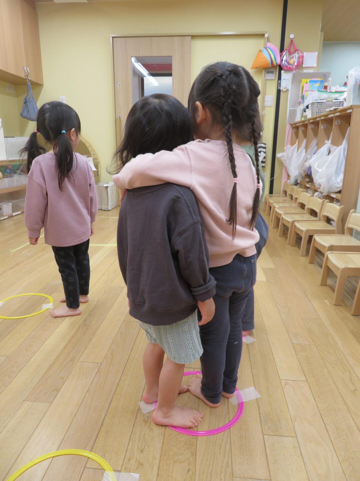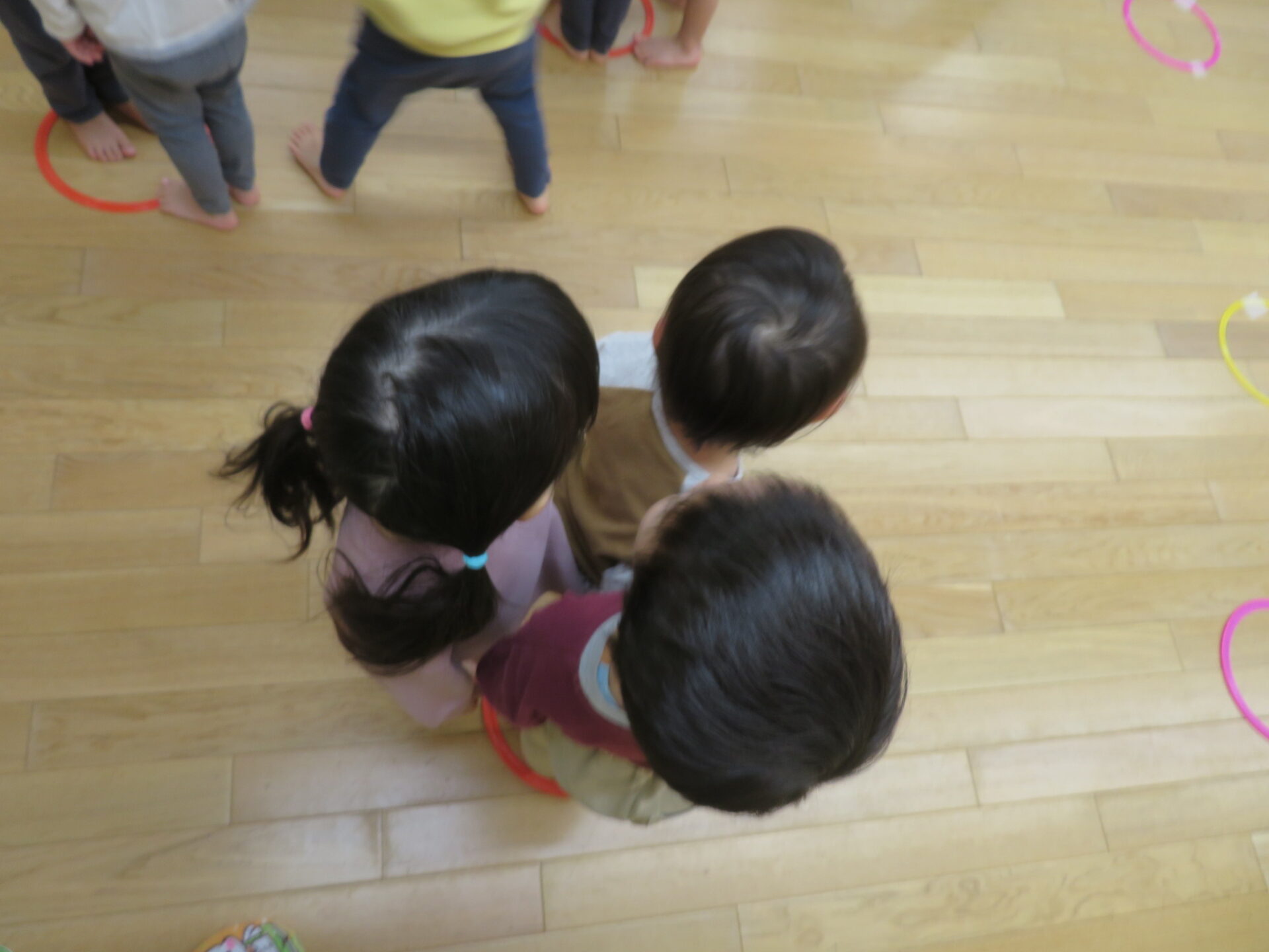 しかし、フープの数には限りがあるため一つのフープに協力して入らなければなりませんでした。どうするのかな?と子どもたちの考える瞬間を見守っていると「一緒に入ろ」「ここおいで」と手を繋いでみたり、ぎゅっと肩を組んでみたり試行錯誤して方法を生み出すことができました。